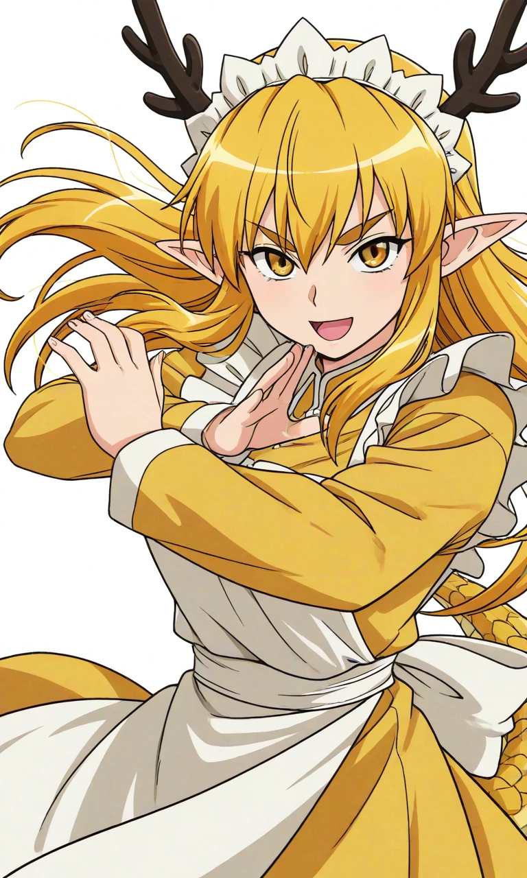 kouryuu-san,yellow eyes,blond hair,long hair,yellow dragontail,brown antlers,yellow dress,white apron,black thighhighs,brown shoes,white maid headdress
