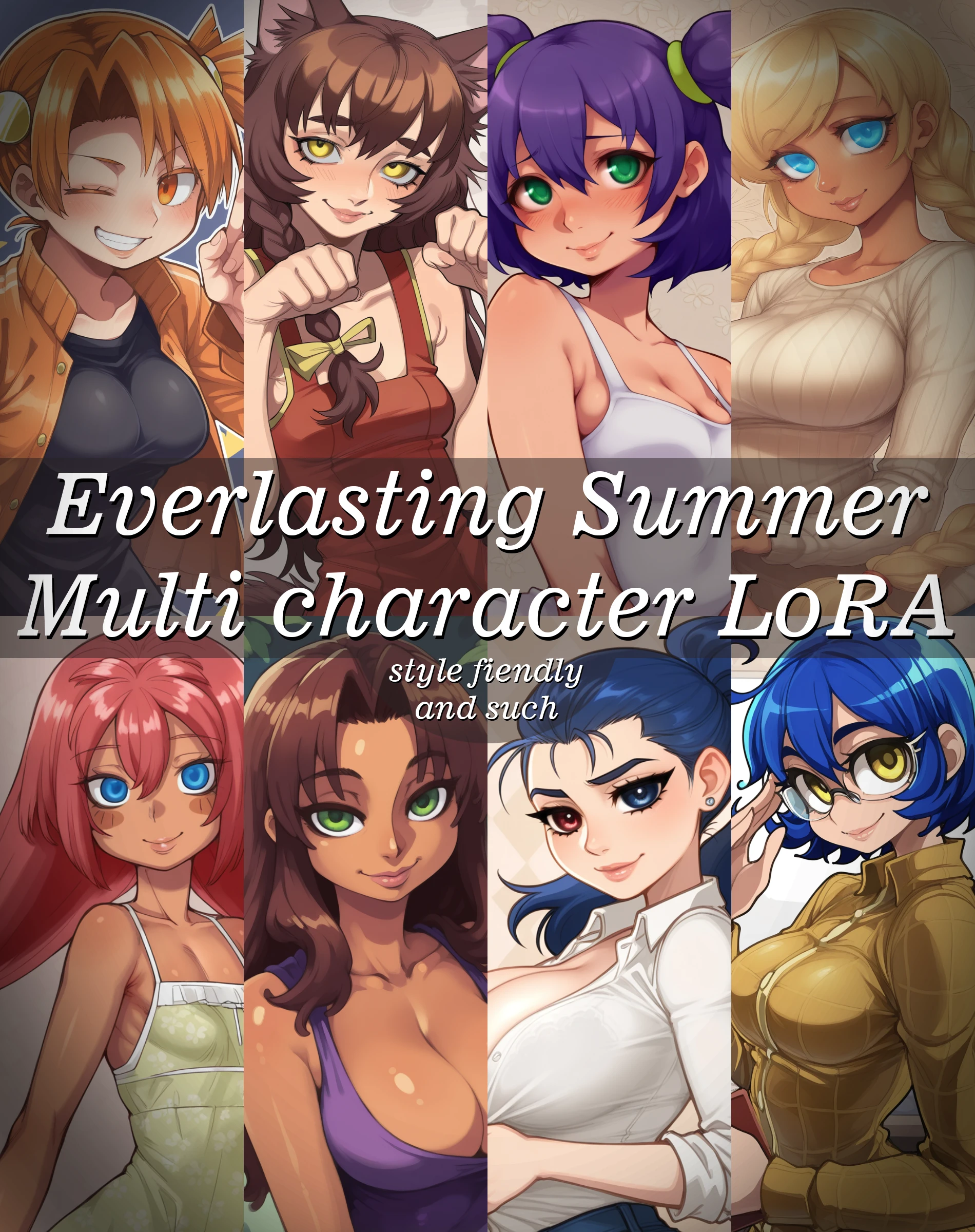 Восемь персонажей в одном. Постарался сделать так, чтобы при генерации персонажей не всплывал стиль рисовки спрайтов Бесконечного Лета, чтобы можно было смело хуячить стили тегами или лорами без ненужного блендинга непрошенного БЛовского стиля. Также вы не сможете сгенерить нормальную пионерскую форму, в датасетах ее просто не было, ебитесь как хотите, главное - непублично.