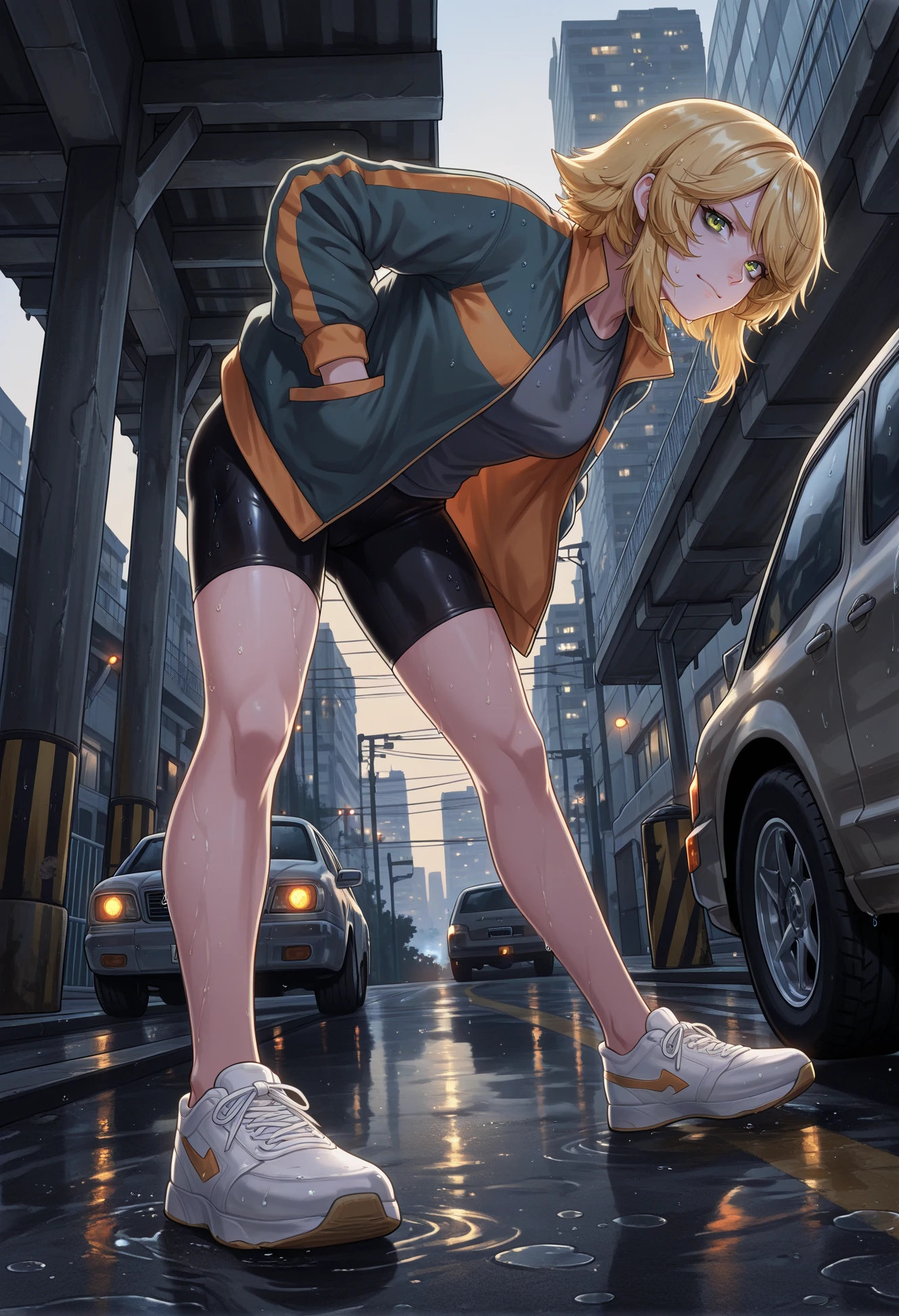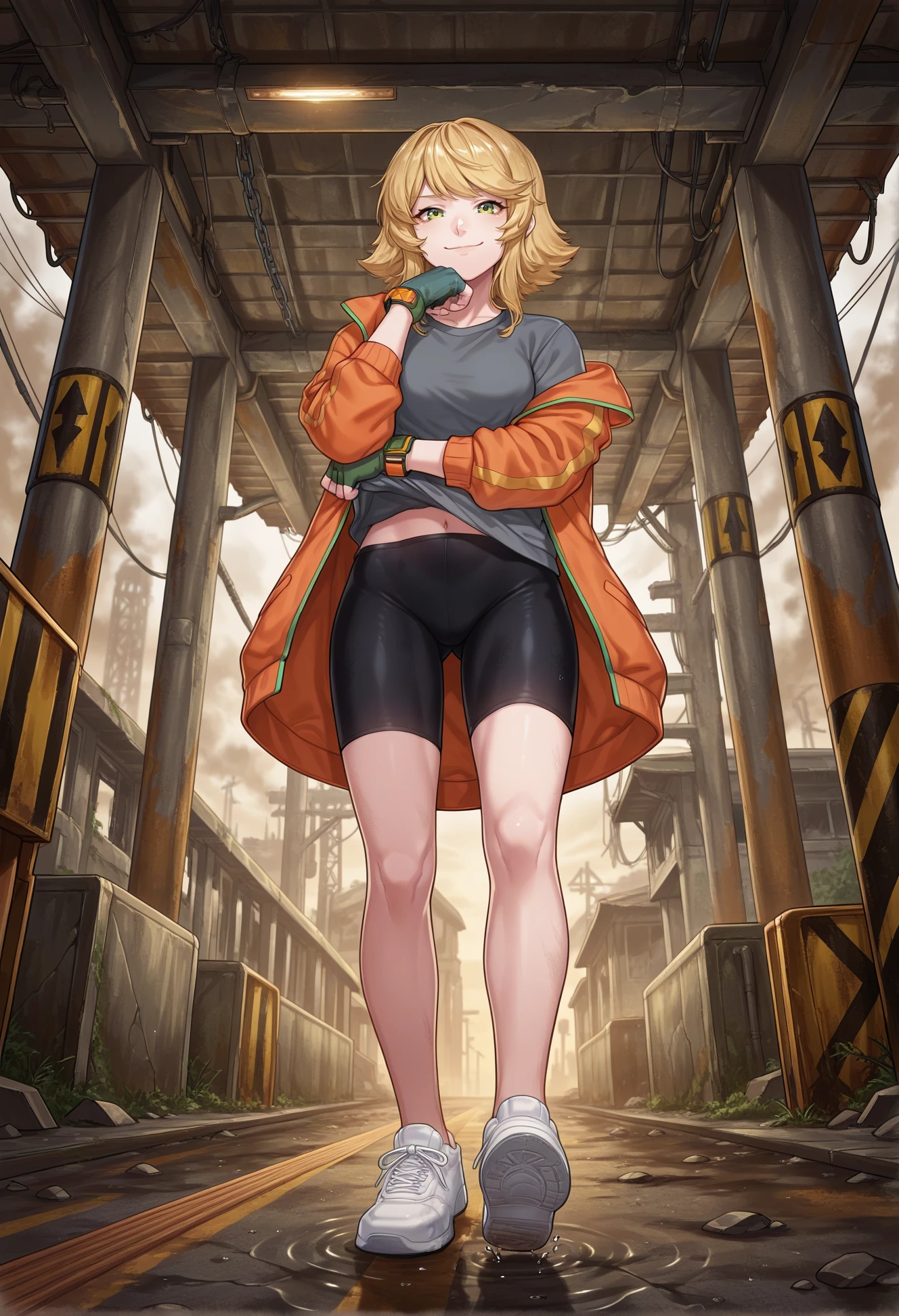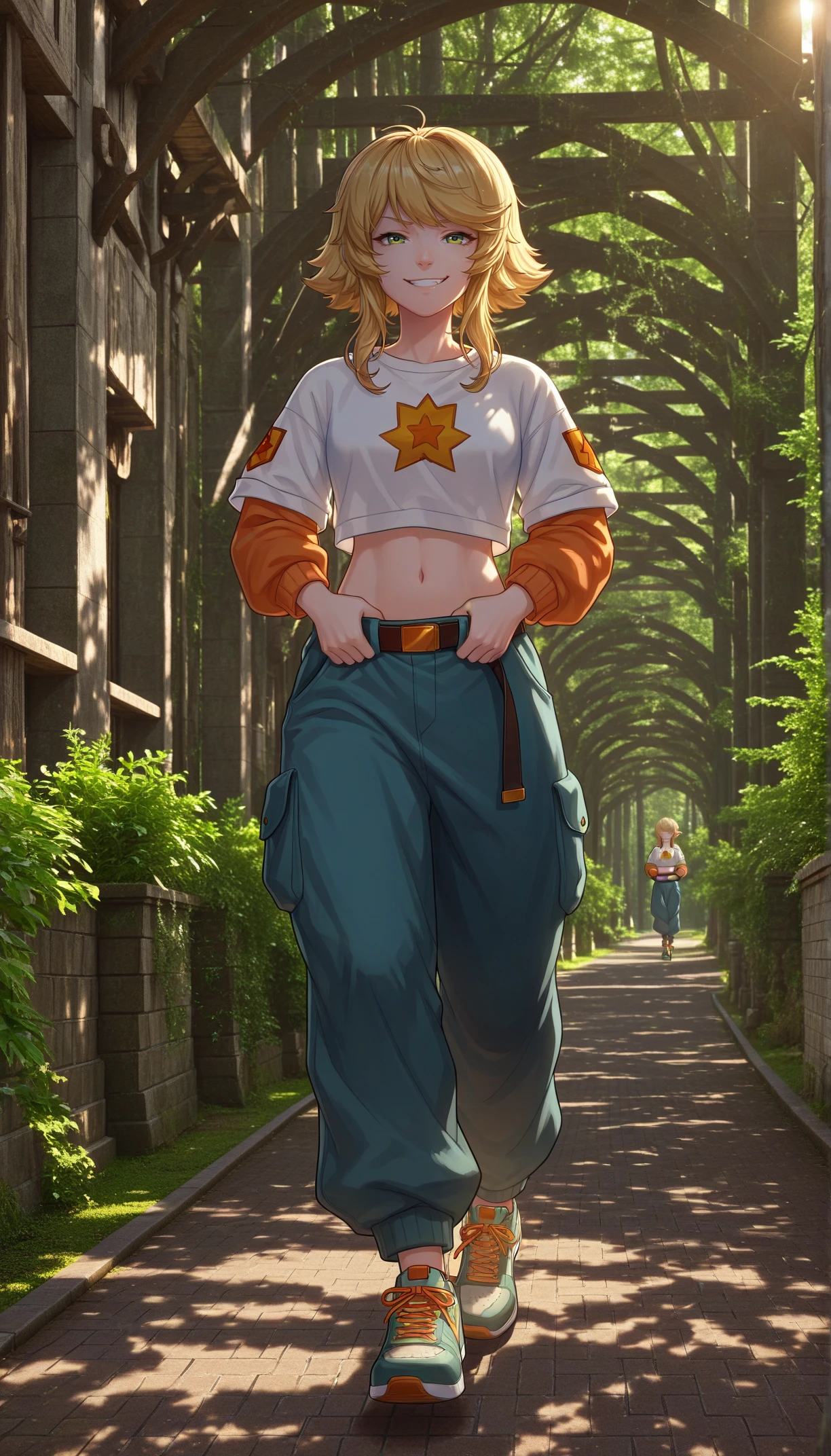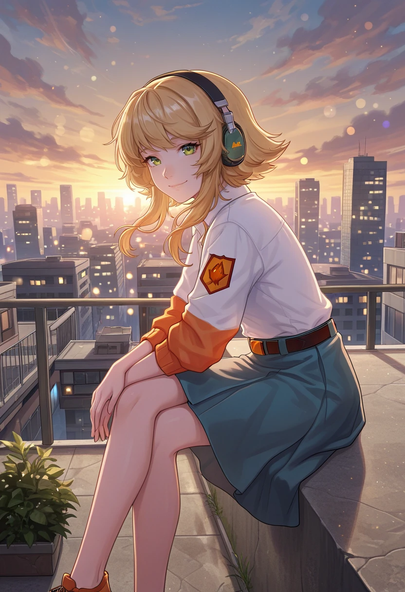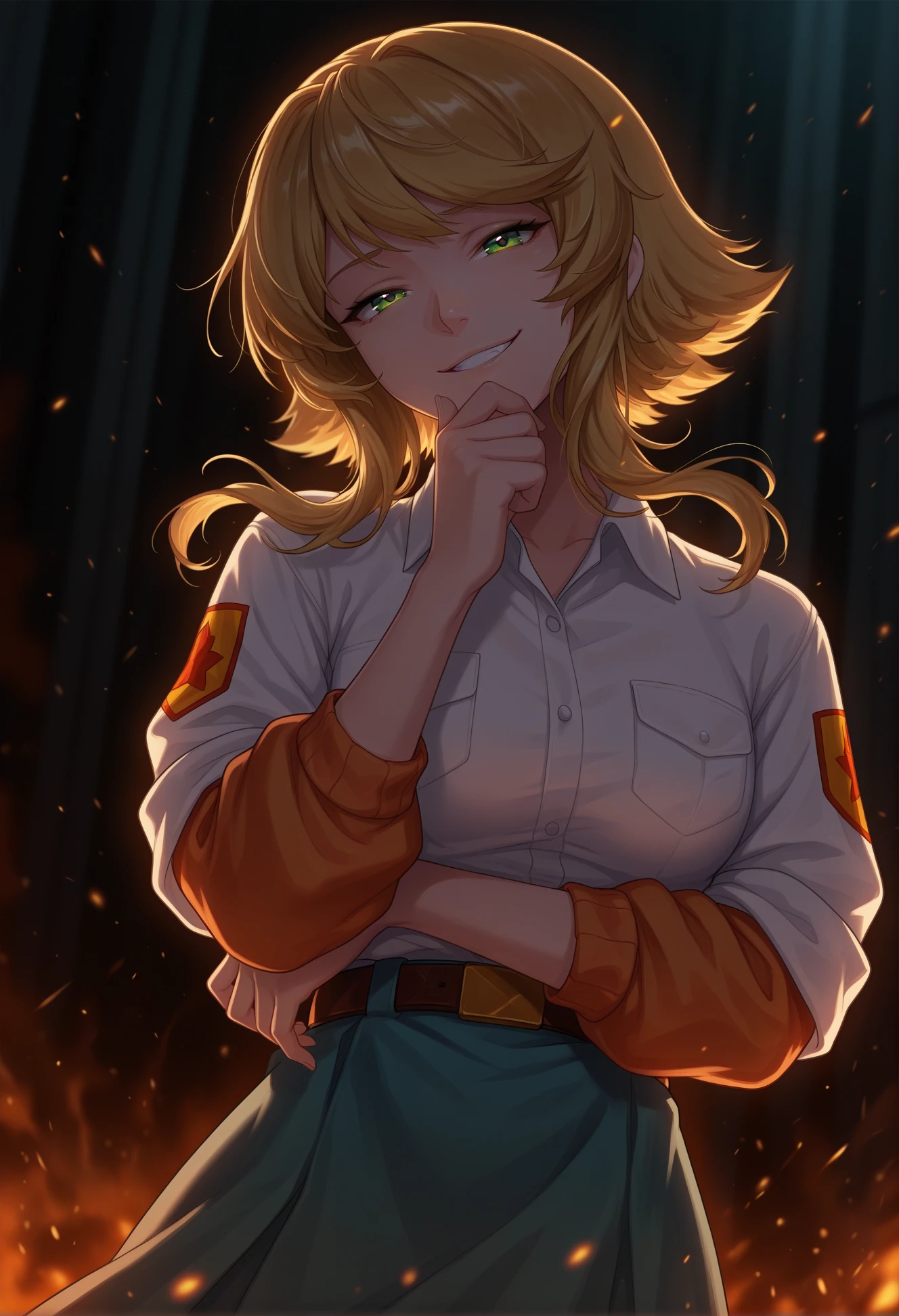 SvetikBLT, 1girl, solo, looking at viewer, short hair, bangs, skirt, blonde hair, shirt, shoulder patch, long sleeves, white shirt, green eyes, collared shirt, belt, medium hair, lips, blue skirt, shirt tucked in, hair twirling, playing with own hair, layered sleeves, two-tone sleeves