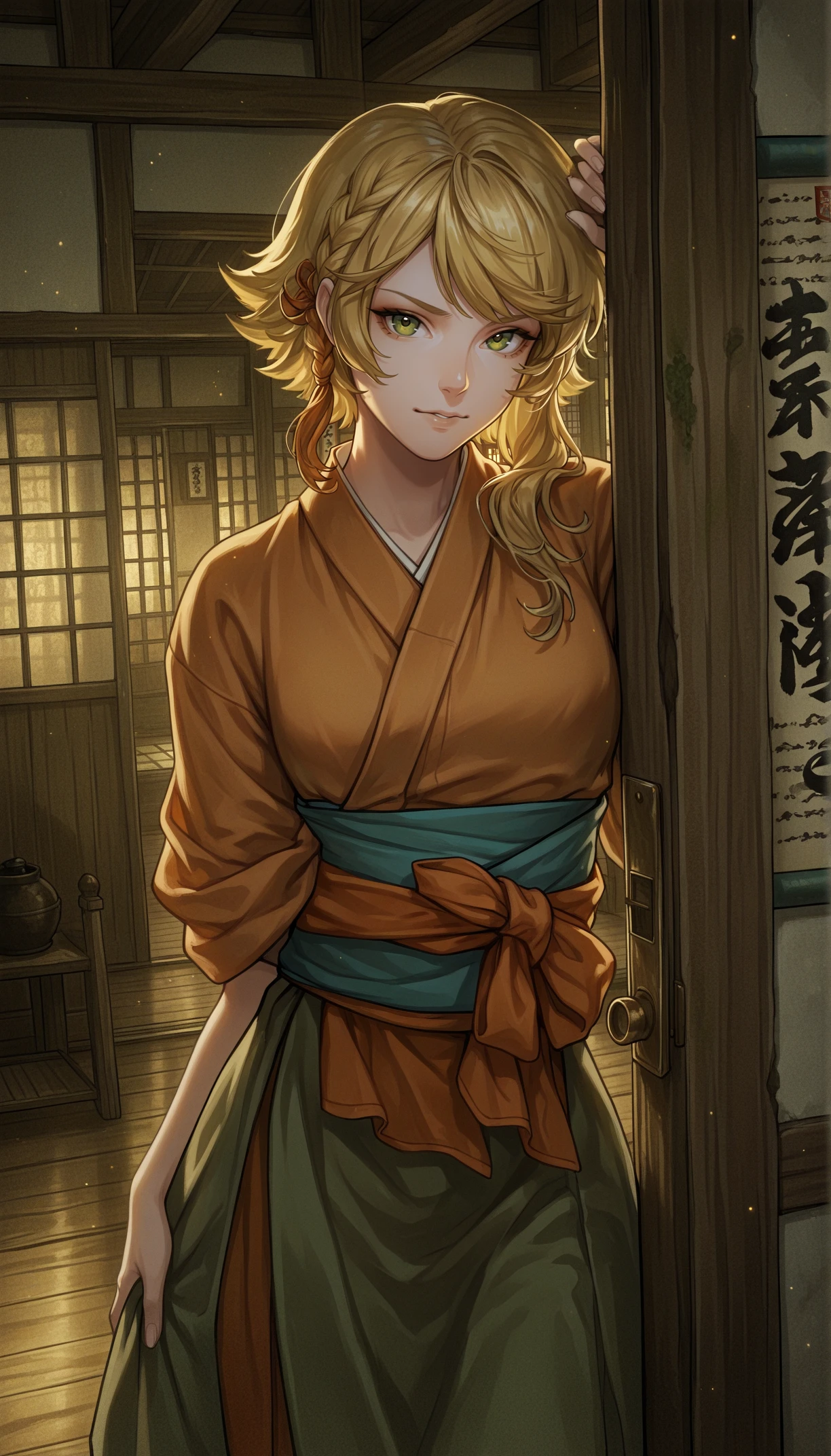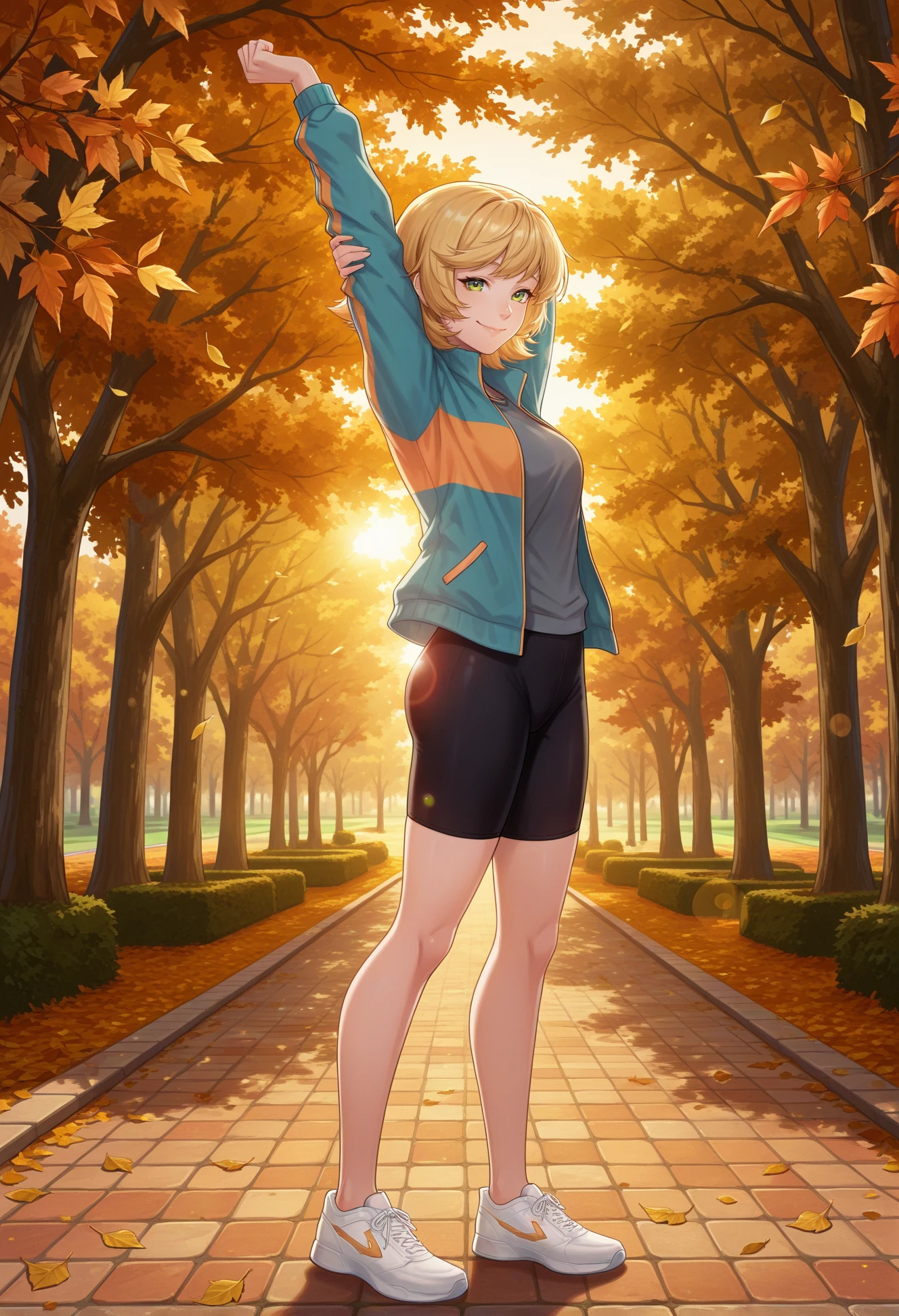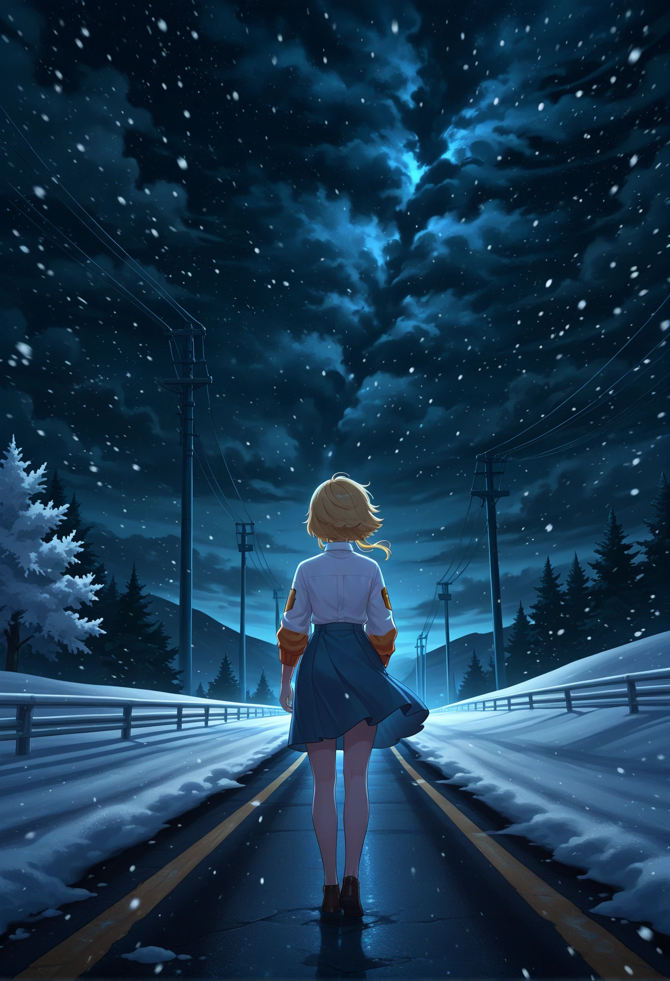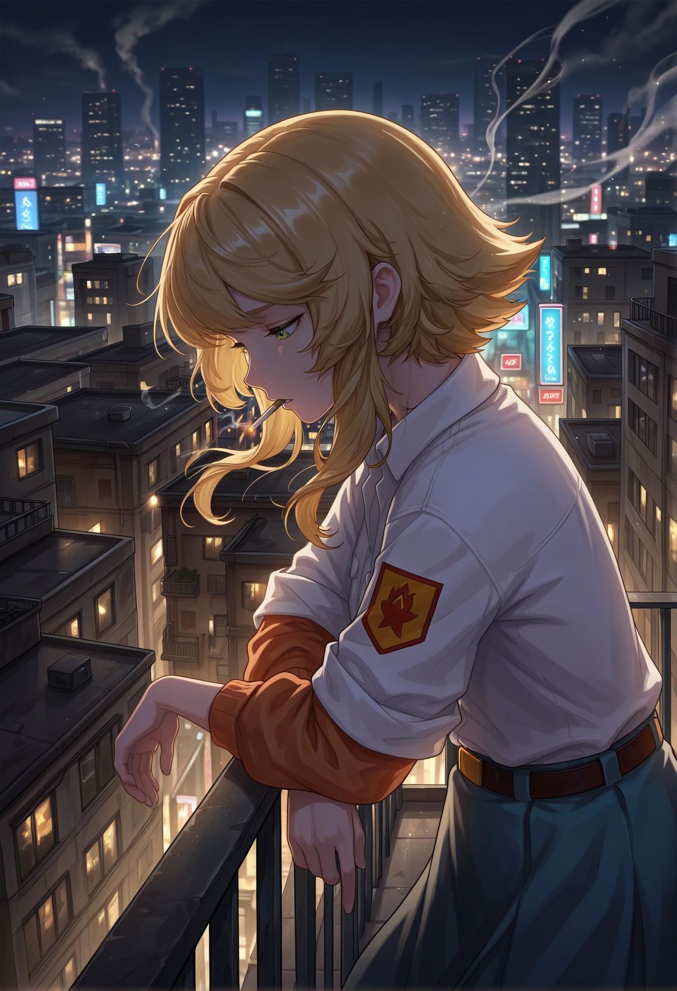 SvetikBLT, 1girl, solo, looking at viewer, short hair, bangs, skirt, blonde hair, shirt, shoulder patch, long sleeves, white shirt, green eyes, collared shirt, belt, medium hair, lips, blue skirt, shirt tucked in, hair twirling, playing with own hair, layered sleeves, two-tone sleeves