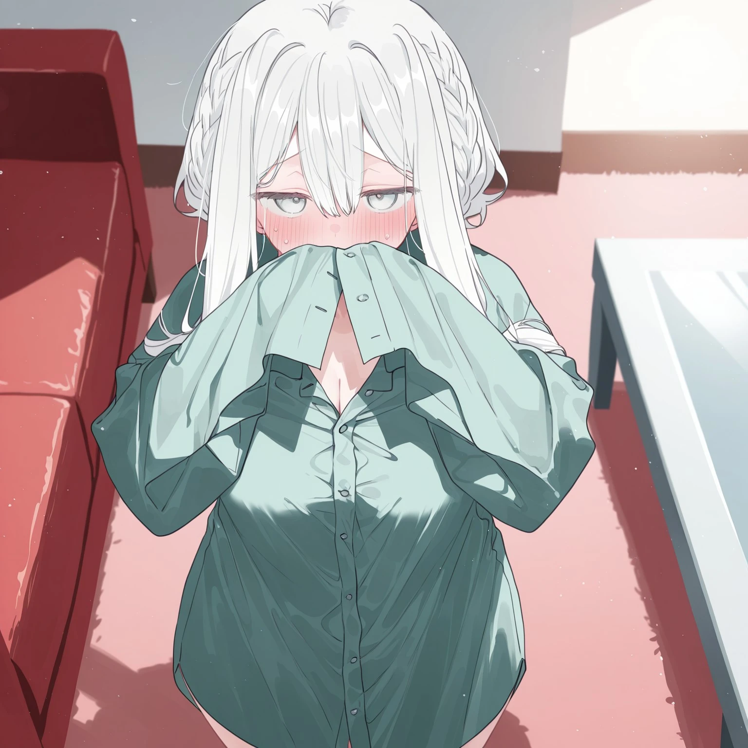 kagarill, grey eyes, white hair, 1girl, braid, sidelocks, hair between eyes, breasts, kagariborr, borrowed clothes, green shirt, oversized shirt, buttons