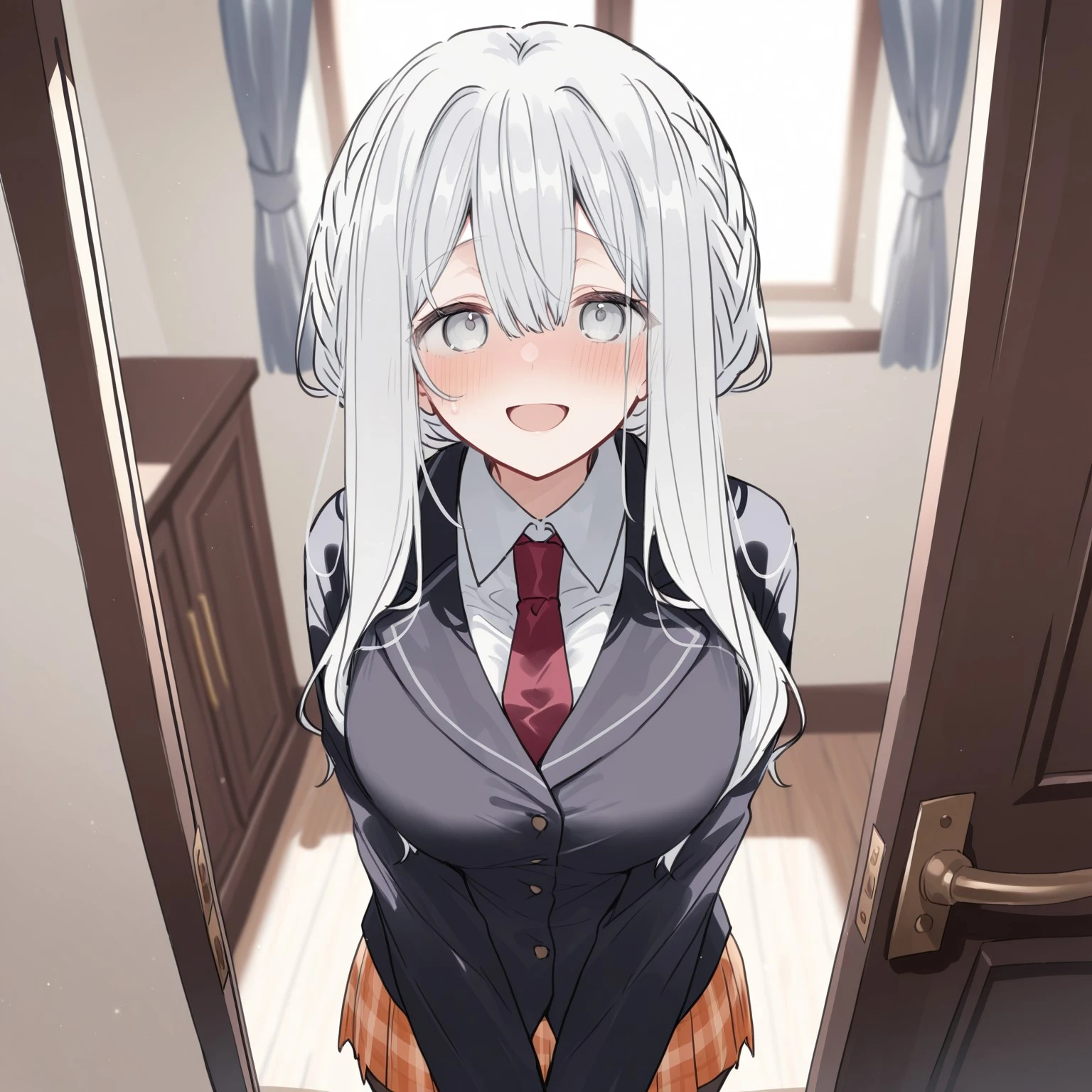 kagarill, grey eyes, white hair, 1girl, braid, hair between eyes, sidelocks, breasts, kagarisch, school uniform, shirt, skirt, plaid skirt, necktie, blazer, collared shirt, long sleeves, pantyhose, white shirt, orange skirt, red necktie, black blazer, black pantyhose
