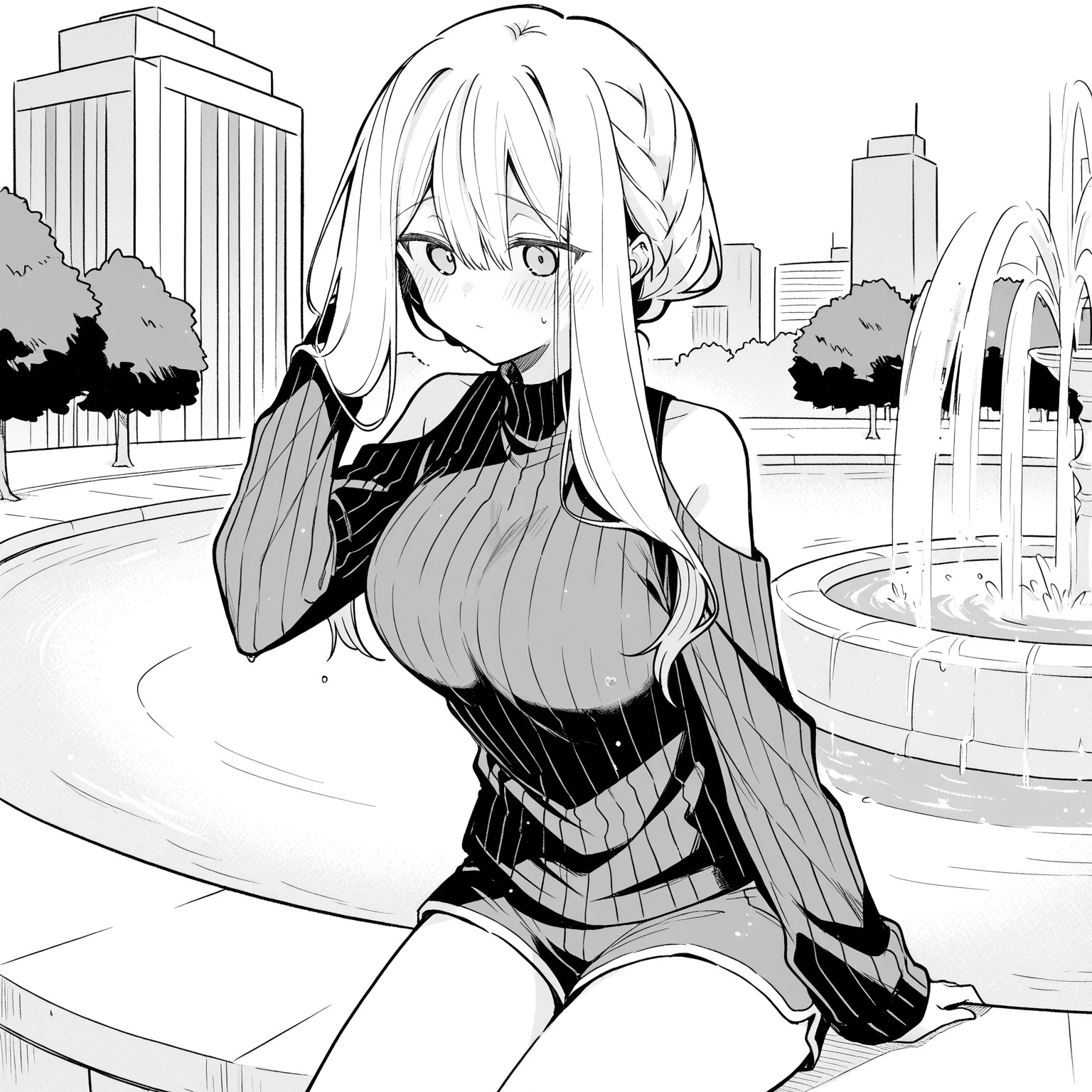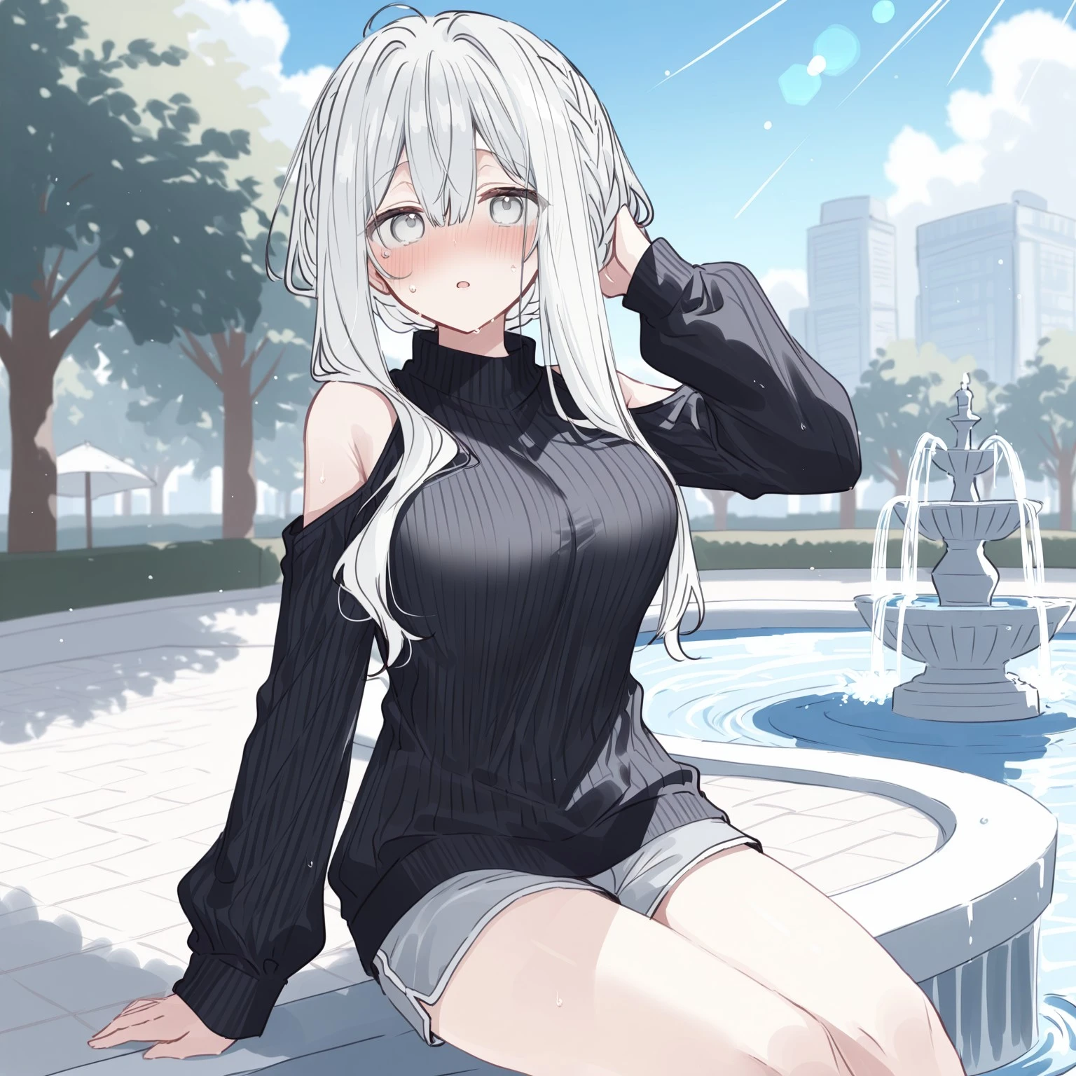 kagarill, grey eyes, white hair, 1girl, braid, hair between eyes, sidelocks, breasts, casual1, long sleeves, shorts, ribbed sweater, black sweater, grey shorts, short shorts, shoulder cutout