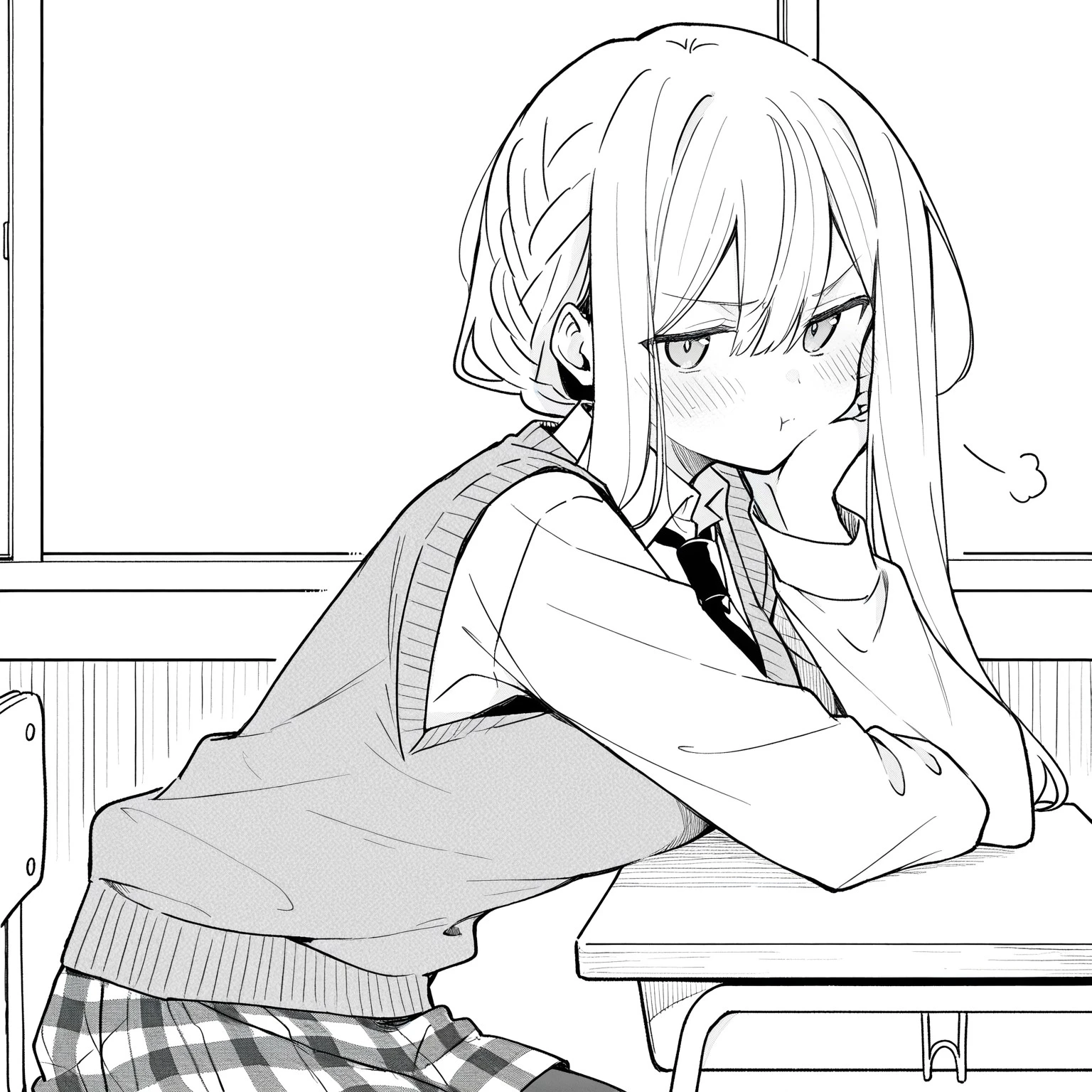 kagarimng, 1girl, braid, hair between eyes, sidelocks, breasts, kagarisch2, grey sweater, sweater vest, layered sleeves, school uniform, shirt, skirt, plaid skirt, necktie, collared shirt, long sleeved shirt, pantyhose