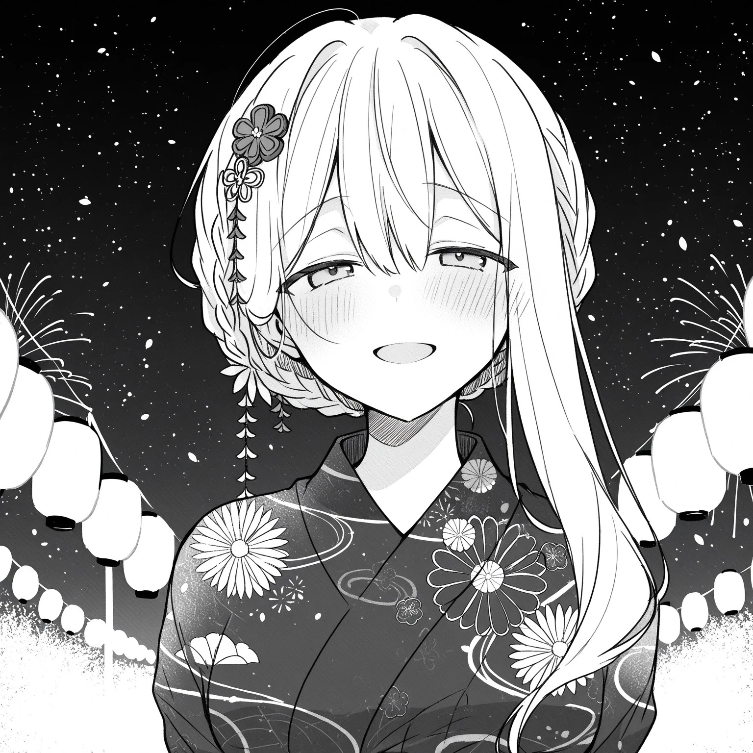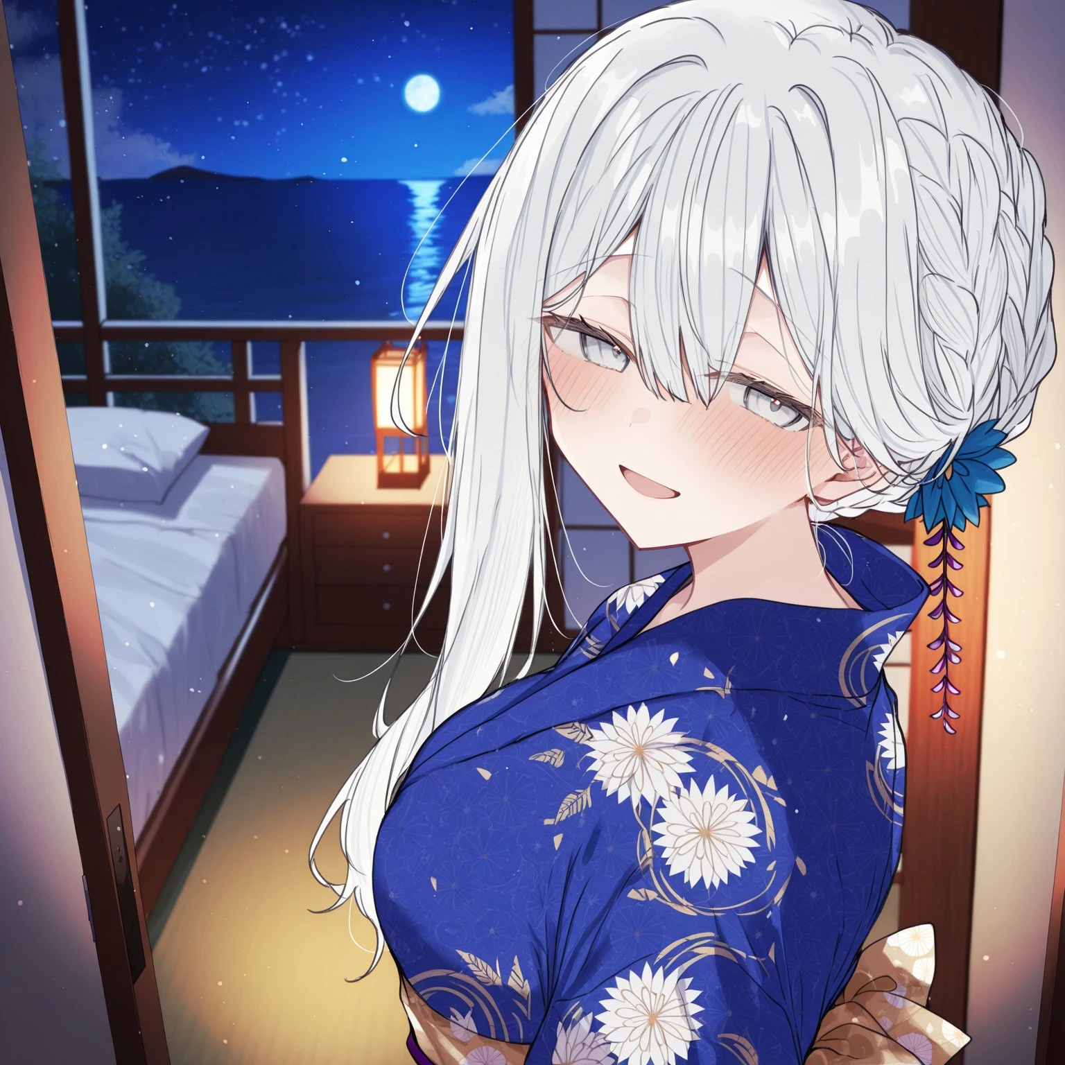 kagarill, grey eyes, white hair, 1girl, braid, , hair between eyes, breasts, kagariyk, single hair lock, japanese clothes, hair hornament, floral print kimono, blue kimono, sash