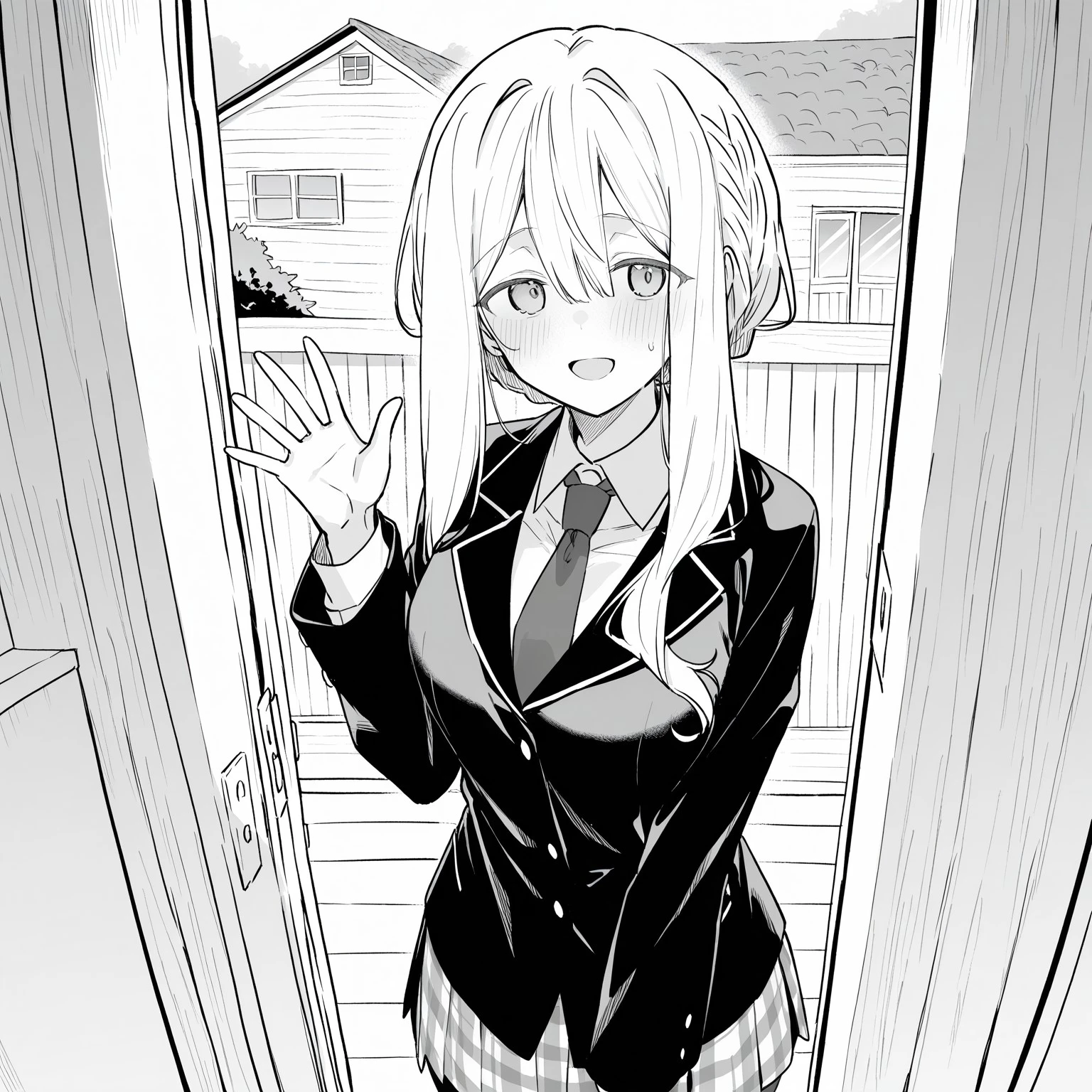 kagarimng, 1girl, braid, hair between eyes, sidelocks, breasts, kagarisch, school uniform, shirt, skirt, plaid skirt, necktie, blazer, collared shirt, long sleeves, pantyhose