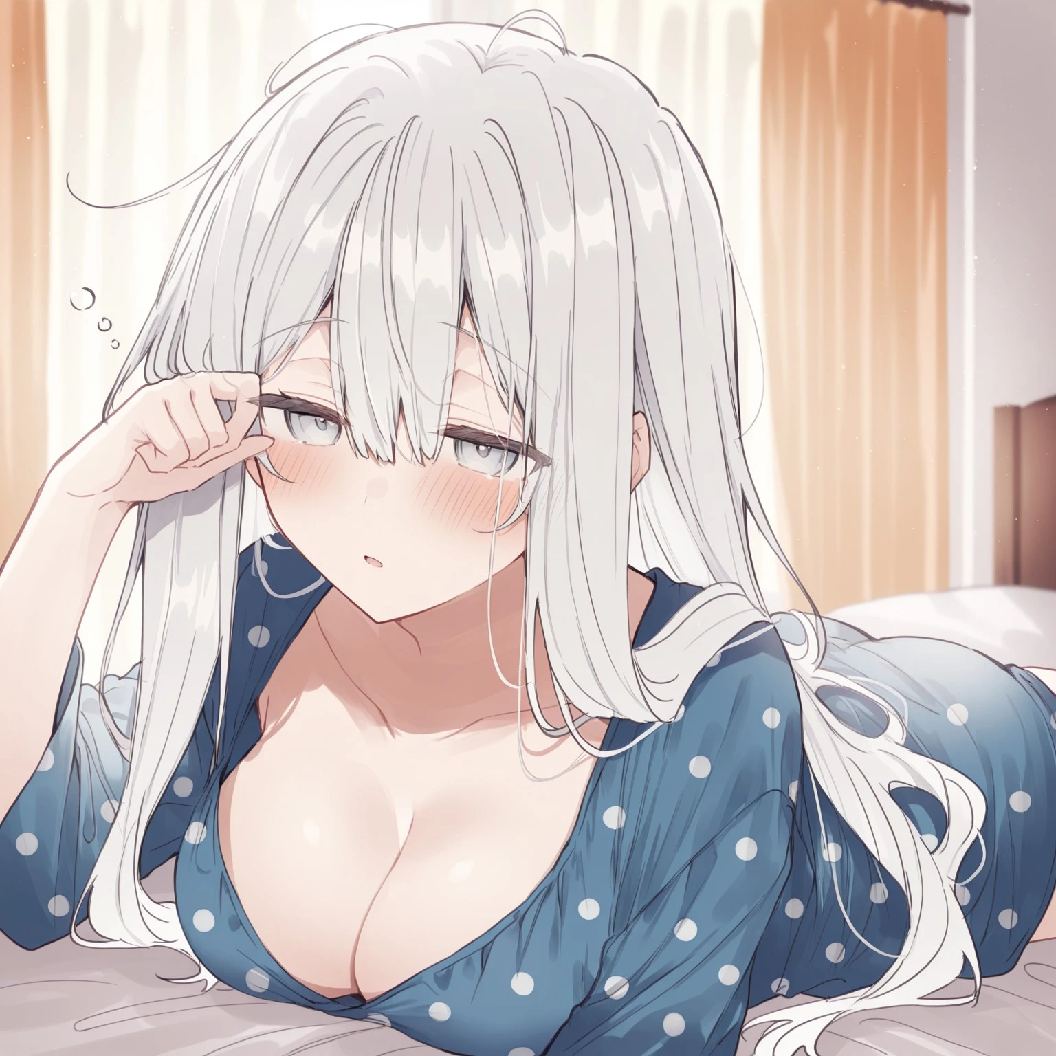 kagarill, grey eyes, white hair, 1girl, long hair, hair between eyes, breasts, kagaripij, polka dot shirt, blue shirt, white dots, cleavage