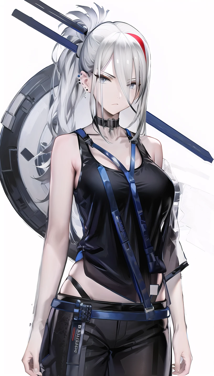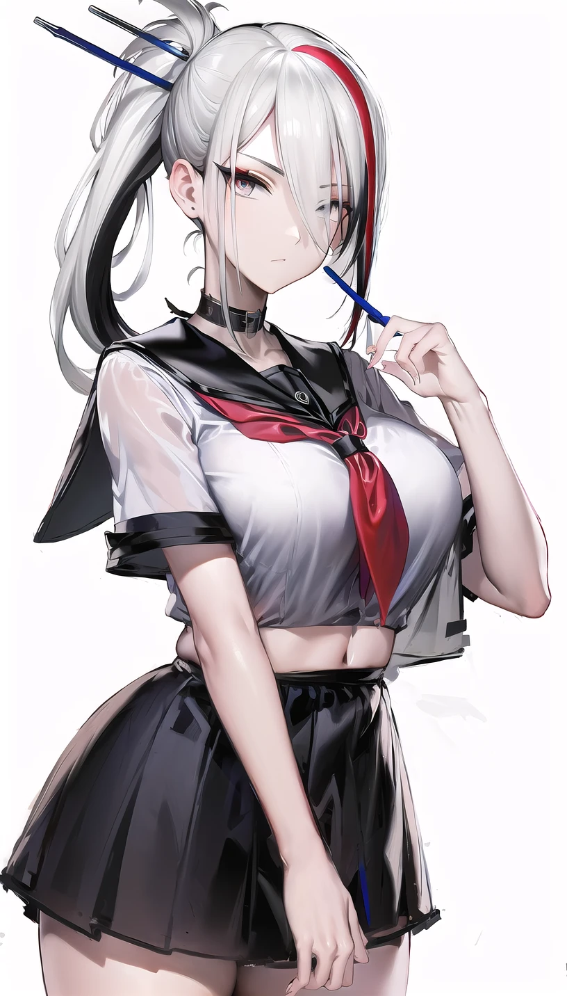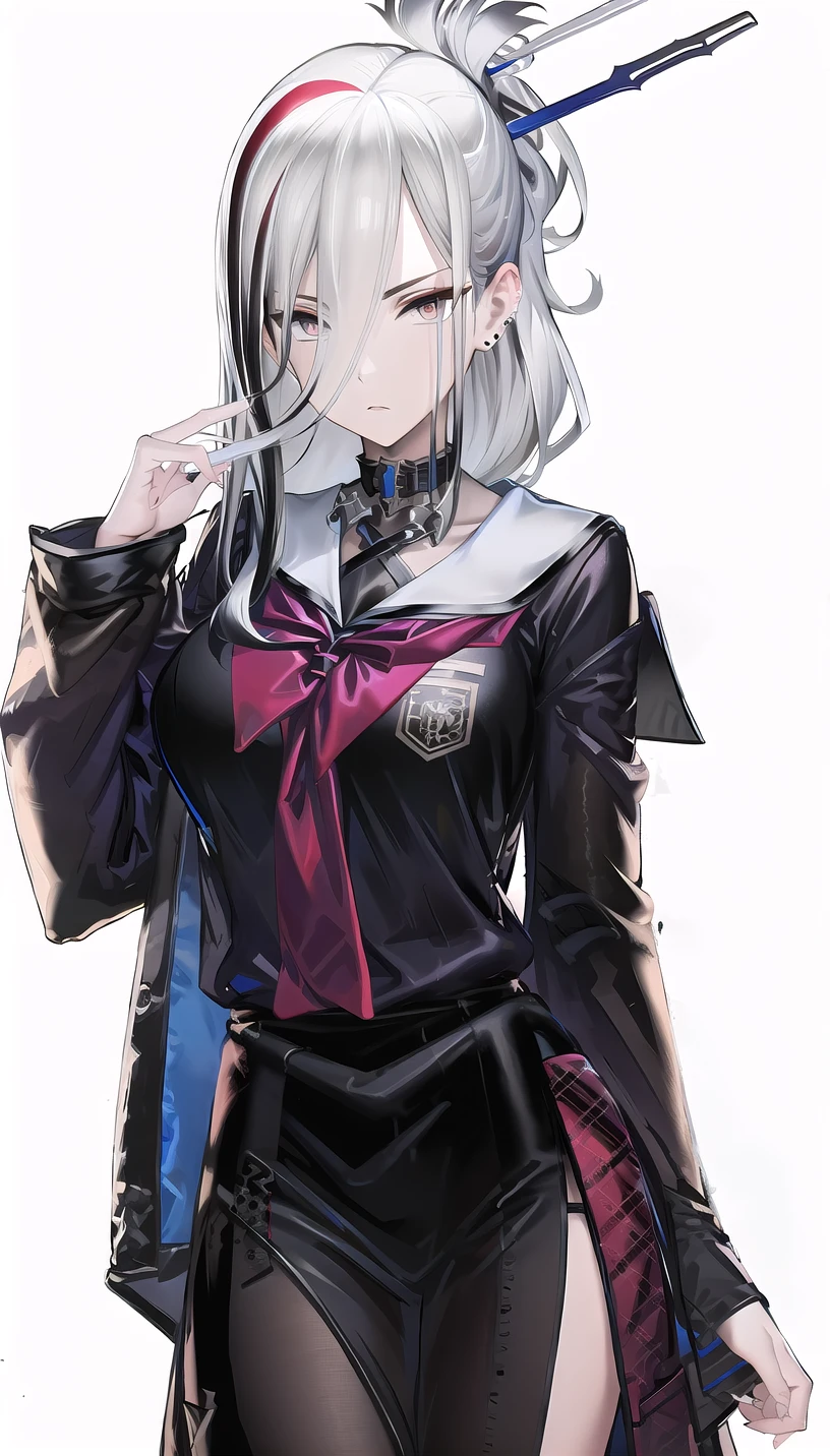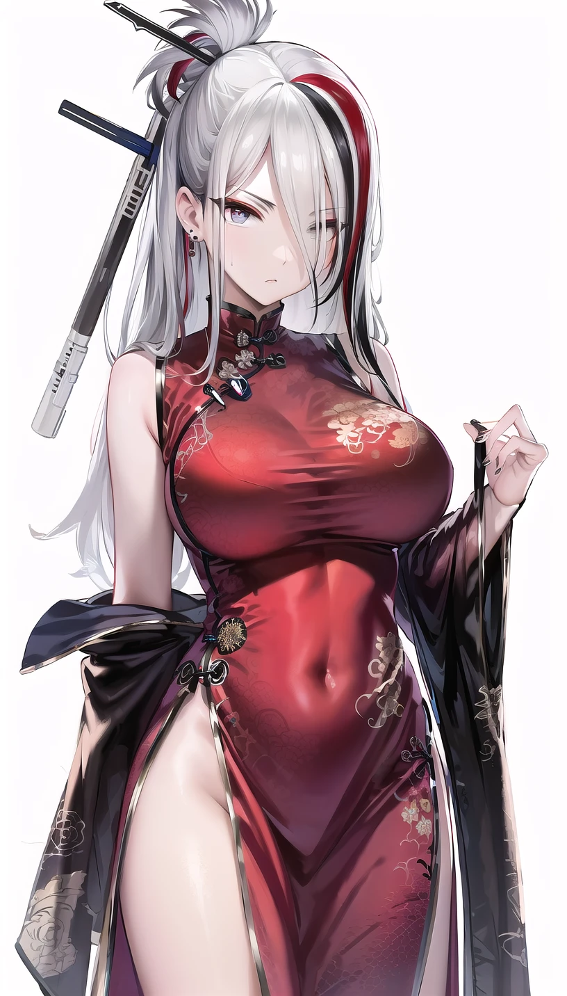 hair stick, red mascara,streaked hair,