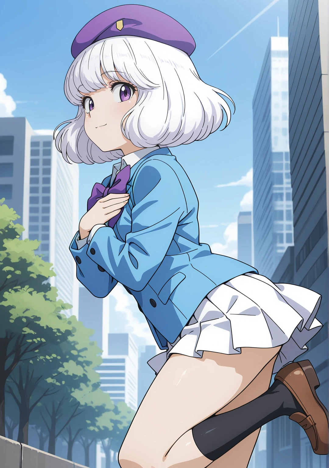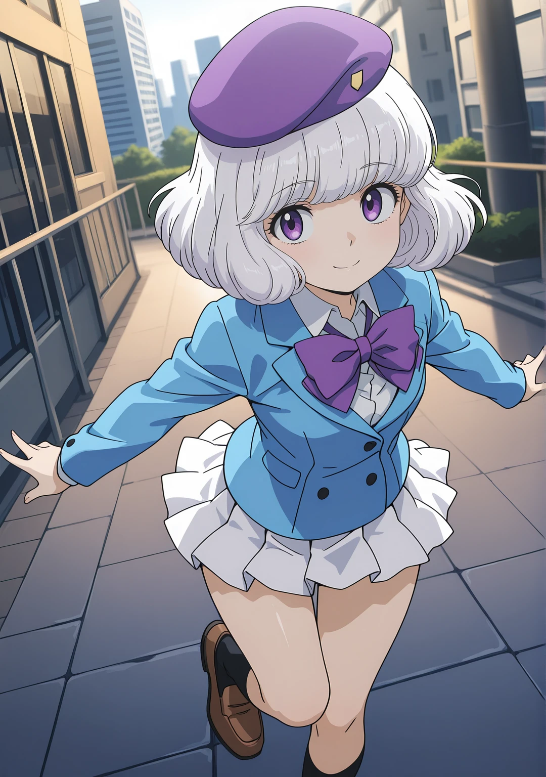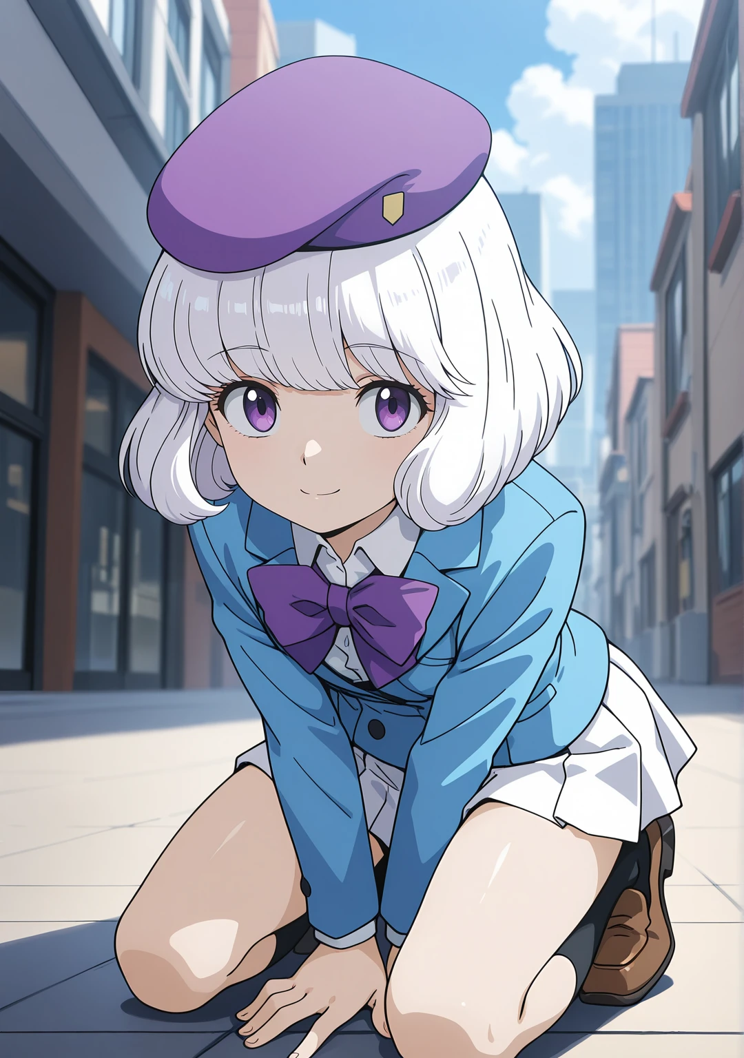 recommend:white hair,purple eyes,school uniform,short hair,medium hair,blazer,blue jacket,collared shirt,white shirt,purple bowtie,miniskirt,pleated skirt,white skirt,black socks,loafers, brown footwear,beret,purple headwear,long sleeves,