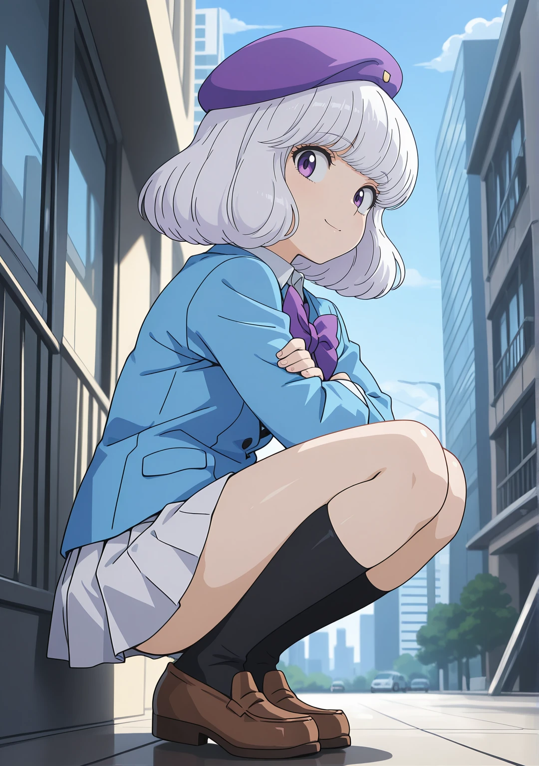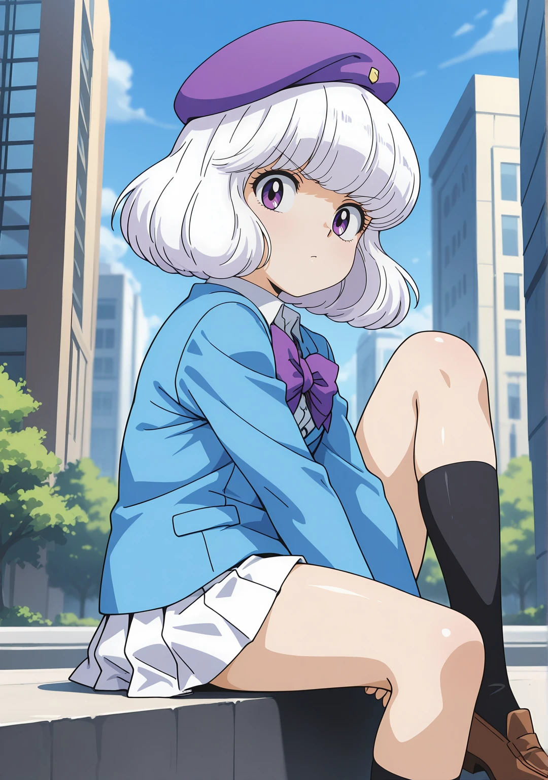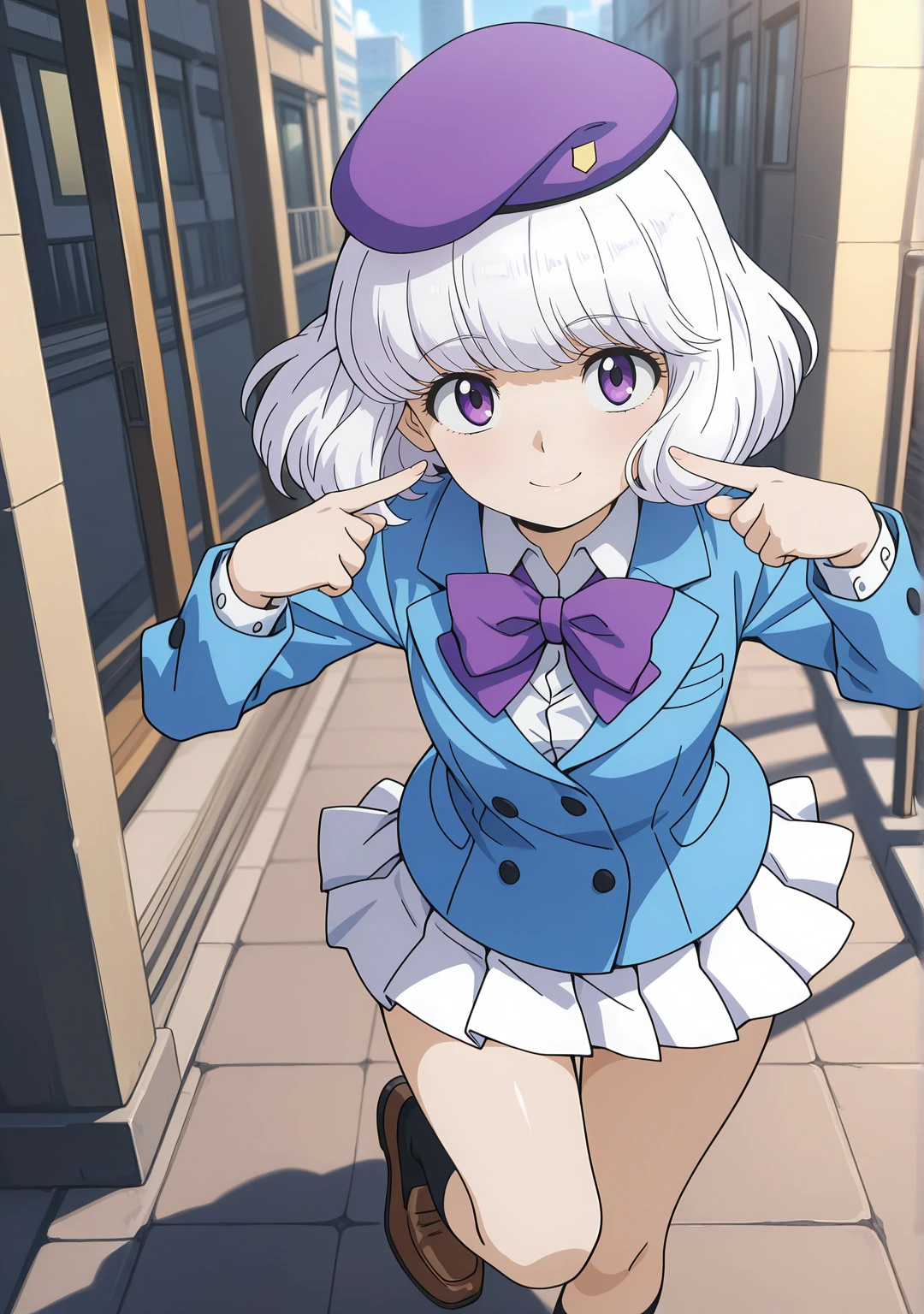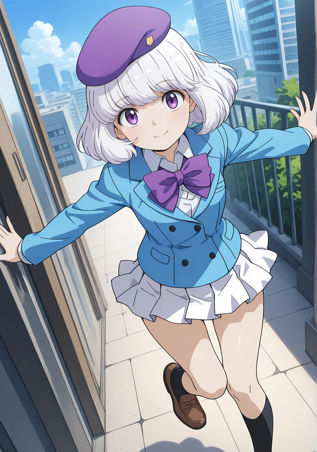 recommend:white hair,purple eyes,school uniform,short hair,medium hair,blazer,blue jacket,collared shirt,white shirt,purple bowtie,miniskirt,pleated skirt,white skirt,black socks,loafers, brown footwear,beret,purple headwear,long sleeves,