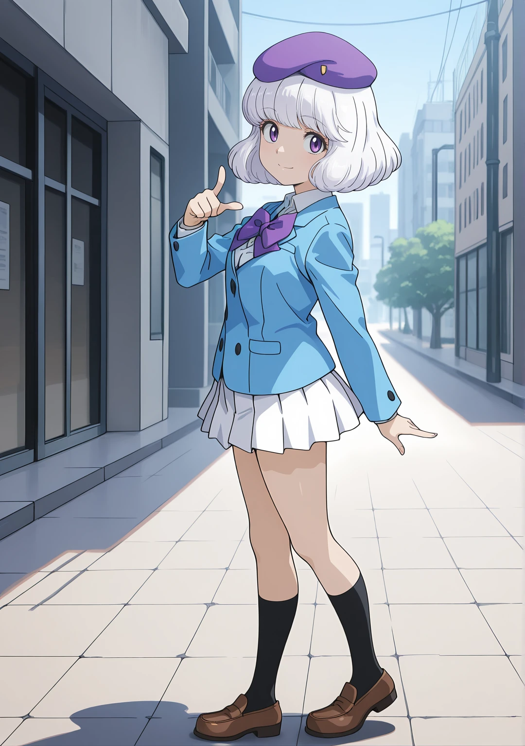 white hair,purple eyes,school uniform,short hair,medium hair,blazer,blue jacket,collared shirt,white shirt,purple bowtie,miniskirt,pleated skirt,white skirt,black socks,loafers, brown footwear,beret,purple headwear,long sleeves,