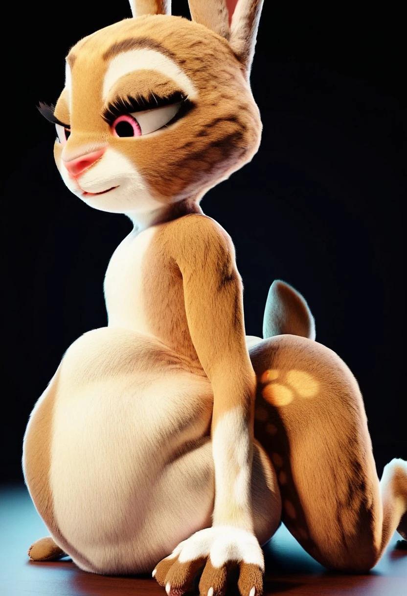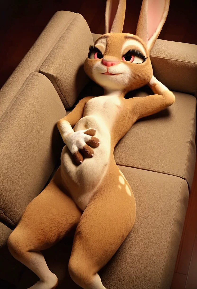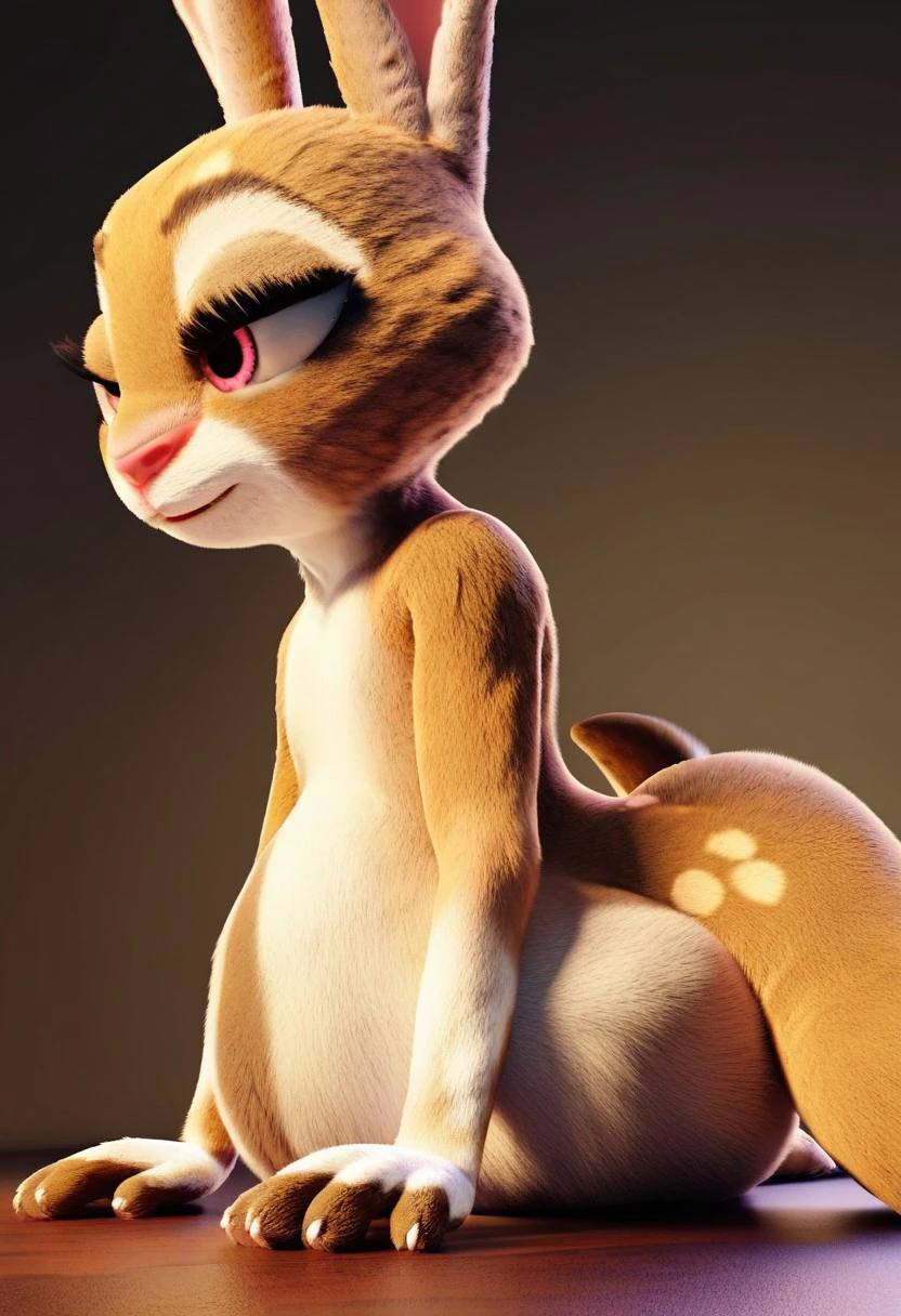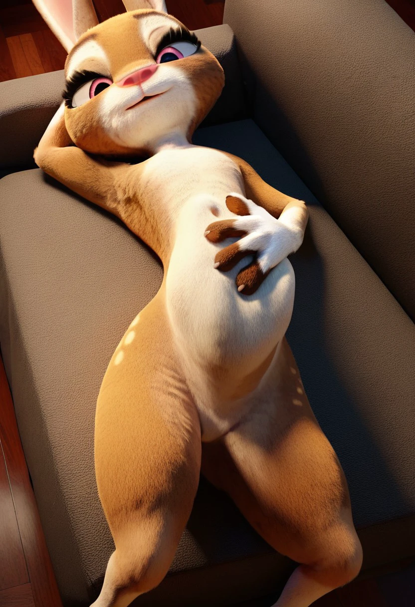 furry, bunny, anthro, two-colored fur, beige fur, white underbelly, skinny, solo, bunny ears, pink nose, pink pupils, 1girl,female, flat chest, two-tone fur, nude