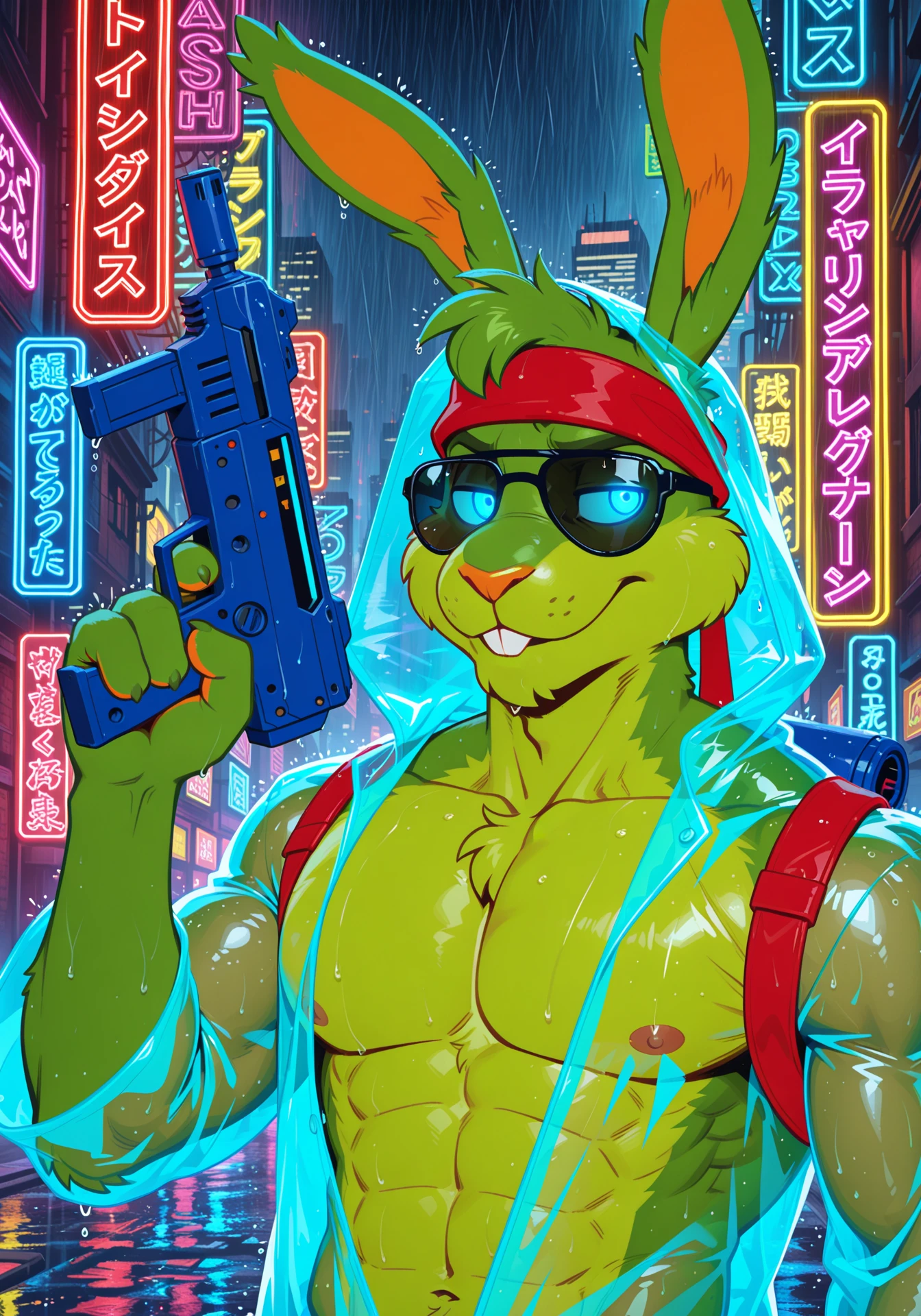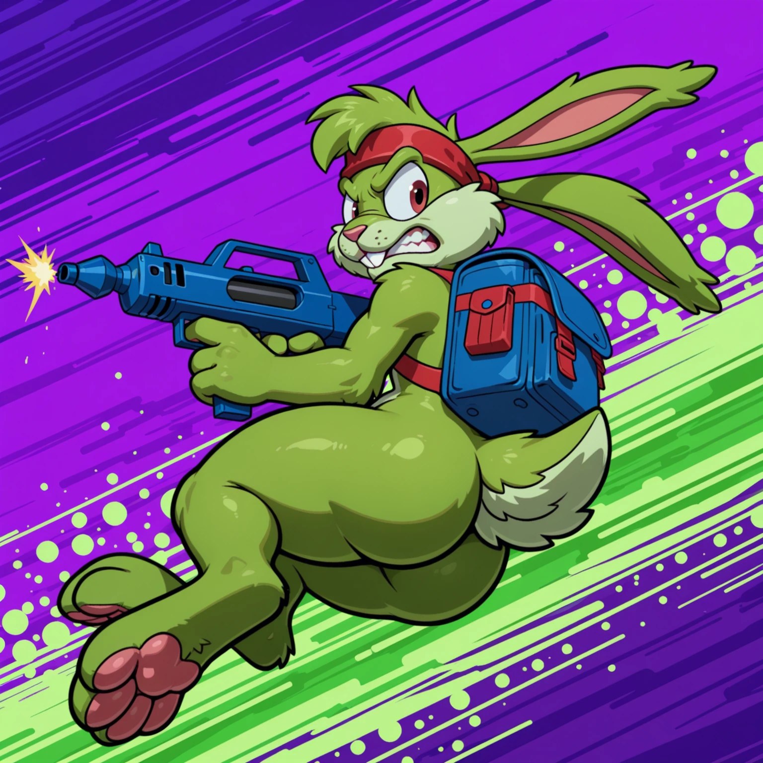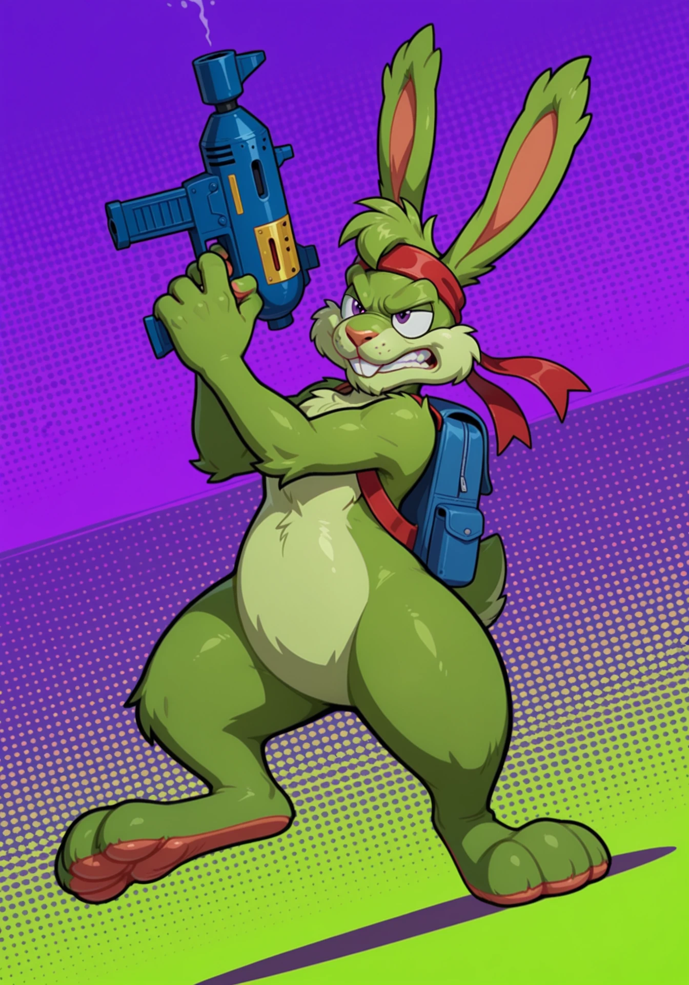 jazz jackrabbit, solo, semi-anthro, male, green body, green fur, monotone body, blue eyes, buckteeth, 4 fingers, holding gun, blue gun, blue backpack, red straps, red headband, wristband,optionally: