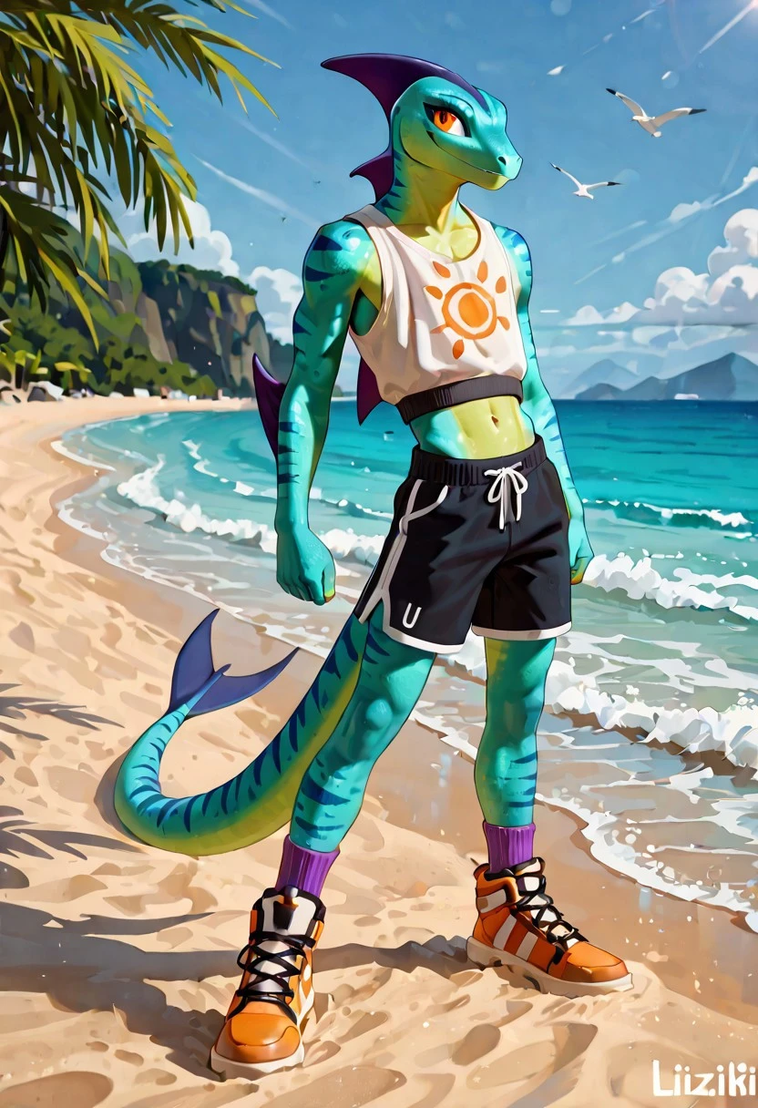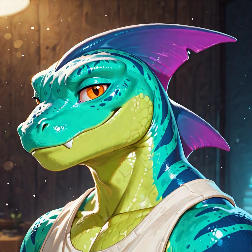 blue and green skin, orange eyes, purple dorsal fin