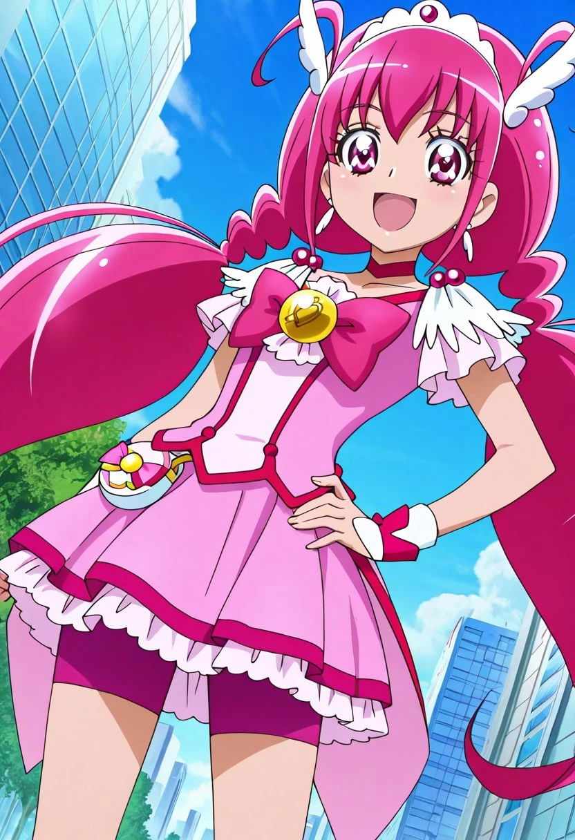 Cure Happy,pink_hair, very_long_twintails, hair_ornaments, pink eyes, huge_breasts, ahoge,