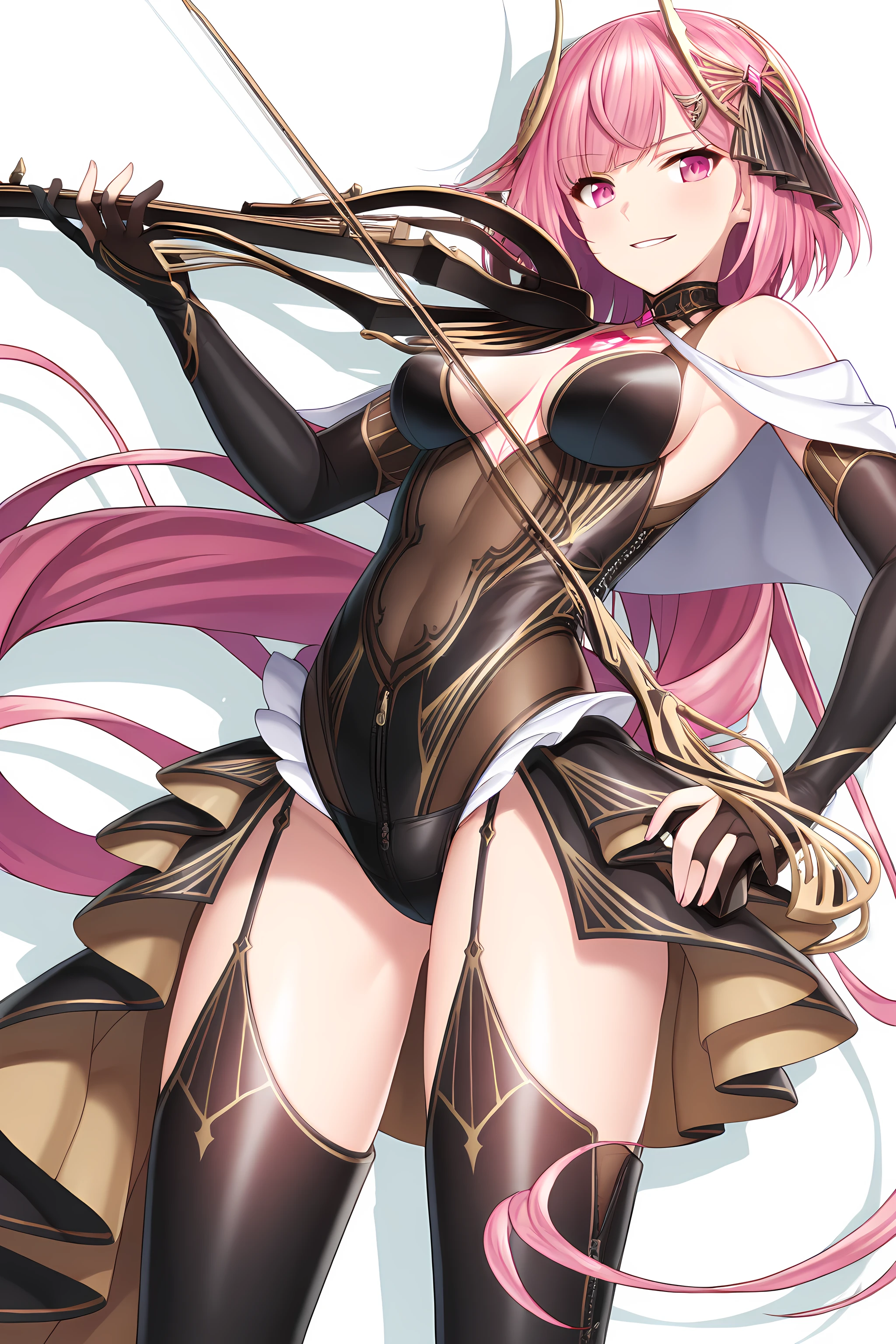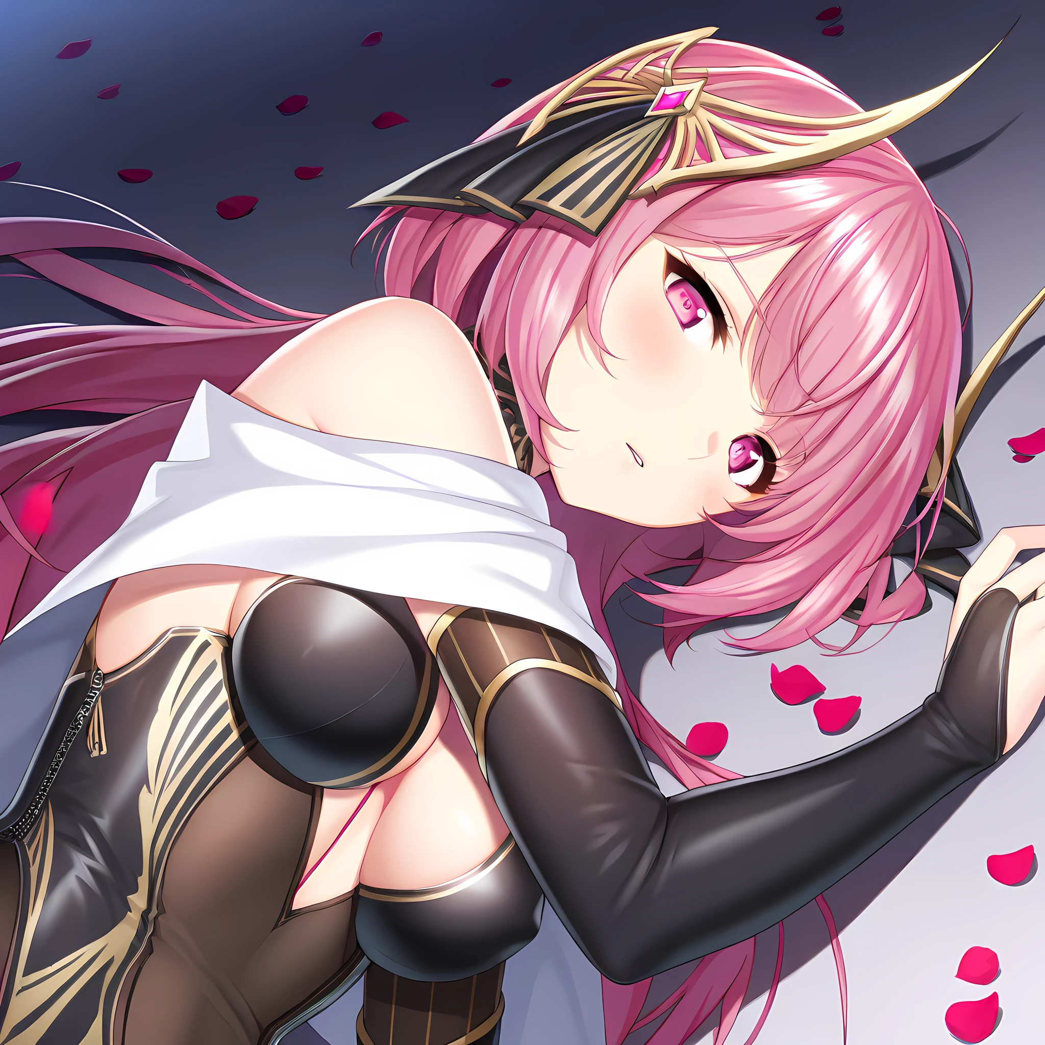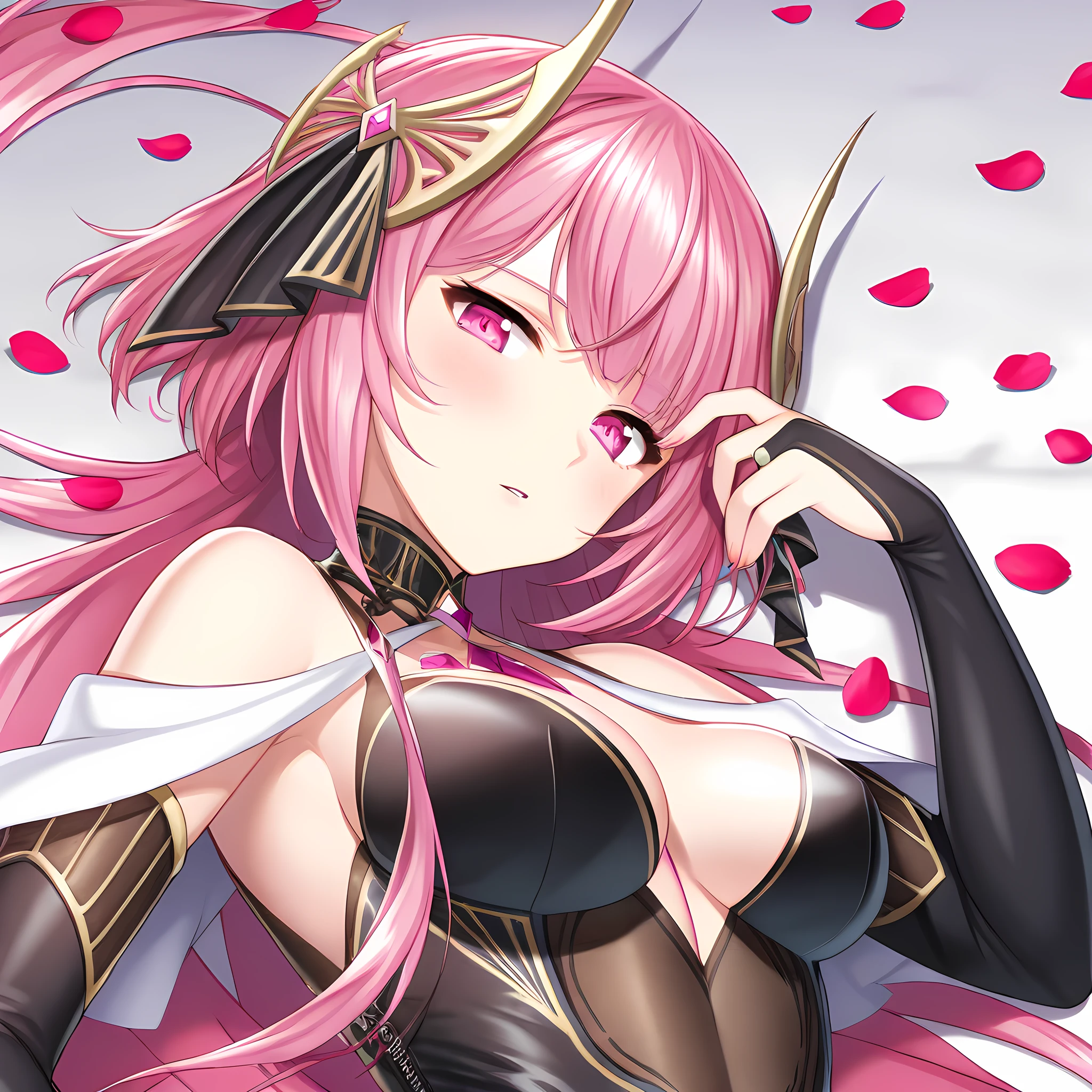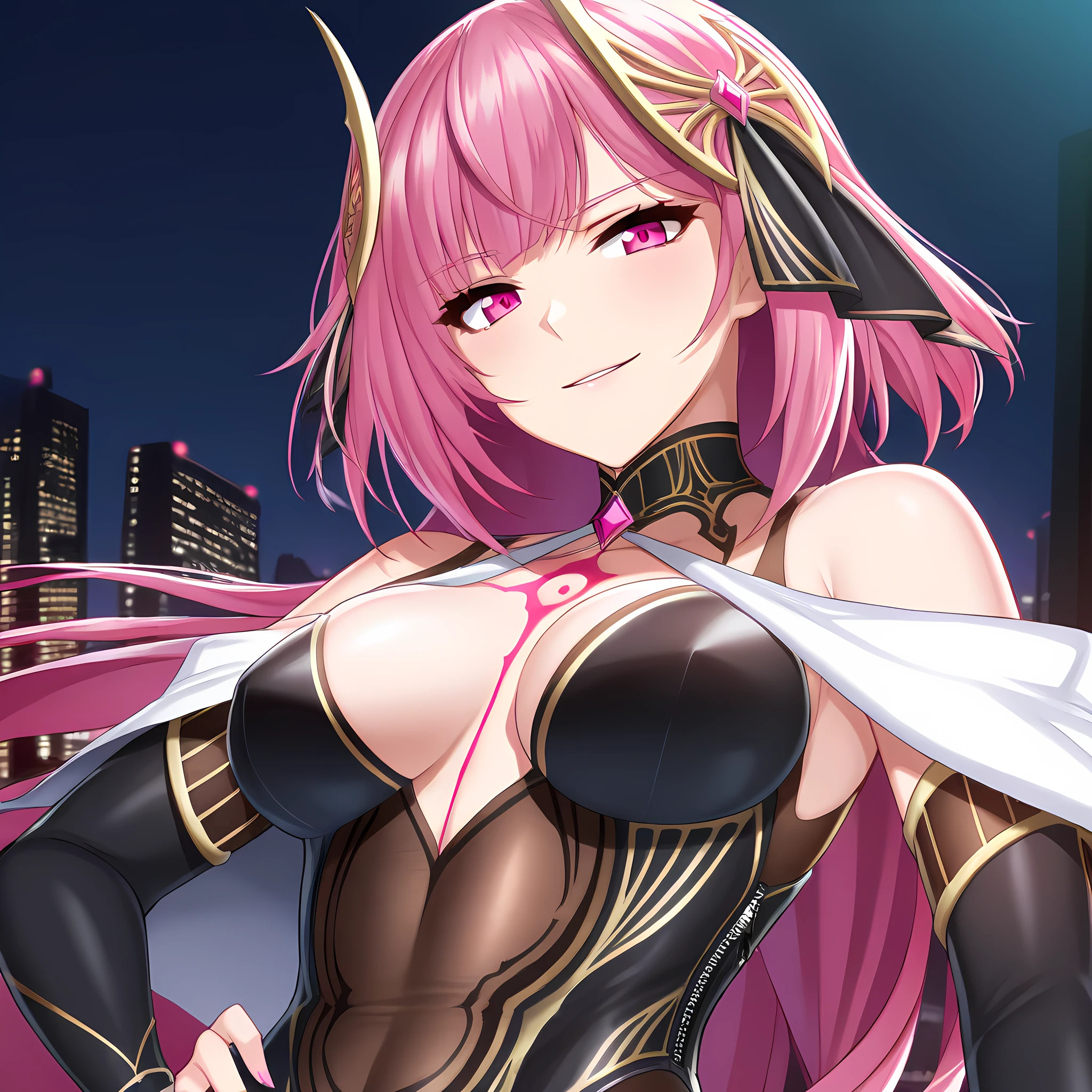 Activation tag of "shena, pink hair, long hair, pink eyes, hair ornament, medium breasts, bangs, "