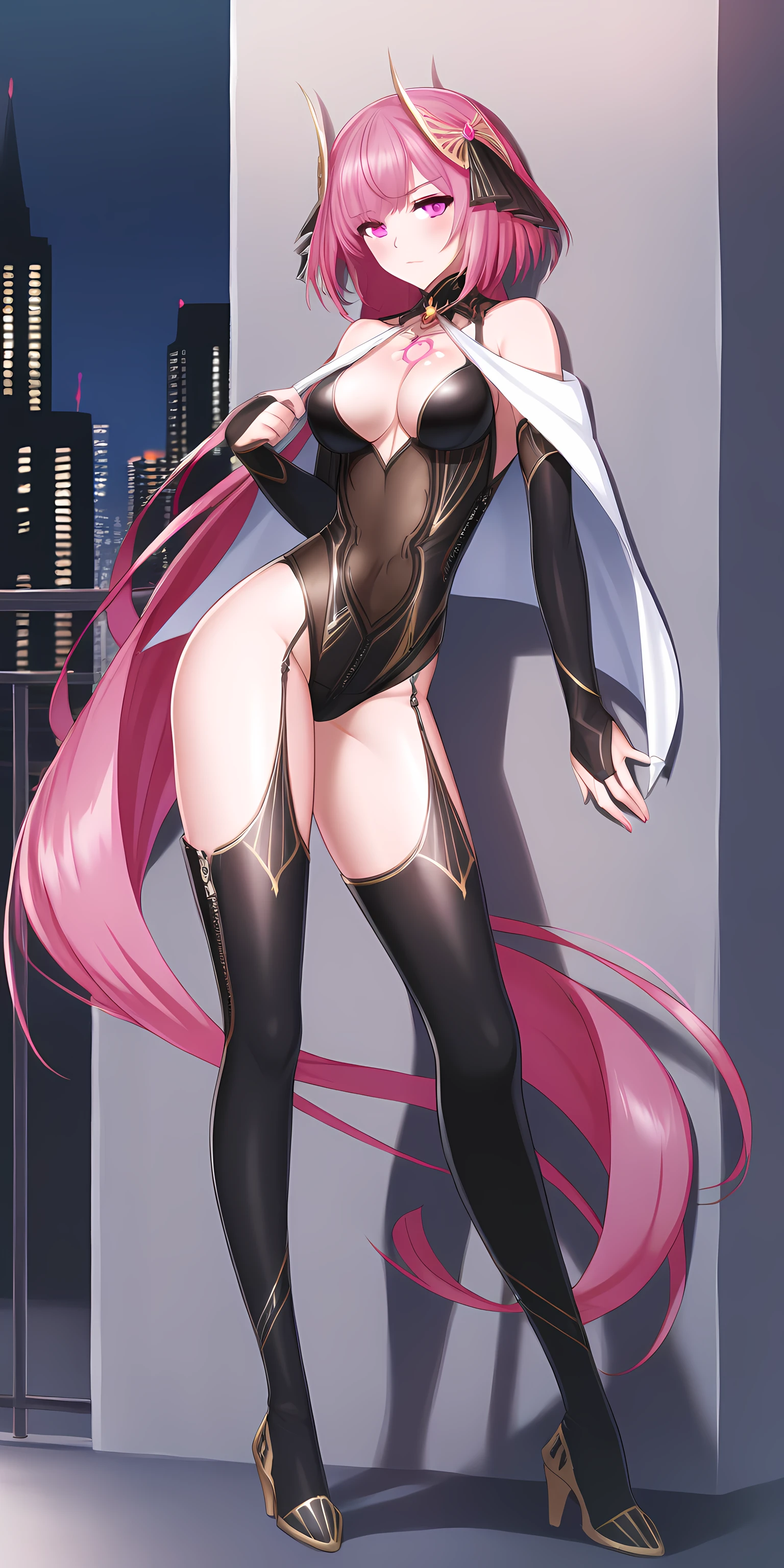 Outfit tag 1 is "defaultoutfit, high heels, thighhighs, very long hair, tattoo, leotard, medium breasts, covered navel, black thighhighs,"