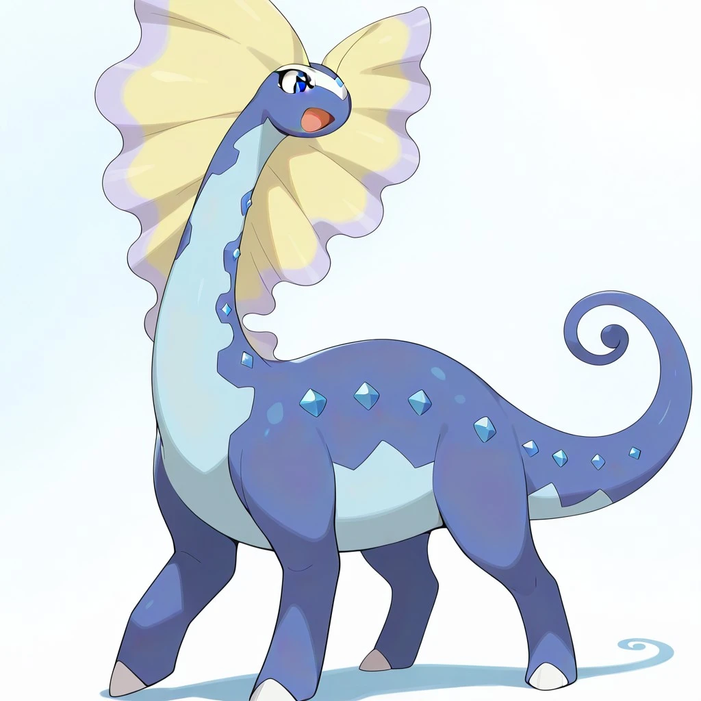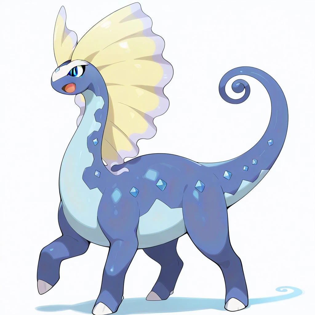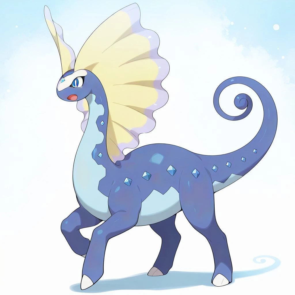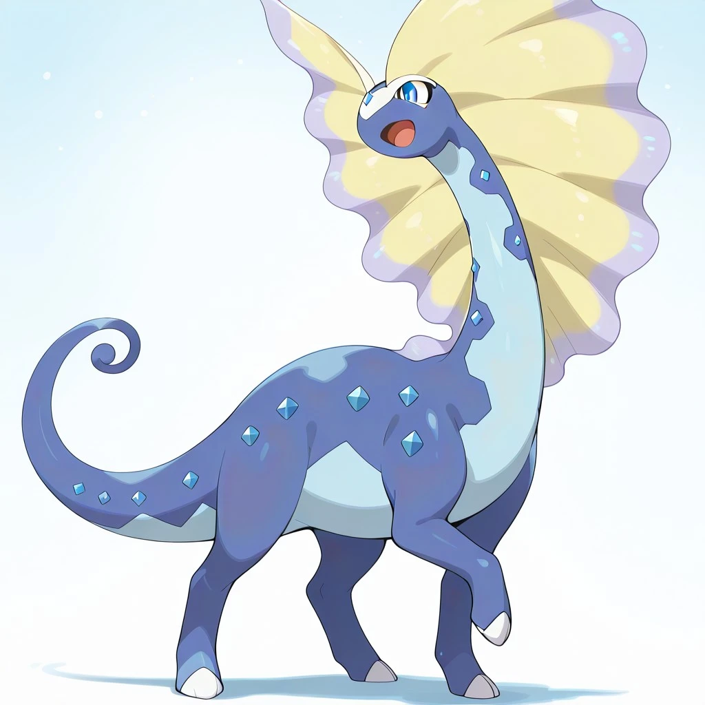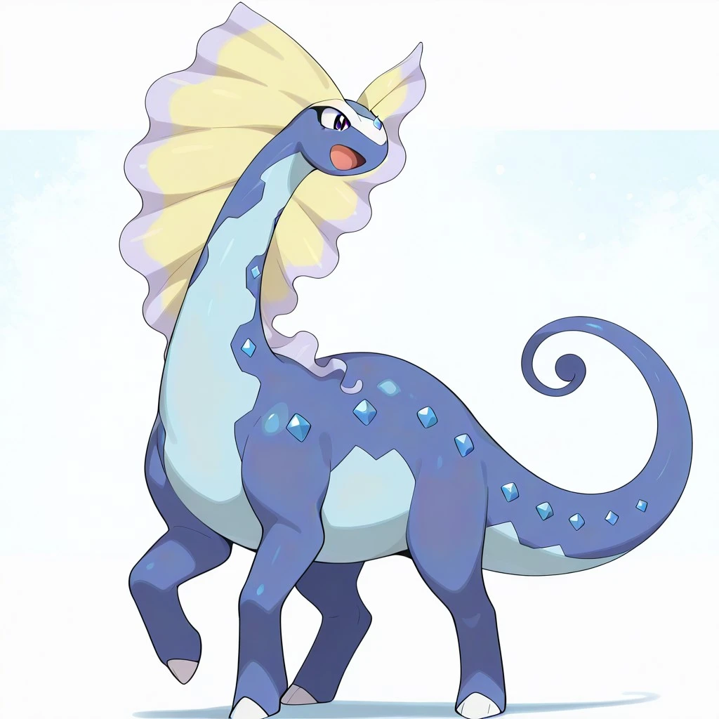 aurorus, pokemon (creature), quadrupedal, sauropod, blue skin, light blue belly, blue eyes, light yellow neck sail