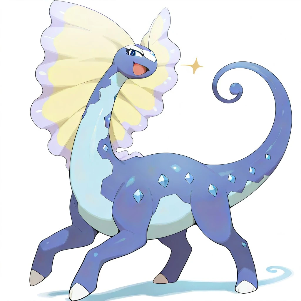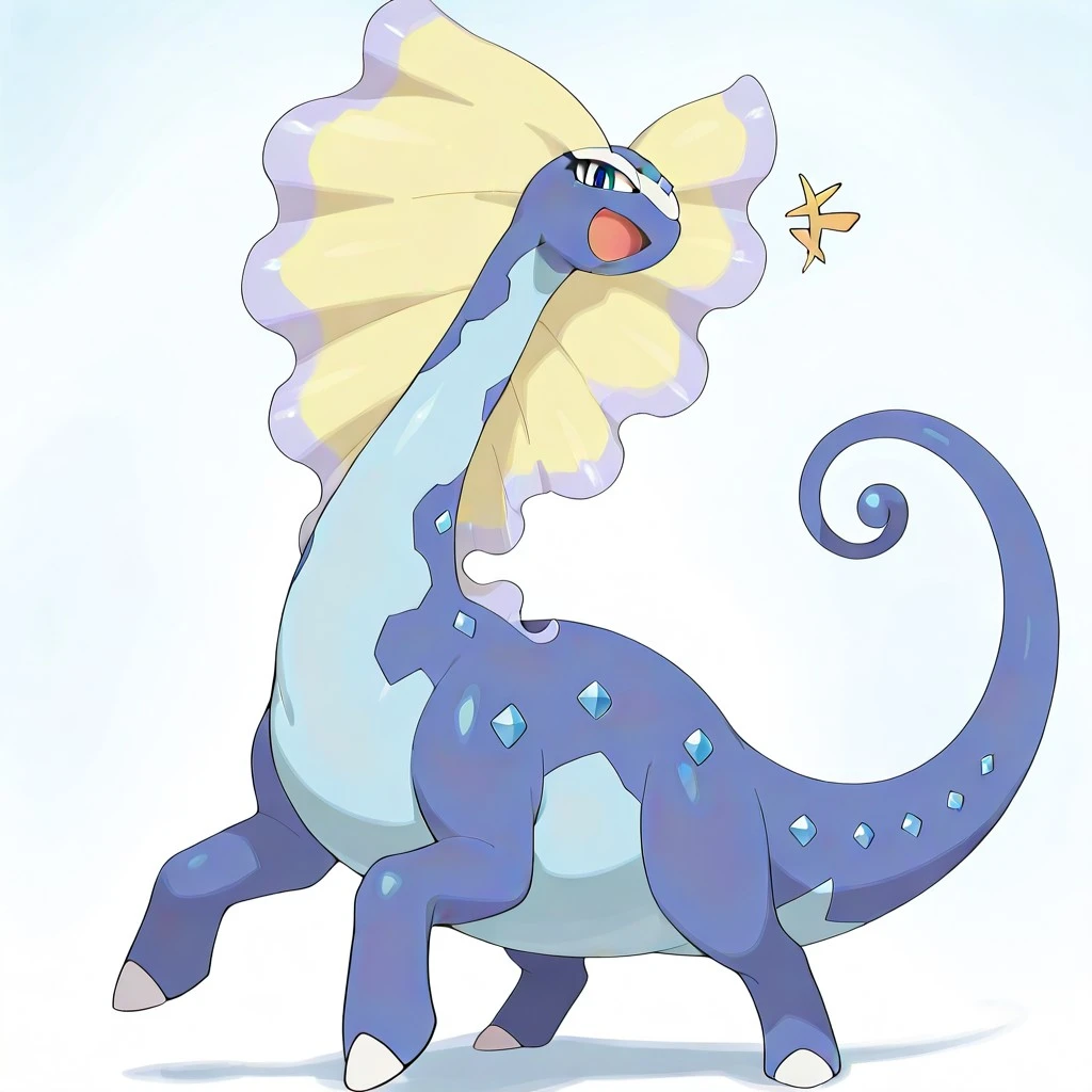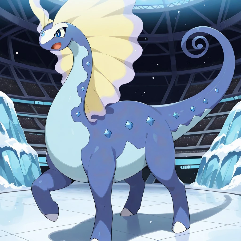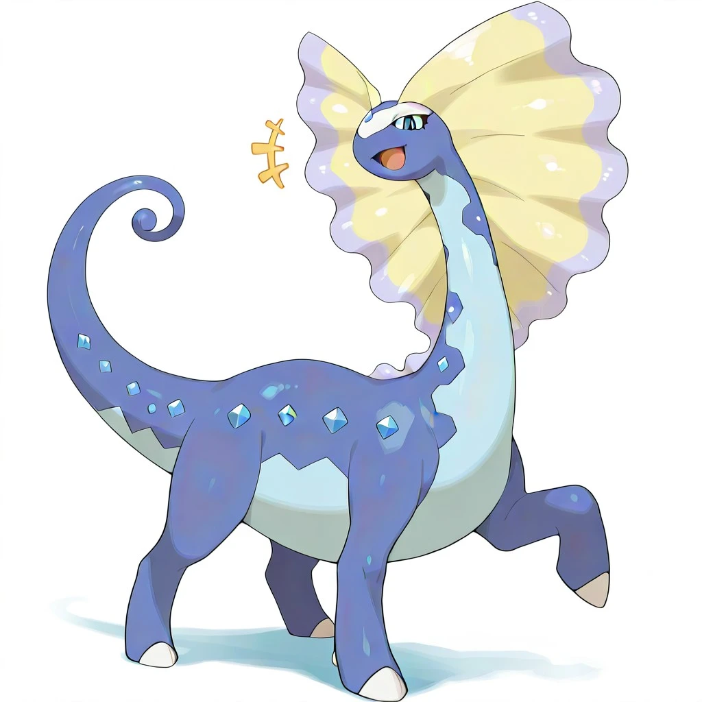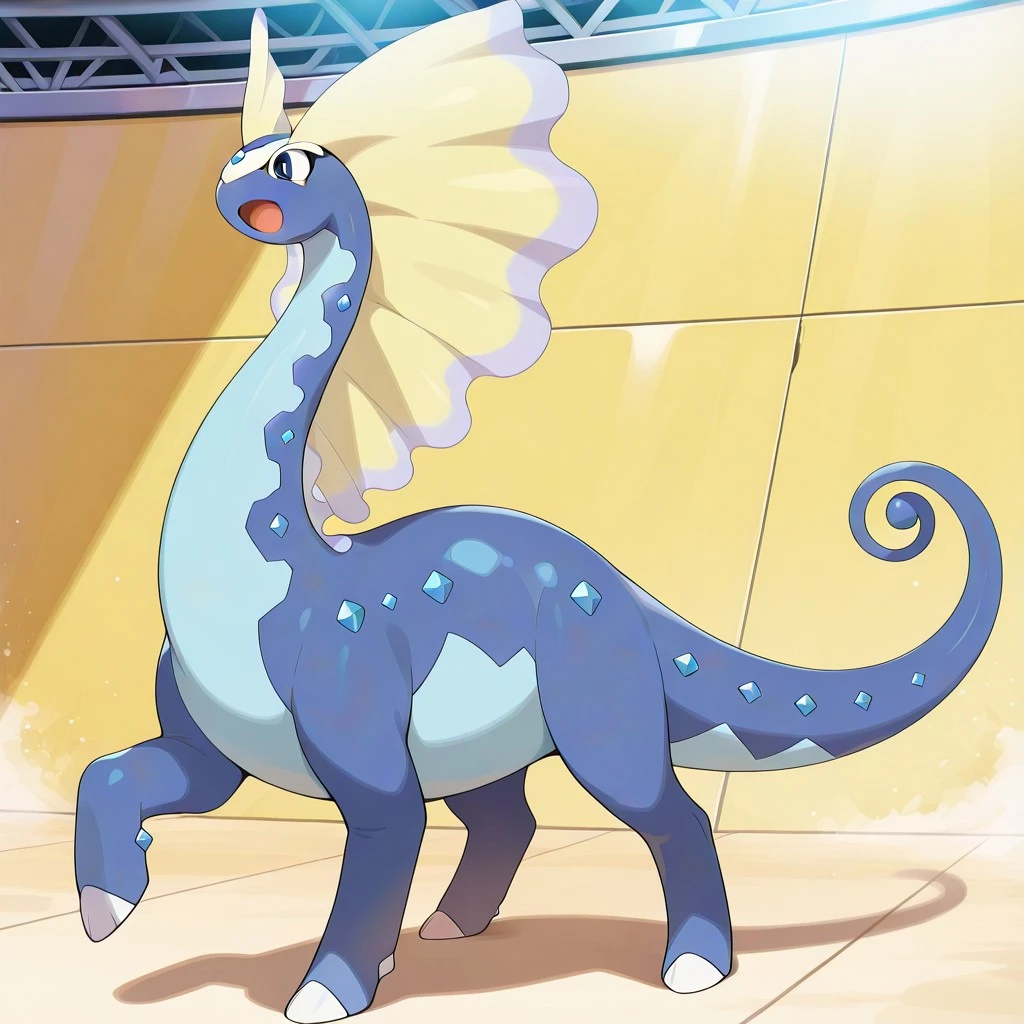 aurorus, pokemon (creature), quadrupedal, sauropod, blue skin, light blue belly, blue eyes, light yellow neck sail