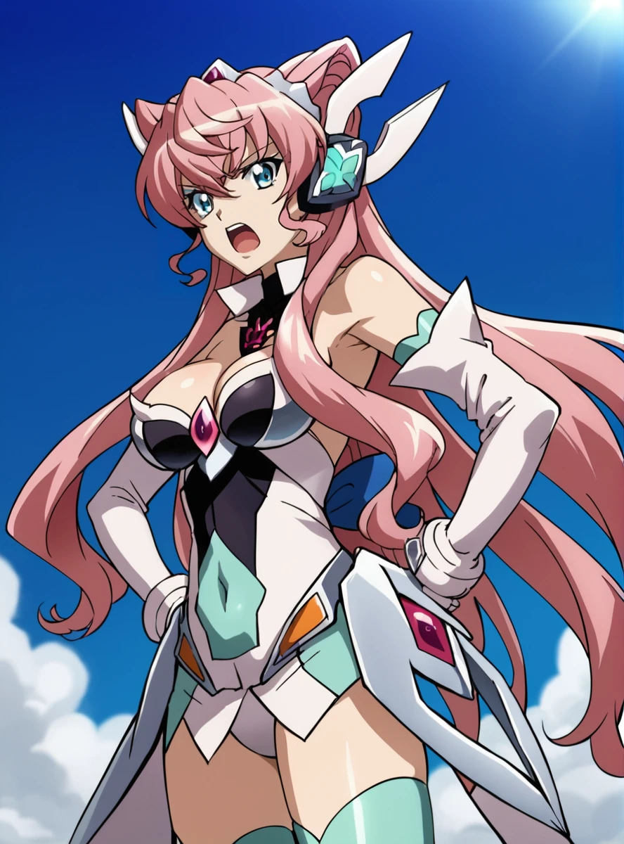 mariagear long hair, pink hair, maria cadenzavna eve, breasts, thighhighs, gloves, leotard, blue eyes, covered navel, very long hair, elbow gloves, anime coloring , focus, thick arms, open mouth, blue sky, screaming,looking at viewer, side view, hands on hips, single gauntlet,