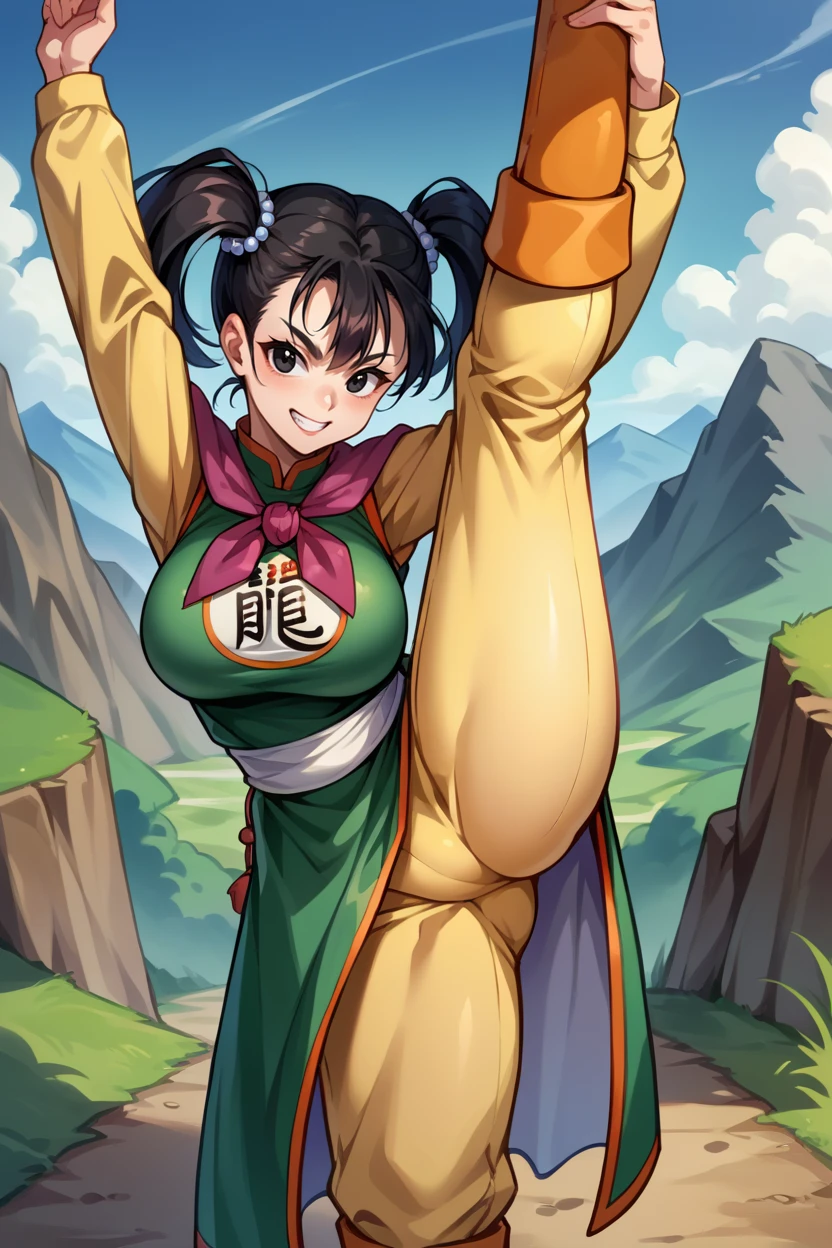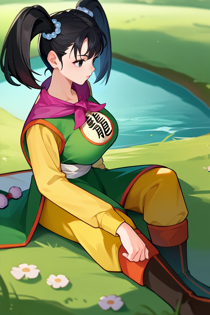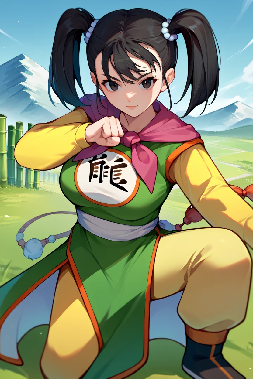 Add "hair ornament, neckerchief, chinese clothes, green dress, yellow sleeves, long sleeves, yellow pants, boots" for her typical look.