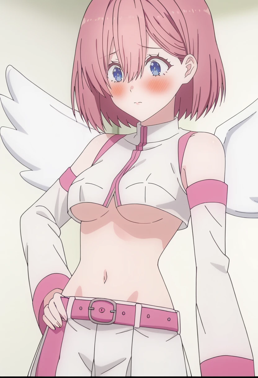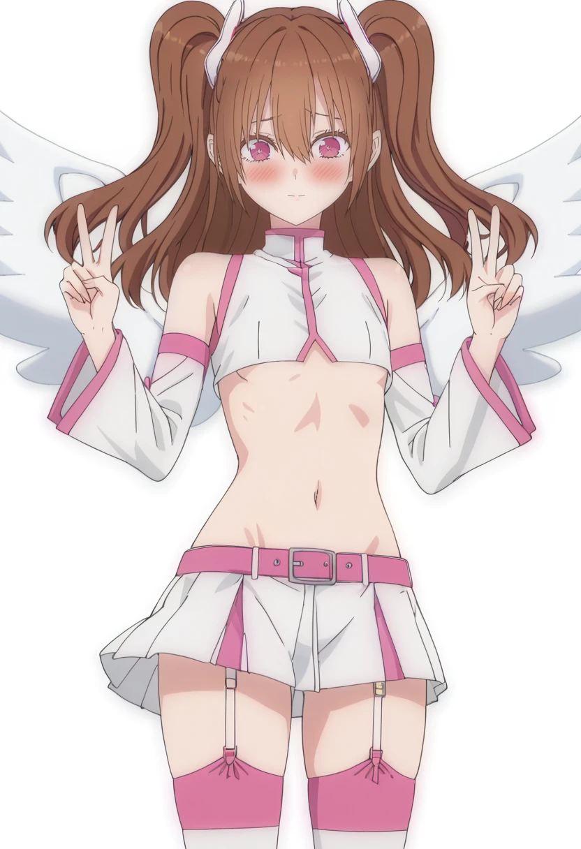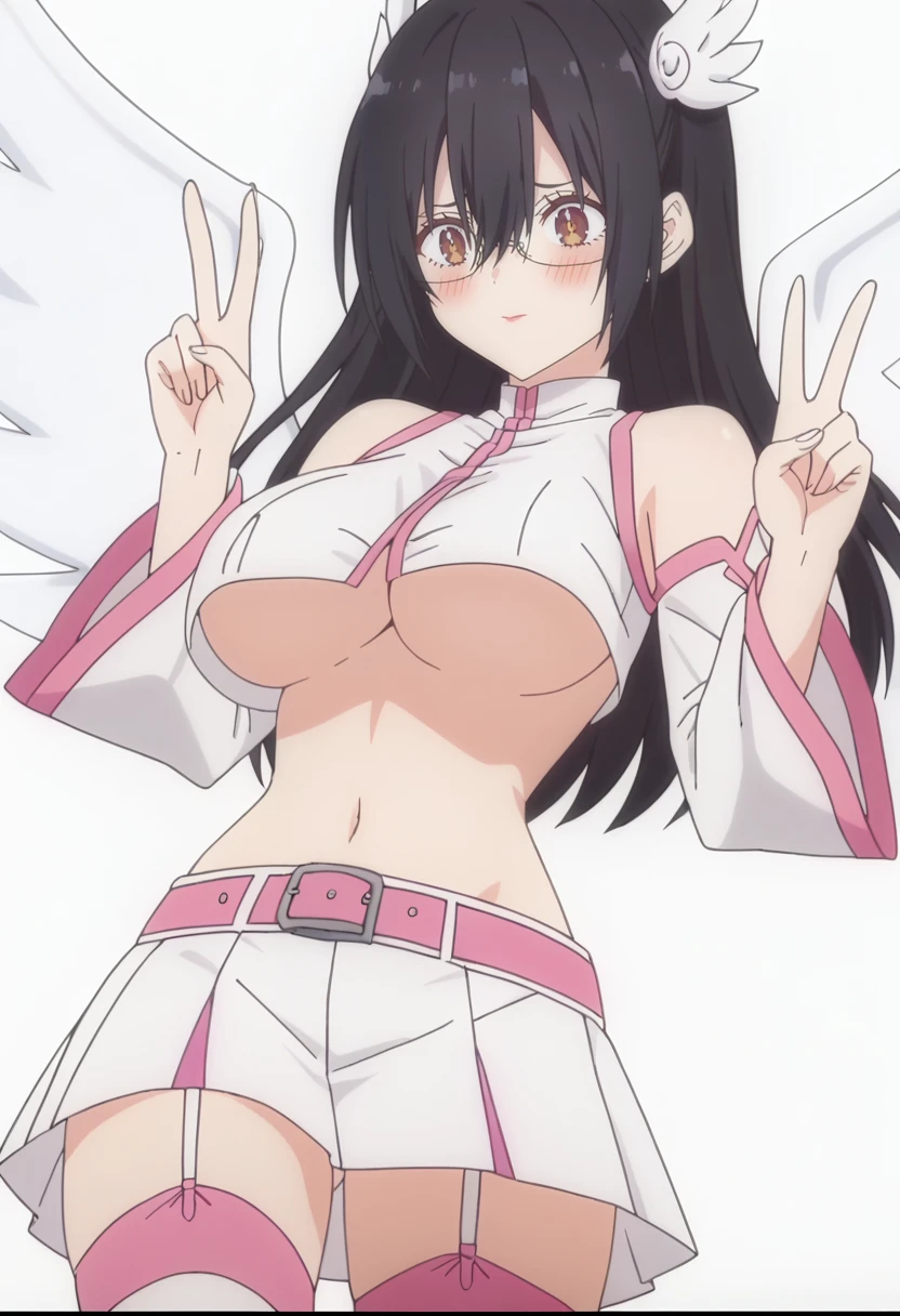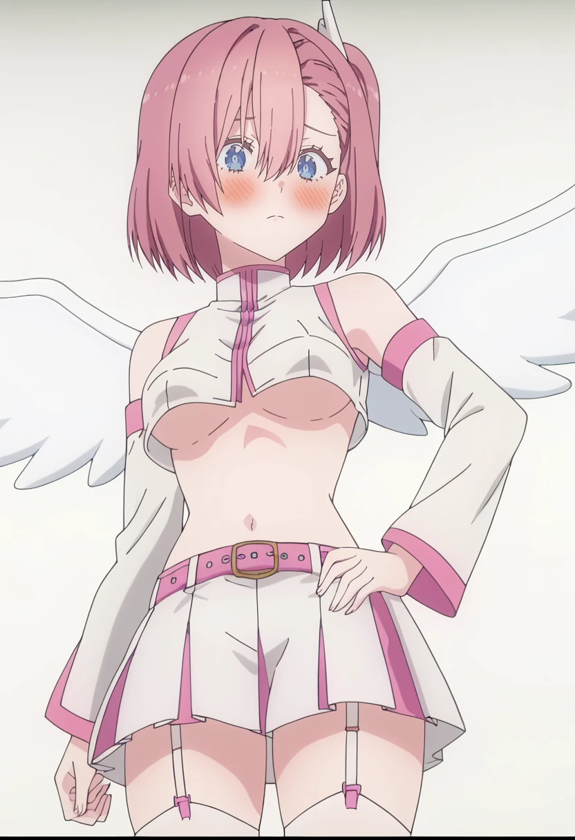 Another useful prompts: lilieloutfit1,miniskirt, white thighhighs, long sleeves, detached sleeves, navel, pleated skirt, angel wings, midriff, crop top, underboob, garter straps, white wings, wing hair ornament, pink belt, wings, under boob, belly, garter belt, thighhighs, bare shoulders, no bra,