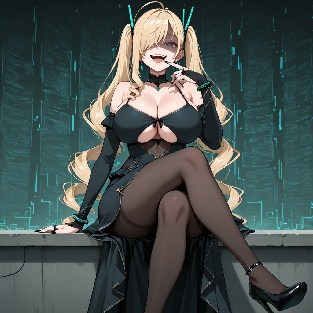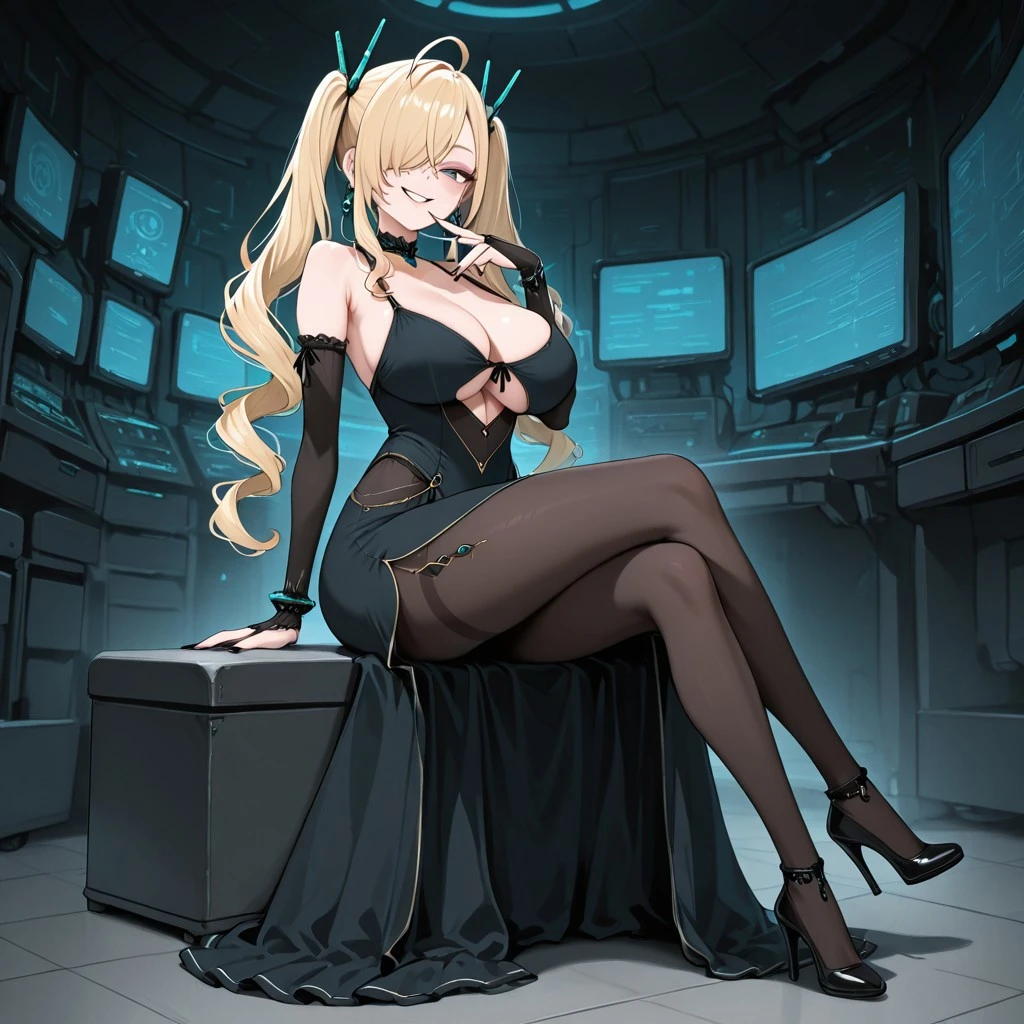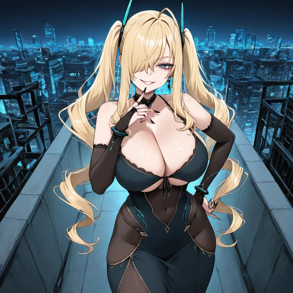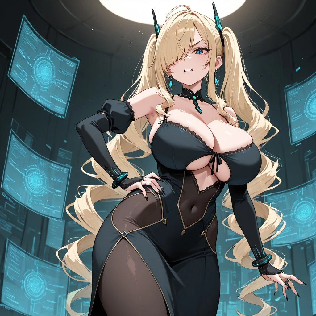 Character: 1girl, blue eyes, long hair, blond hair, Side Swept Bangs, bangs covering one eye, twintails, drill twintails, antenna hairpins, earrings, large breasts, long nails, black nailpolish,