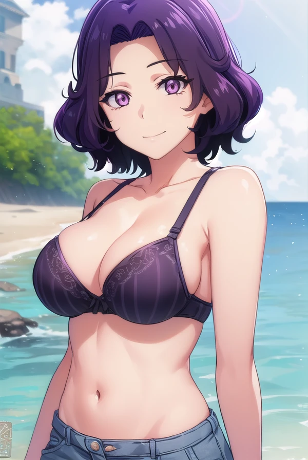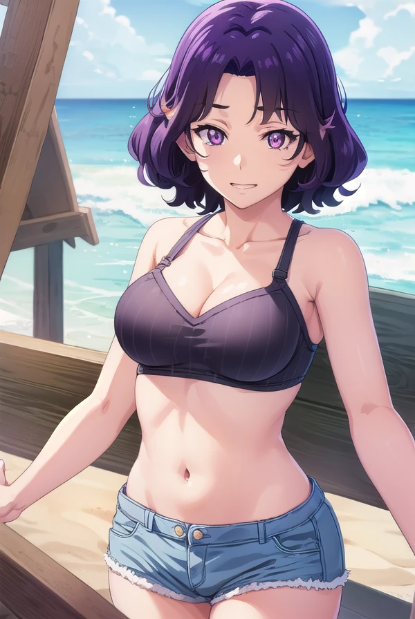 azusa hamaoka, short hair, (purple eyes:1.1), purple hair, (parted bangs:1.5),