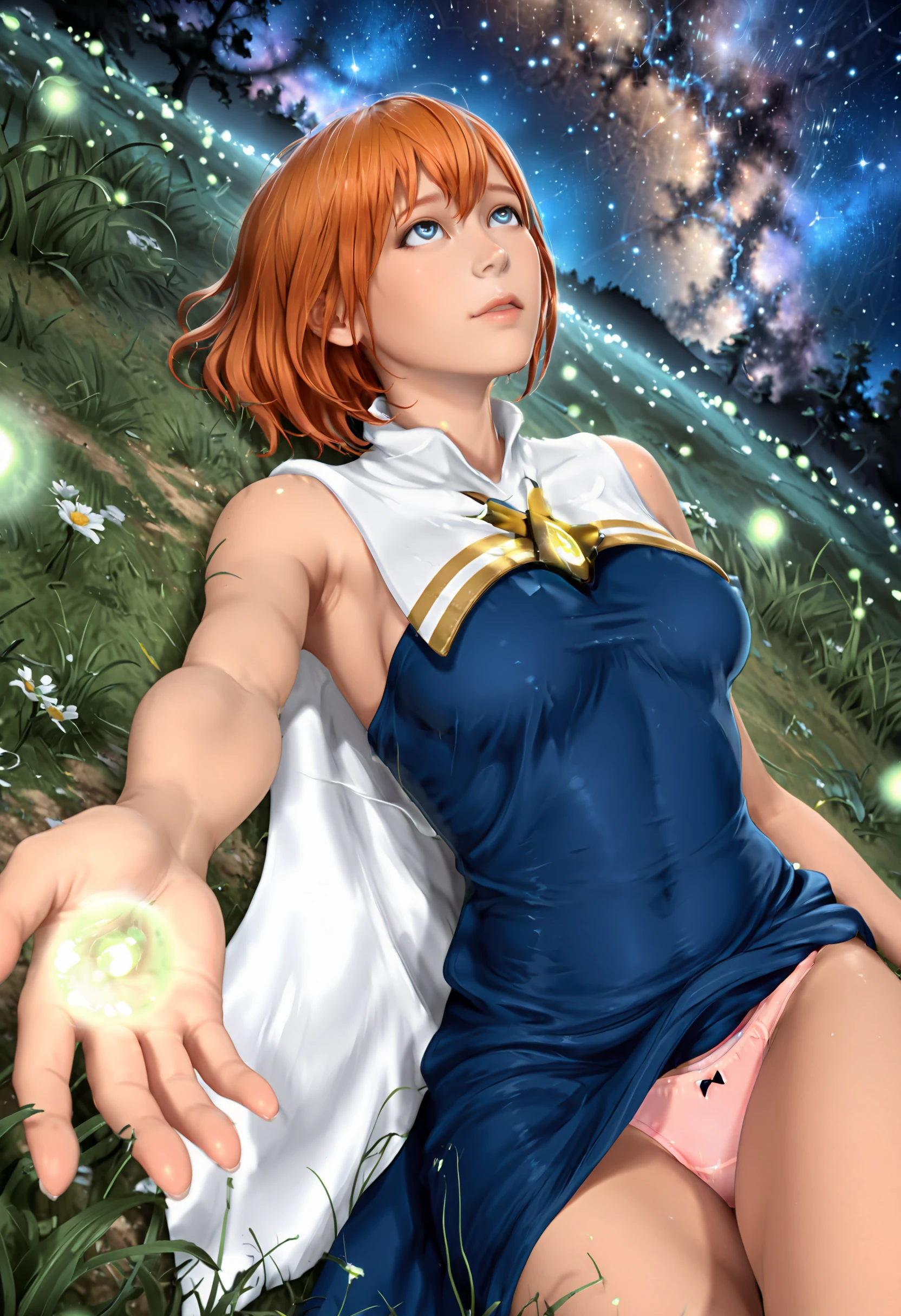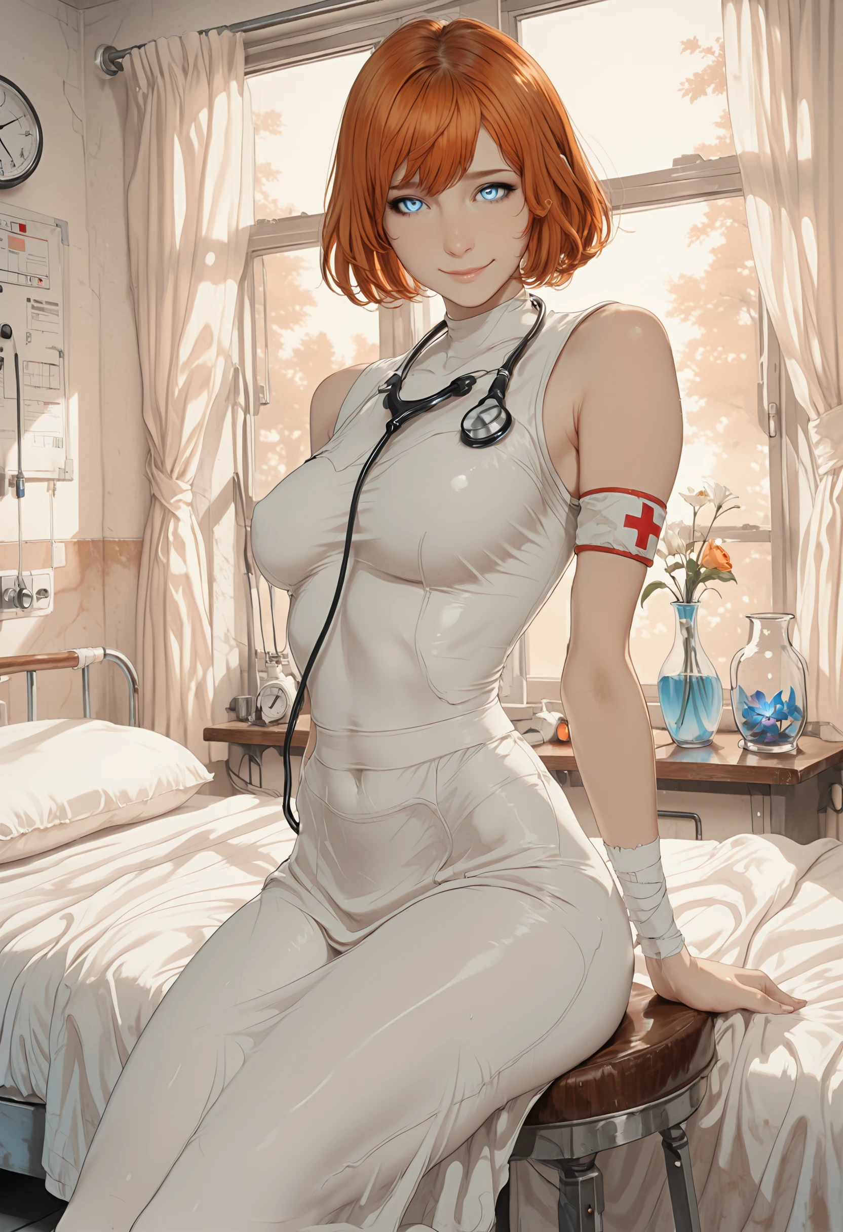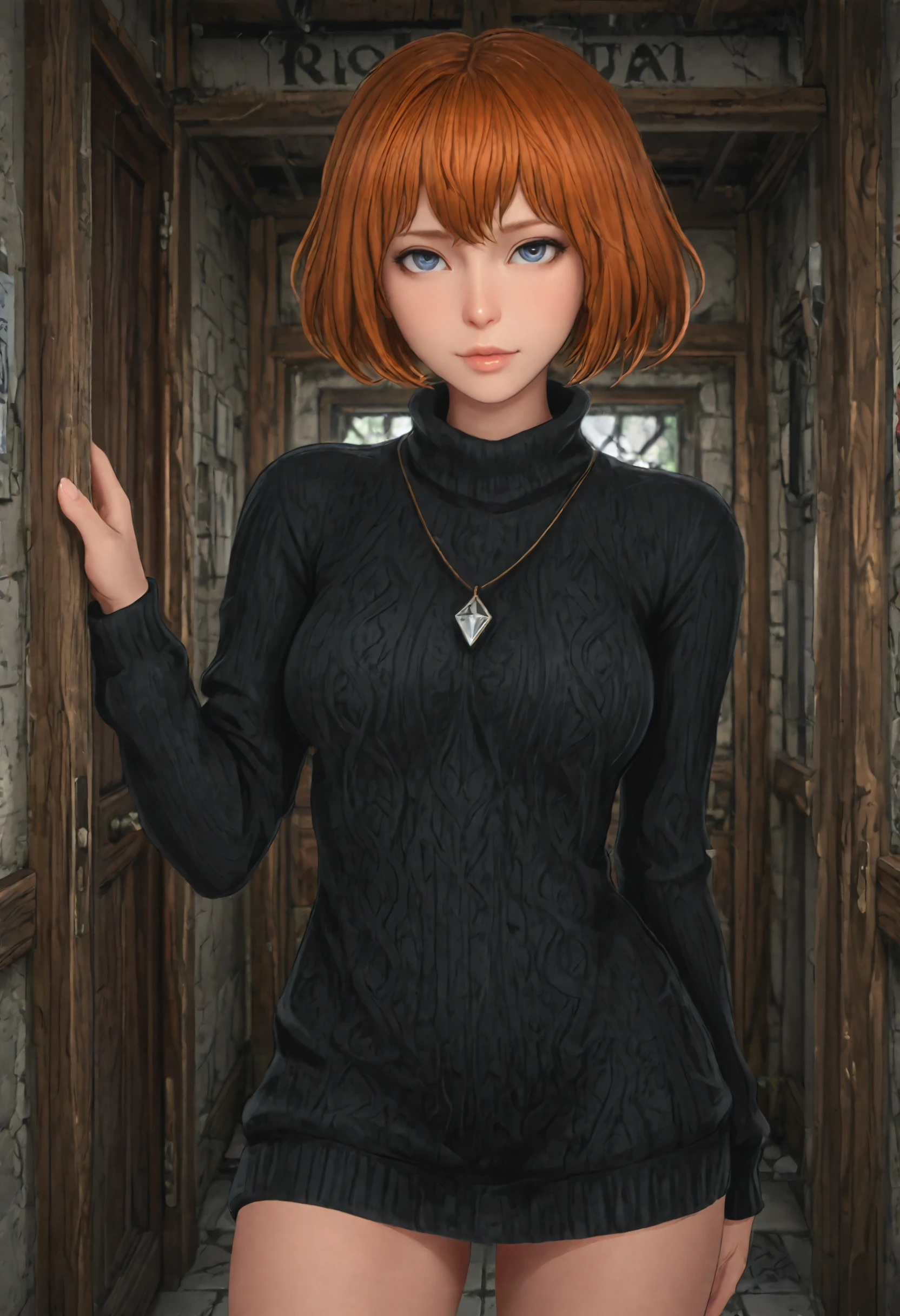 🧥 Default look (core features):1girl, short orange hair, blue eyes