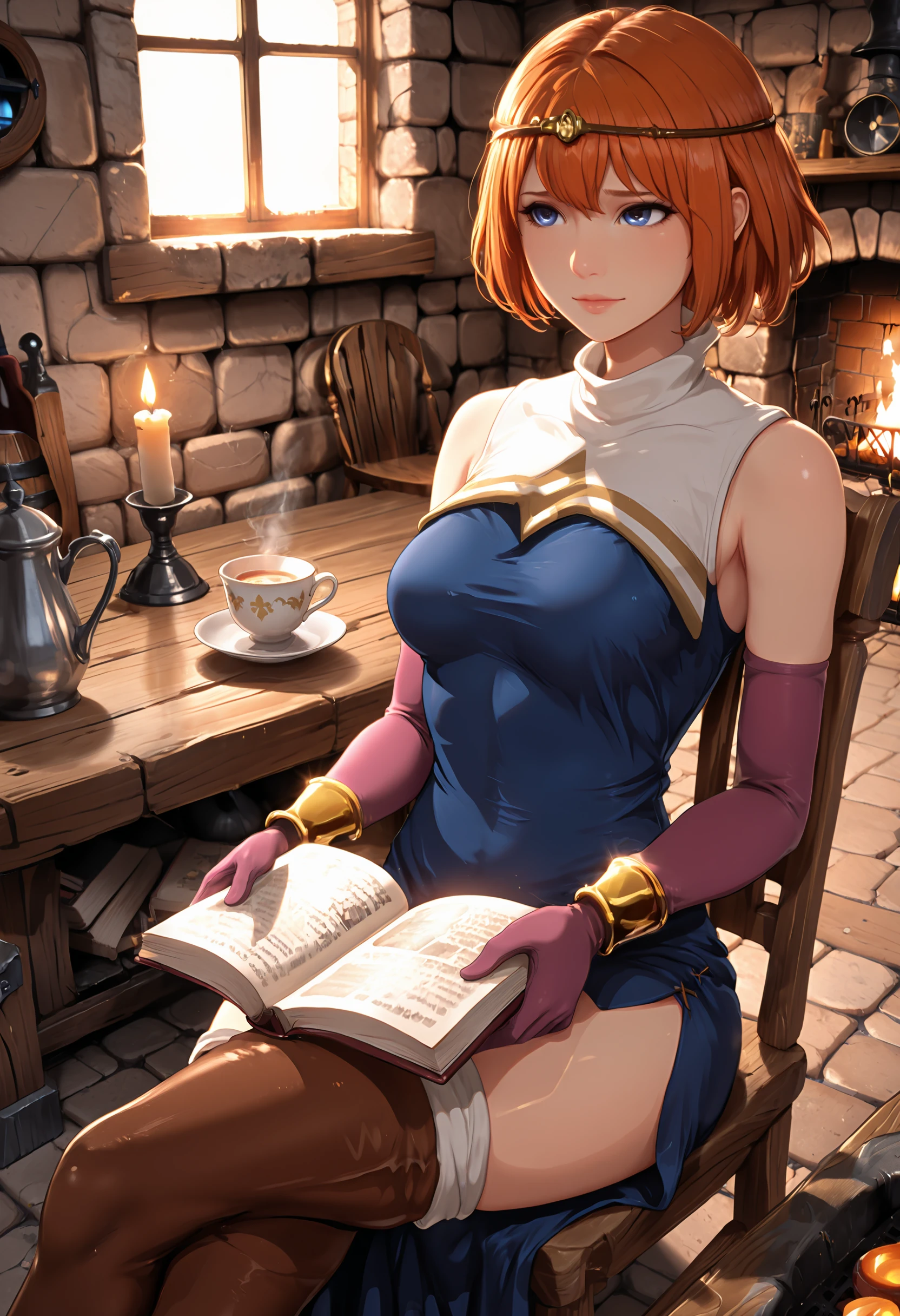 👗 Mage outfit (full look):mage uniform, sleeveless, blue dress, white cape with golden stripes, brown belt with three blue crystals, dark pink elbow gloves, golden bracelets, brown thighhighs with white folded cuff, wooden circlet