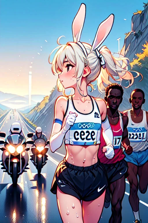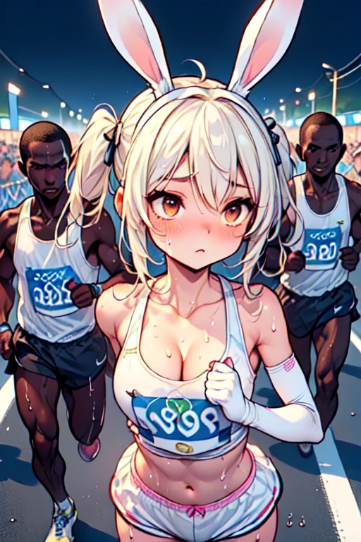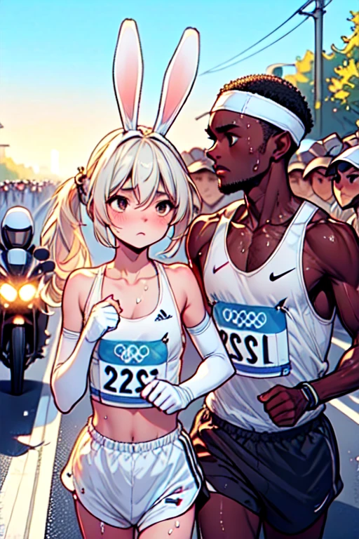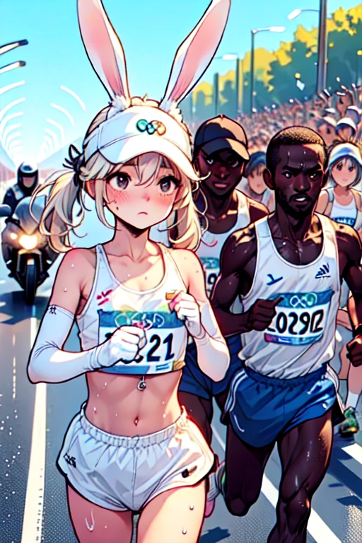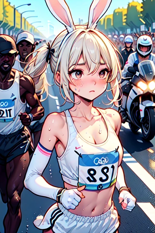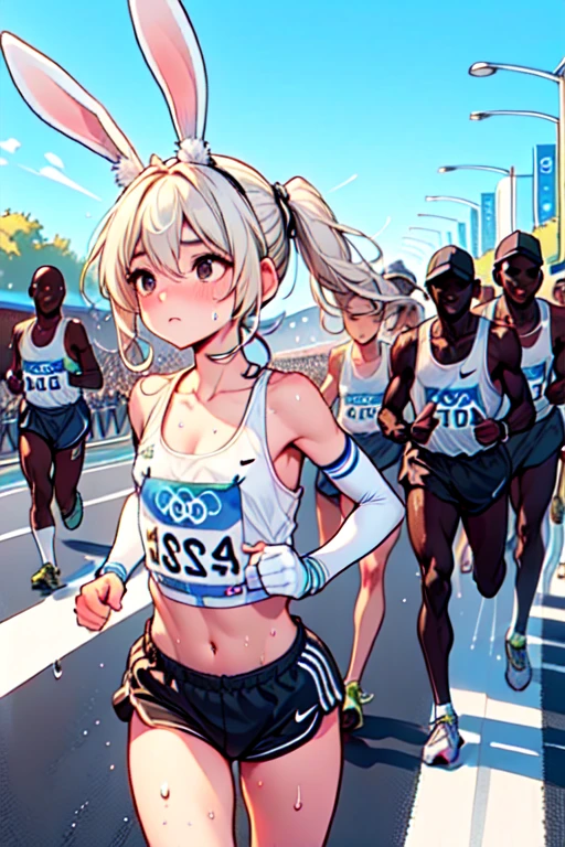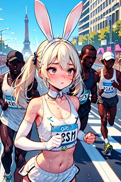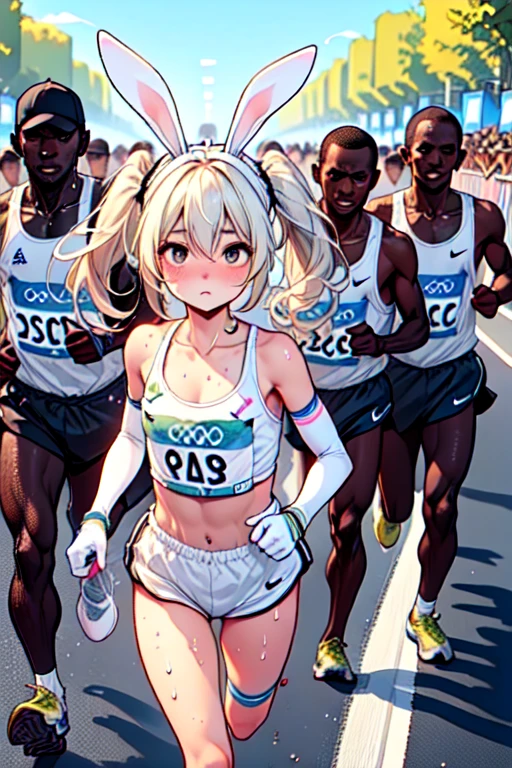 ((marathon pacer)), ((road running)), ((five muscular african male runner and 1girl)), surround, following, dense, rabbit ears, twintails, ribbon, petite figure, tank top, white elbow gloves, cleavage, big tits, sweat, floating hair, wind, crowd, looking away, olympic games in paris,