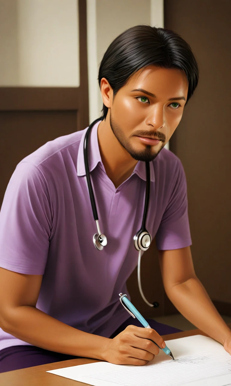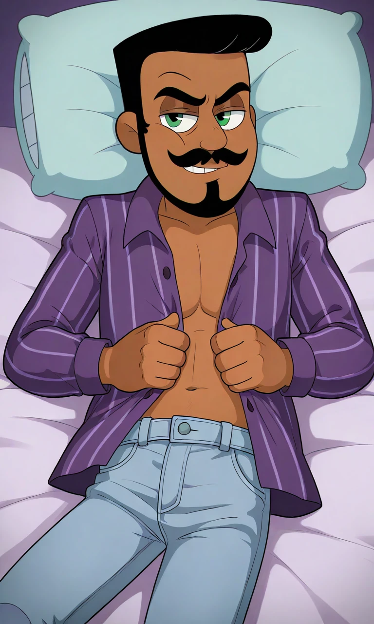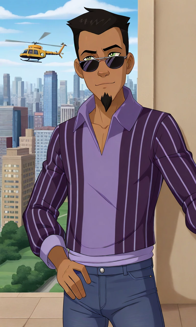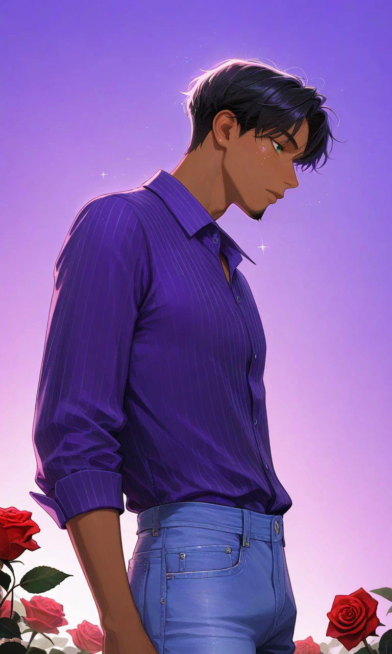 1boy,tan,dark-skinned male,short hair,black hair,beard,moustache,green eyes,collared shirt,purple shirt,pinstripe shirt,jeans