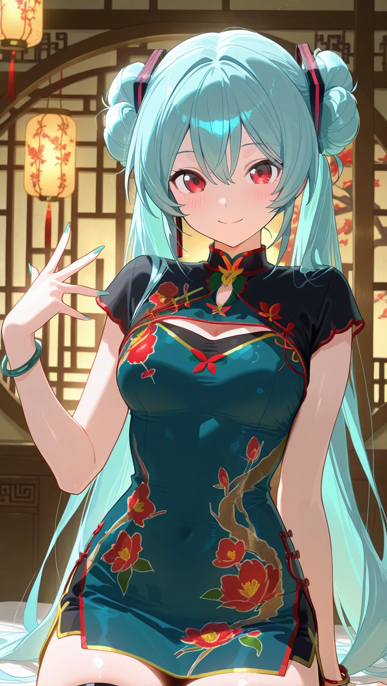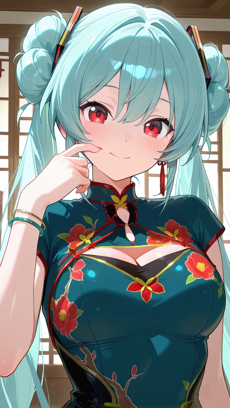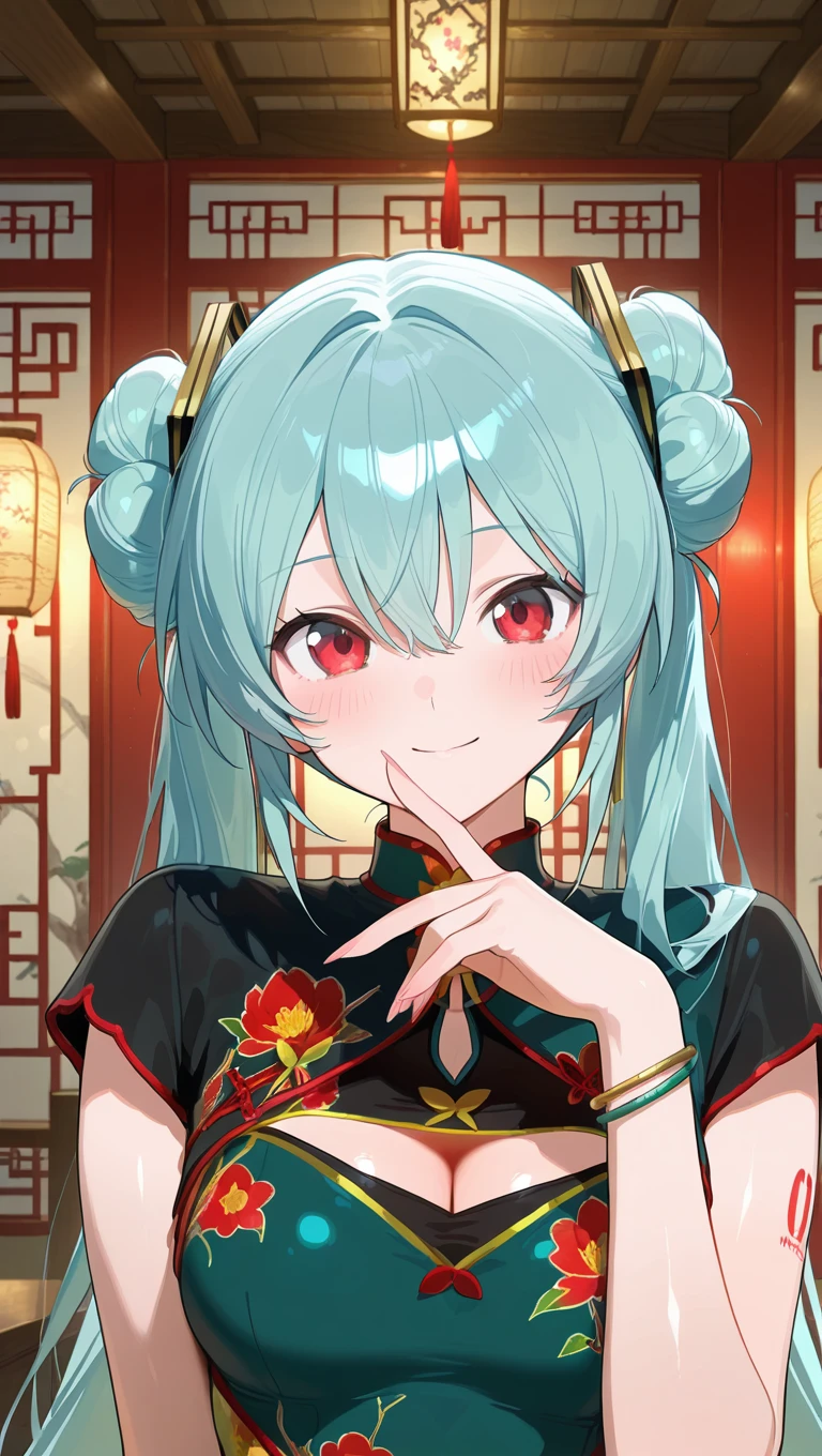 very long hair,aqua hair,double bun,twintails,hair ornament,hair between eyes,red eyes