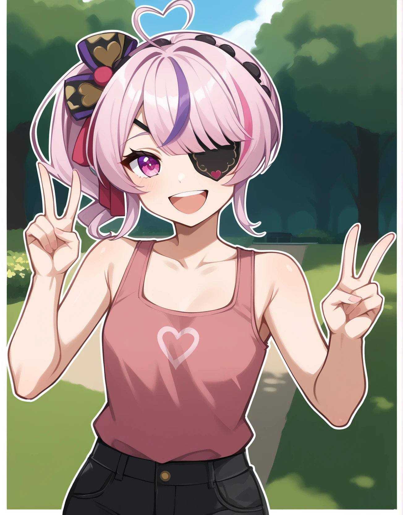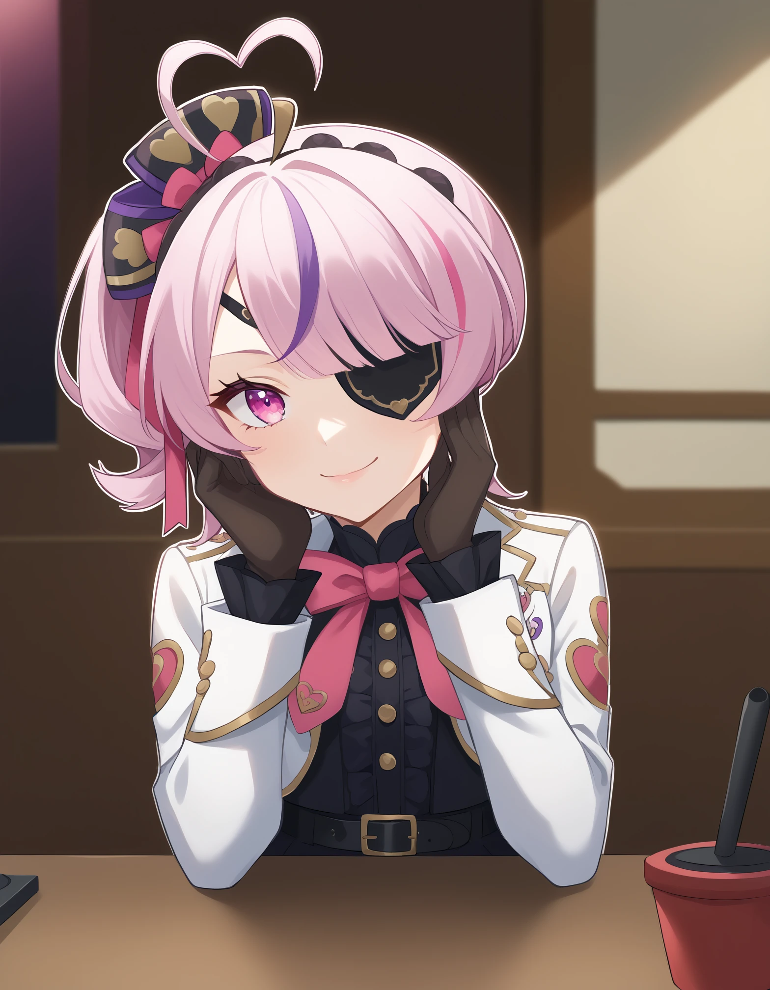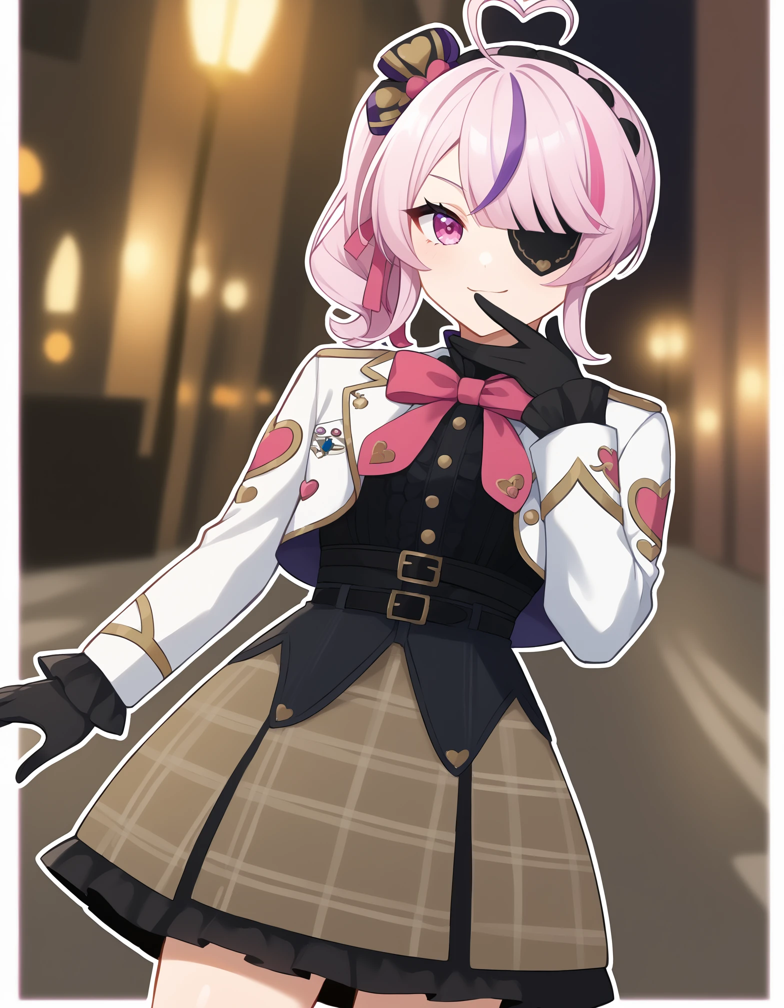 tags are - mariamarionette, 1girl, bangs, skirt, shirt, hair ornament, gloves, long sleeves, bow, purple eyes, jacket, pink hair, purple hair, ahoge, heart, multicolored hair, frills, black gloves, belt, bowtie, pink eyes, side ponytail, streaked hair, plaid, black shirt, plaid skirt, eyepatch, white jacket, pink bow, fishnets, corset, cropped jacket, black belt, one eye covered, pink bowtie, heart ahoge, black corset
