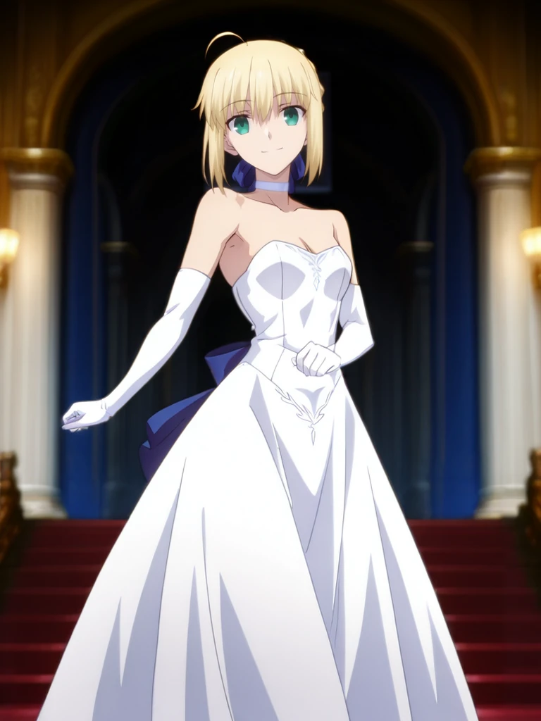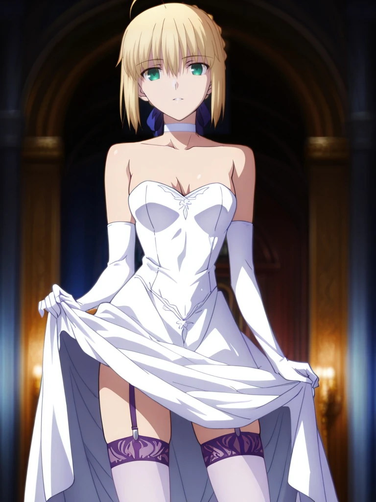 saberWhite, high ponytail,blue hair bow, white choker, white strapless dress, white elbow gloves, purple garter straps, white thighhighs,white high heels,