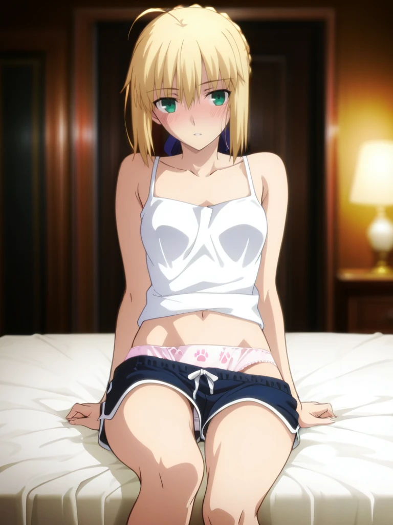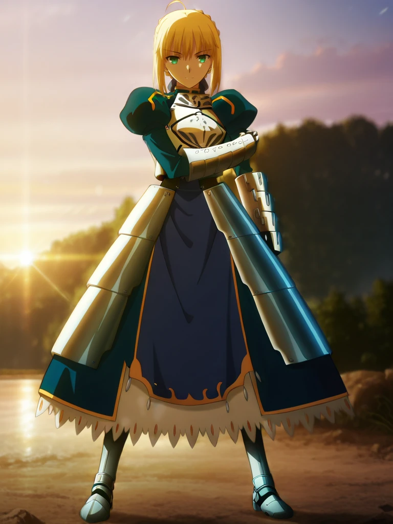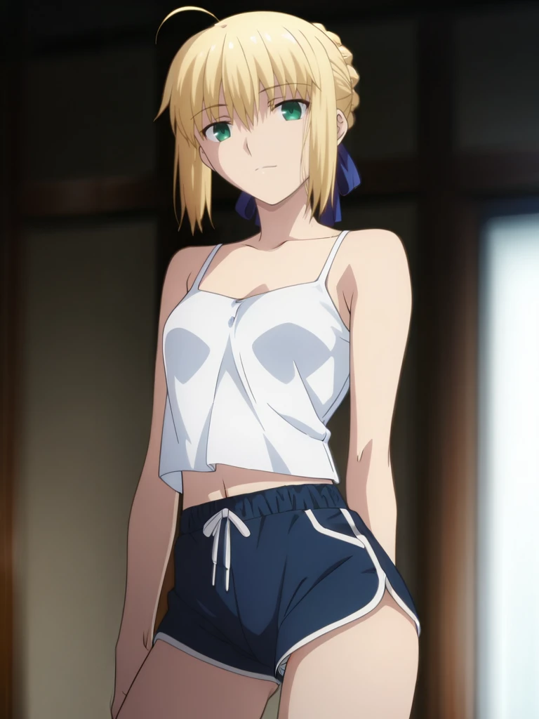 saber, blonde hair, bangs,braided bun, ahoge, green eyes, small breasts, anime screenshot,