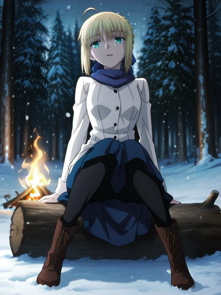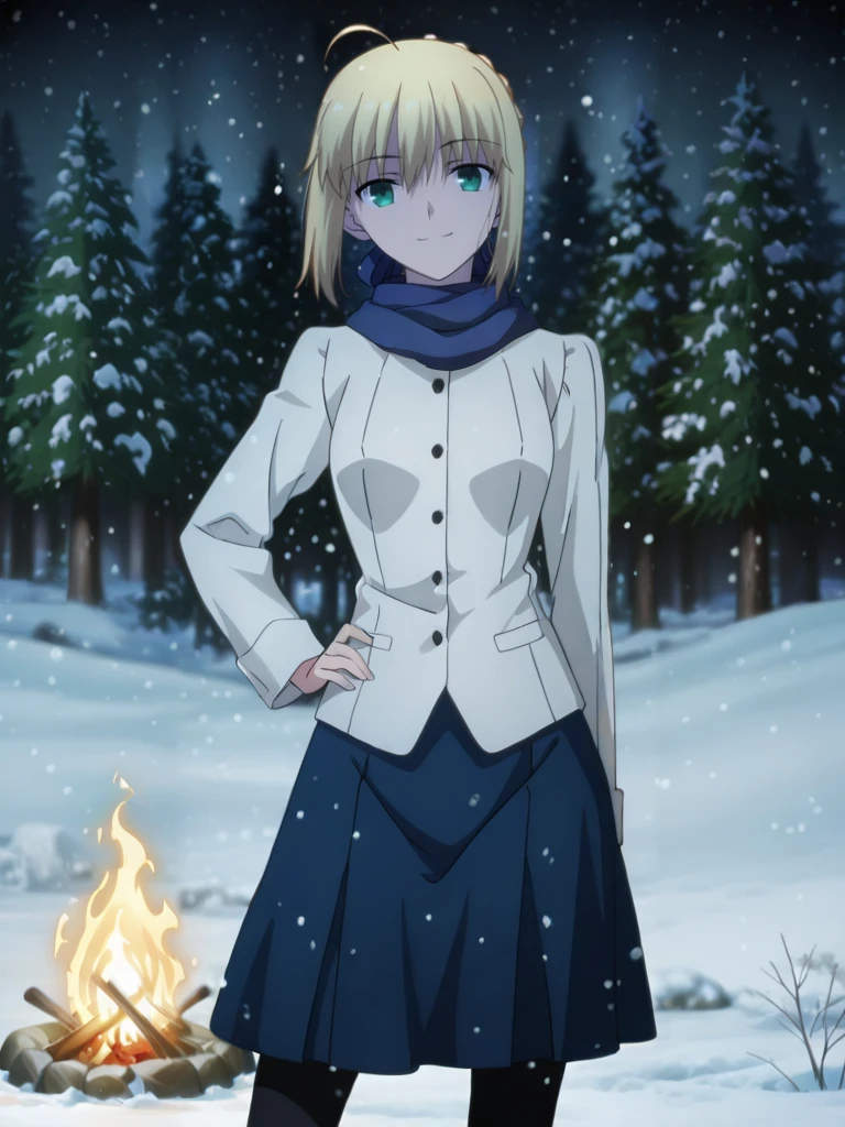 saberWinter, blue scarf, white coat, buttons, blue skirt, black pantyhose,