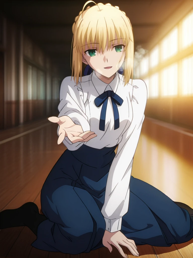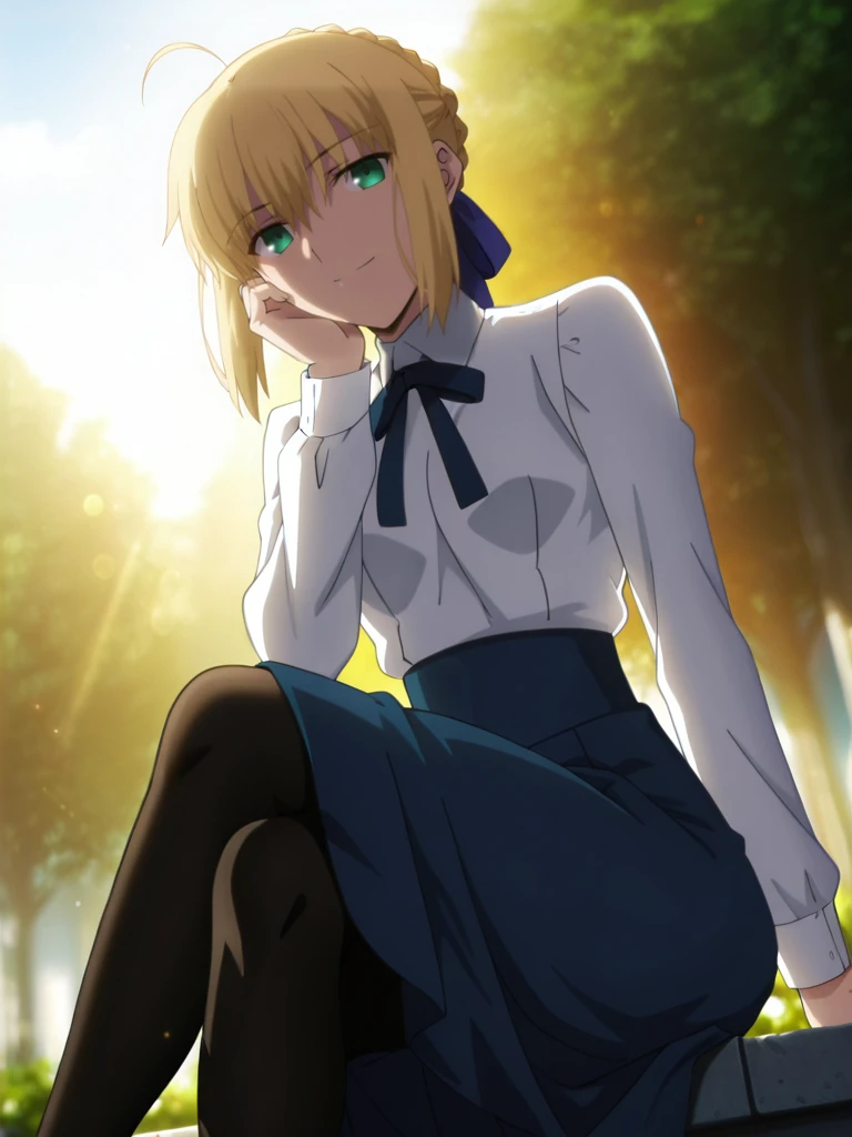 saberDaily,blue hair ribbon,blue neck ribbon, white long sleeves shirt,blue skirt, black pantyhose, brown footwear,