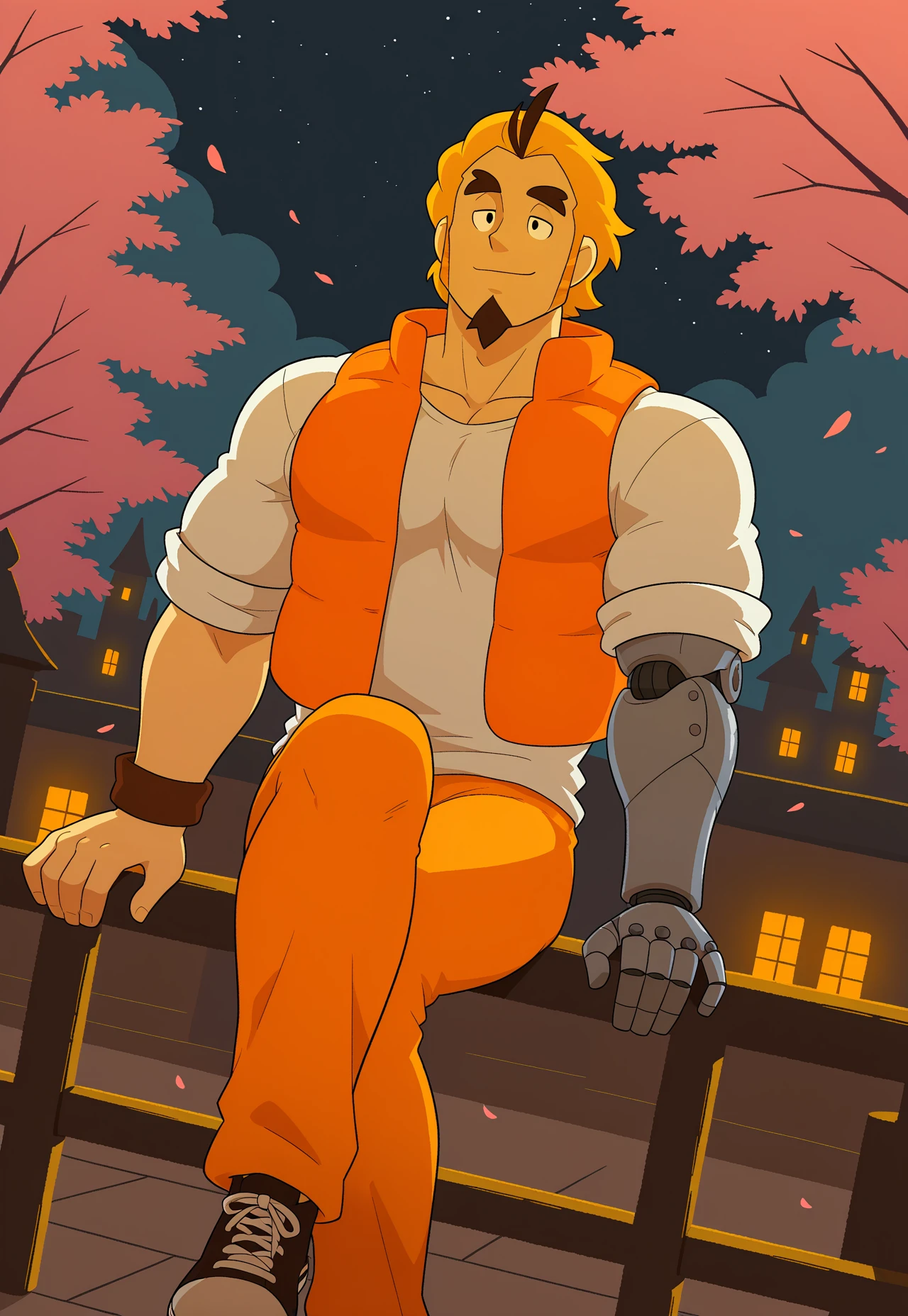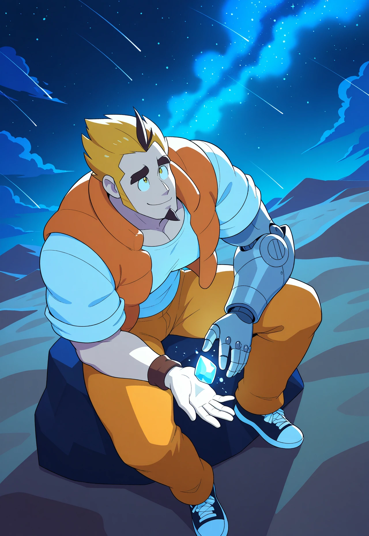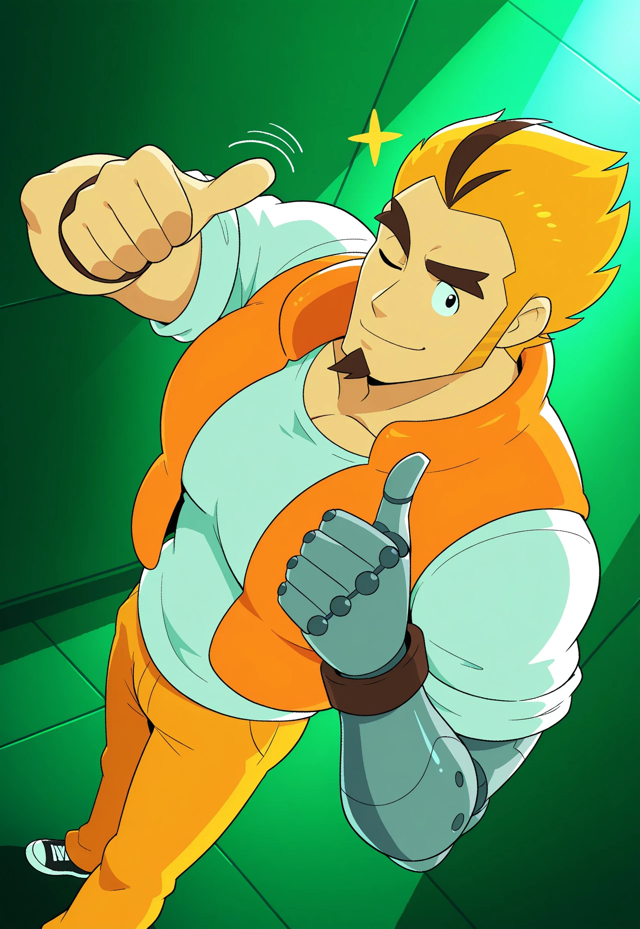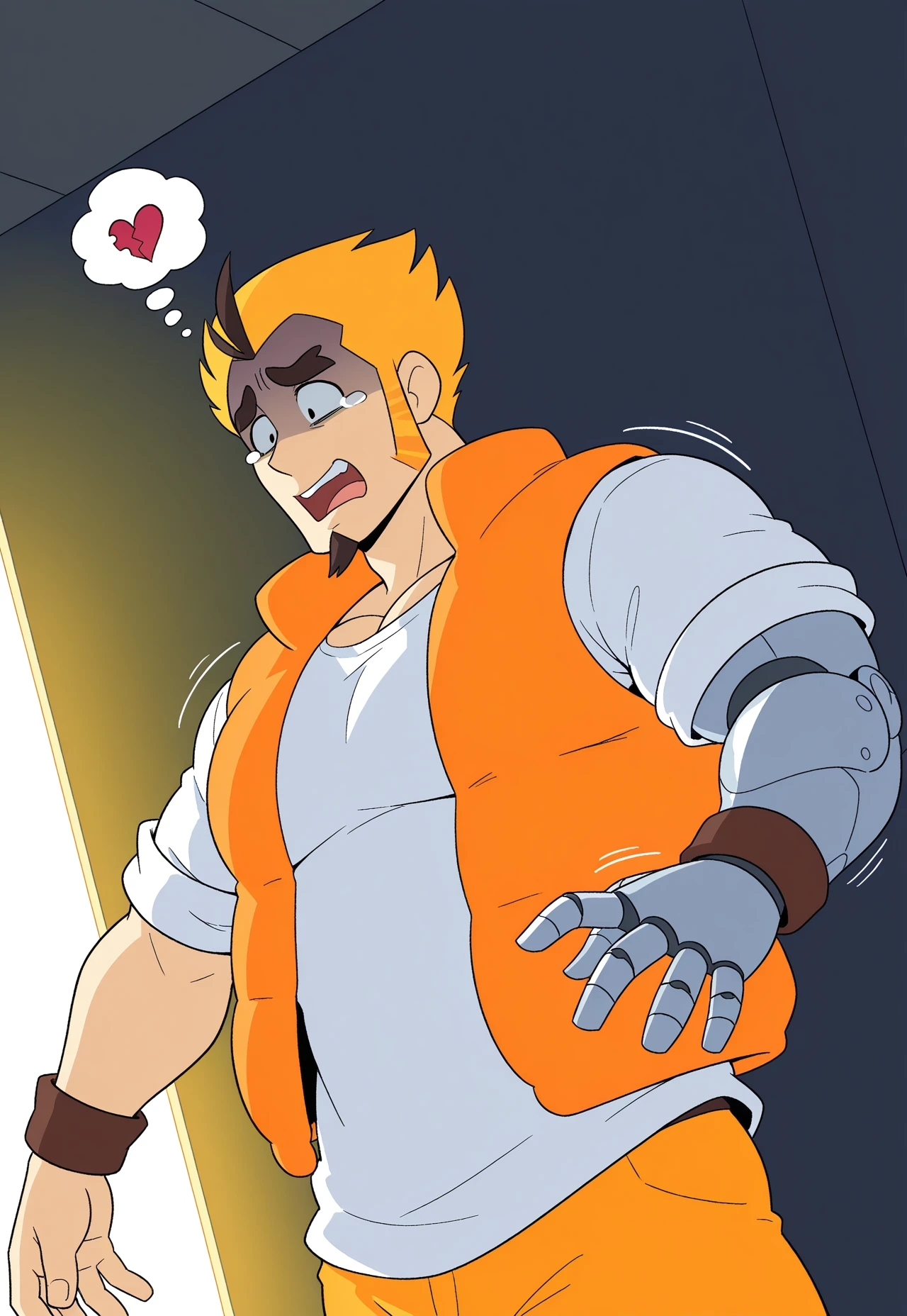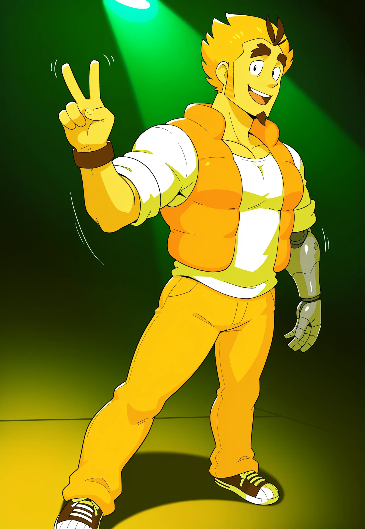 Arthur, male, brown eye color, bright yellow hair, A lock of black hair, thick eyebrows, stylized spiky and layered, facial hair, goatee, light gray mechanical arm, Clothes: