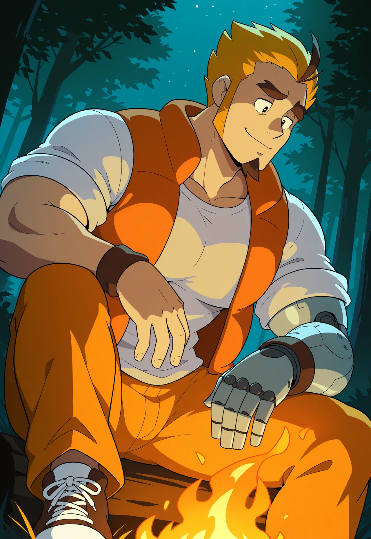 orange pants, brown wristbands, white T-shirt with the sleeves rolled up, sneakers, puffy orange vest,
