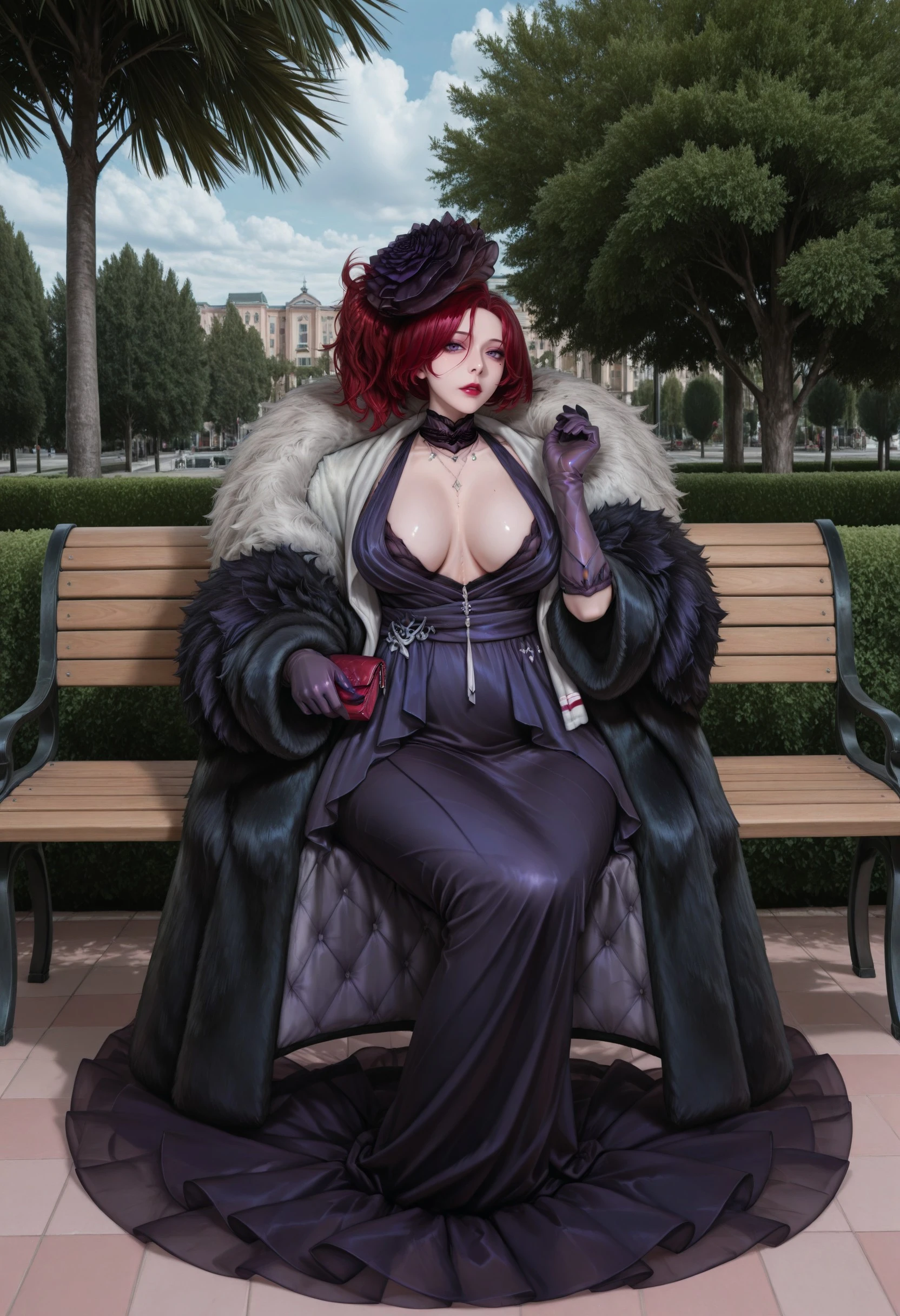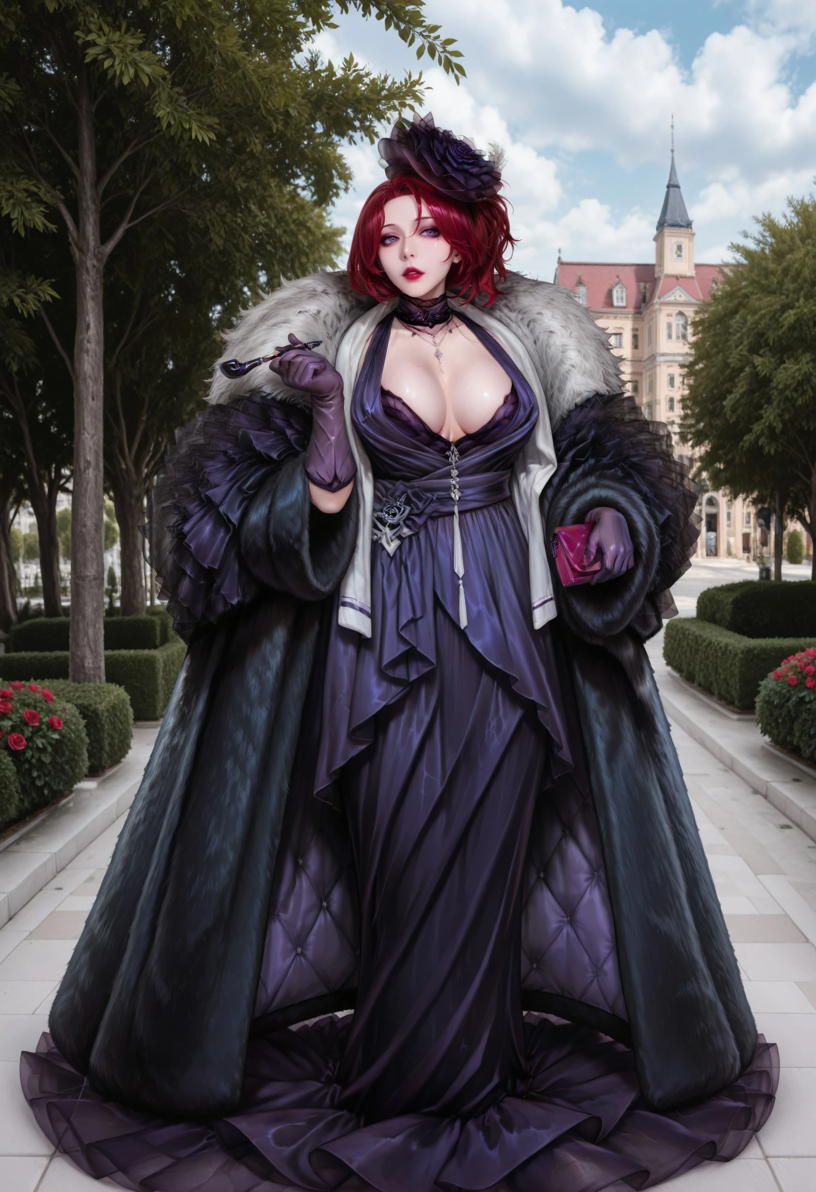 LemonadeDelta_(Last Origin), coat, dress, purple_gloves, breasts, gloves, fur_coat, cleavage, tachi-e, purple_dress, dress covering the floor, ultra-long dress, dark red hair, fur_trim, large_breasts, makeup, hat, lipstick, necklace, holding smoking pipe, mole, jewelry, purple_eyes, purple_gloves, coat, holding handbag, standing, flower, gloves, necklace,