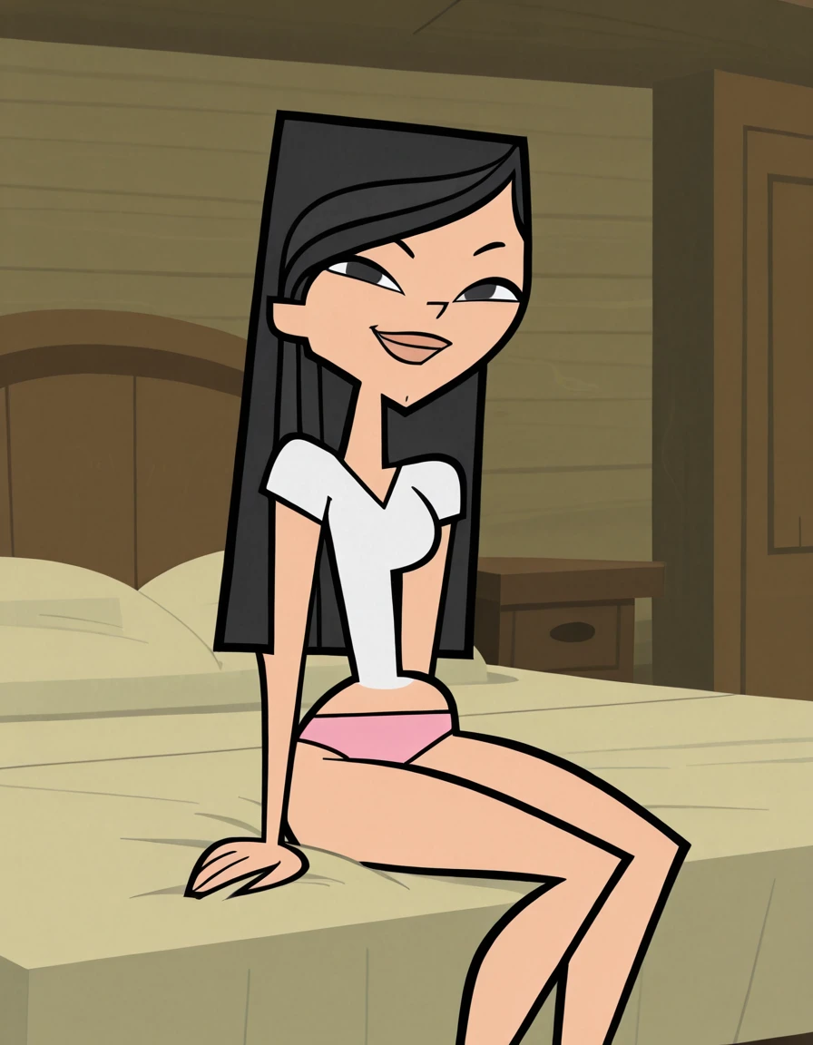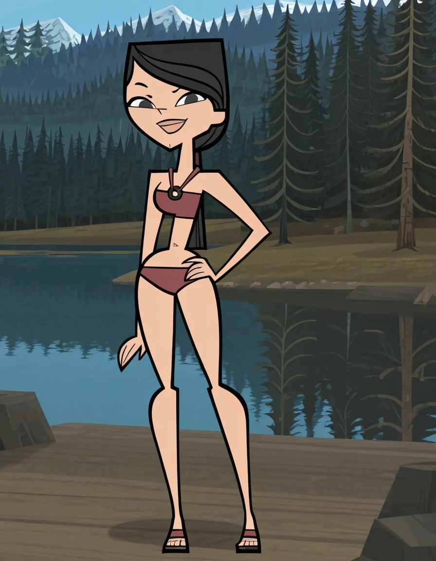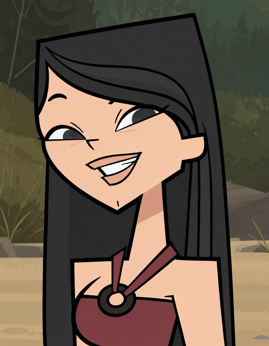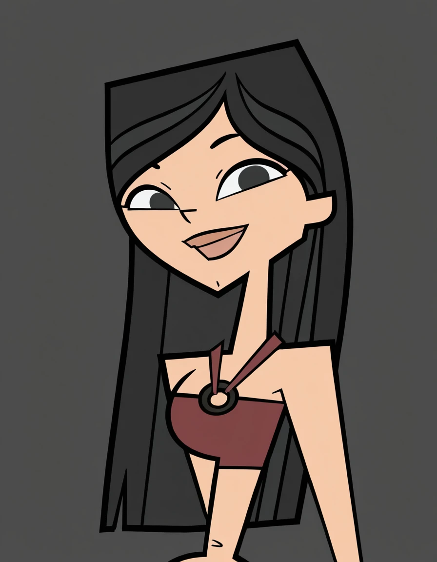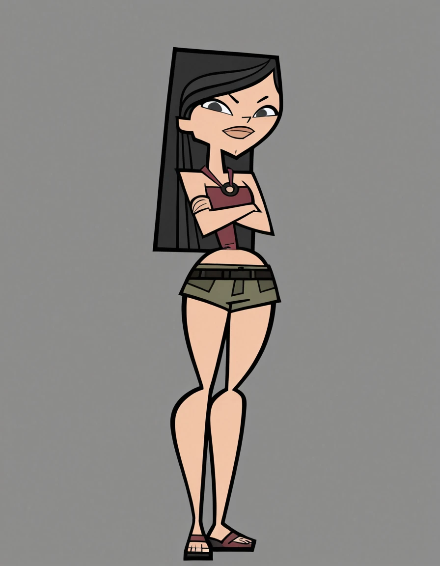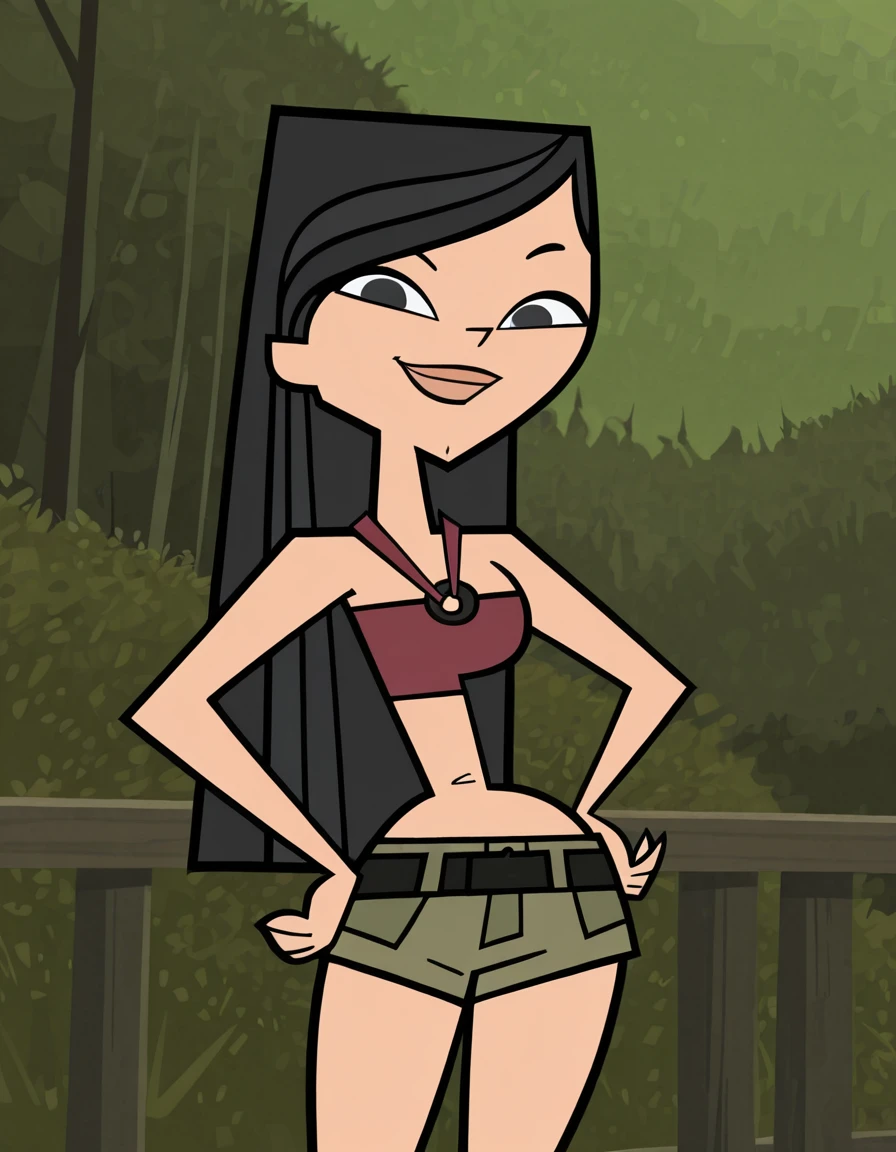 heathertd, black hair, long hair, 1girl, smile, solo, o-ring top, midriff, shorts, black eyes, breasts