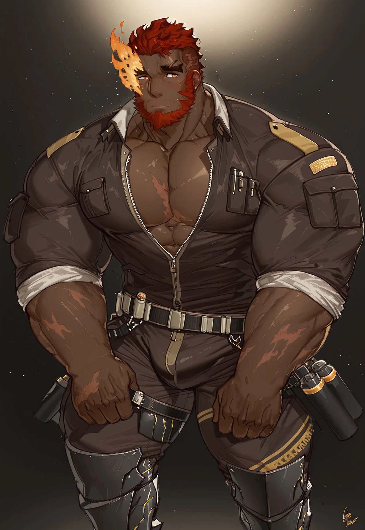 hephTAS, flaming eye, thick eyebrows, eyebrow cut, muscular male, muscular, mechanical legs, dark skin, dark-skinned male, facial hair, beard, scar, scars, body scars, scars all over, scar on face, scar on eyebrow, orange eyes, short hair, red hair, undercut,