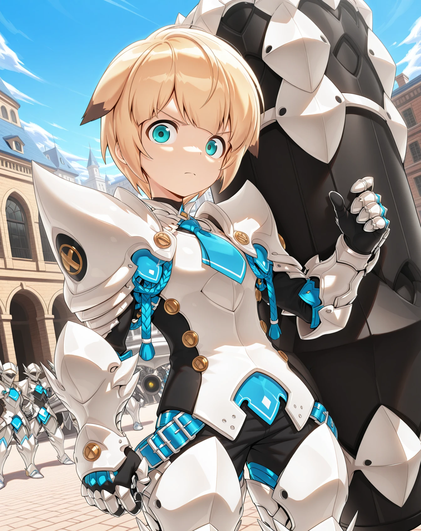 Outfit: shoulder armor, black gloves, white shorts, gauntlets, cape, pauldrons, white armor, armored boots, greaves, white footwear,