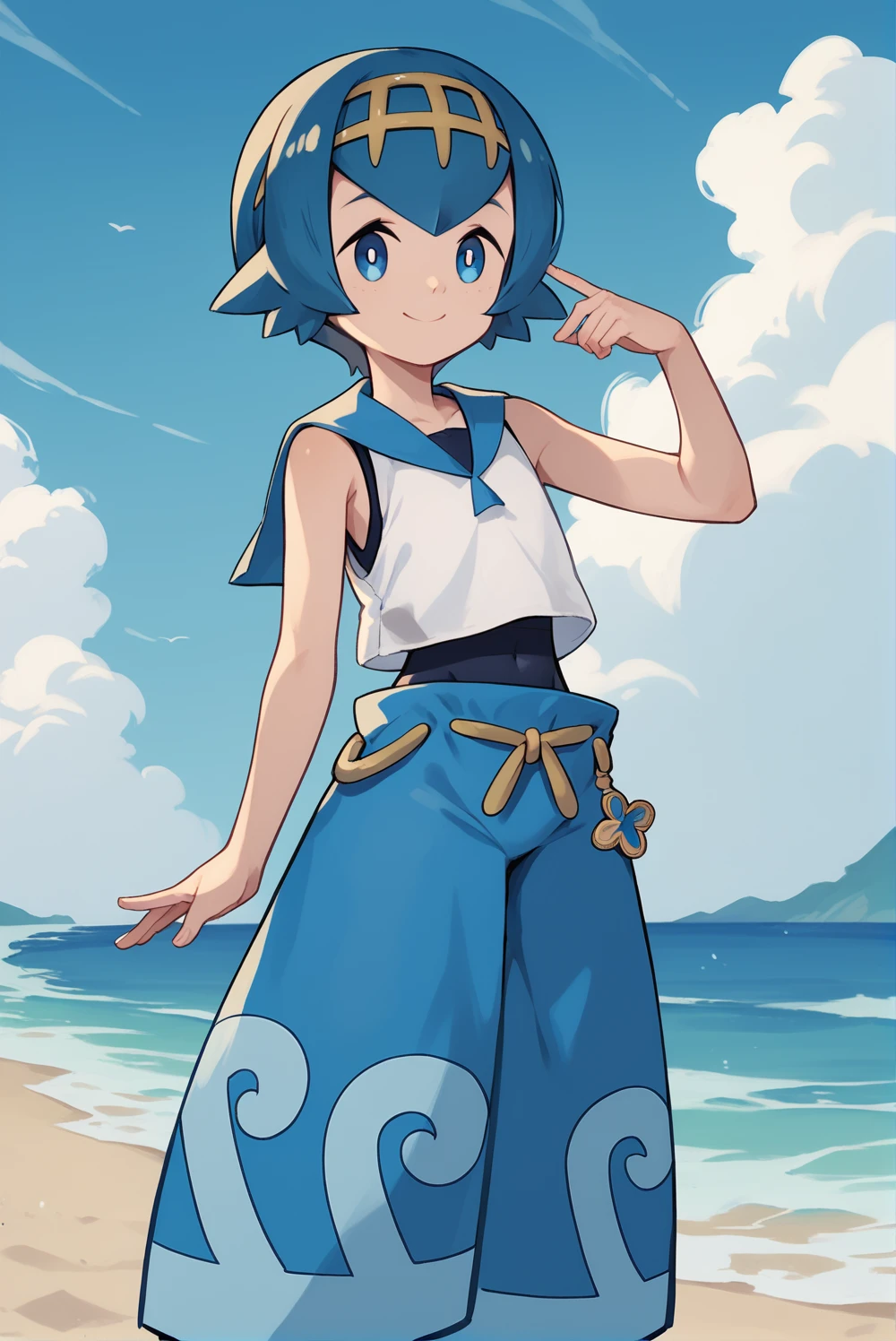 2default2, yellow hairband, swimsuit under clothes, blue swimsuit, white shirt, sleeveless shirt, baggy pants, blue pants, blue sailor collar, sandals, wave pattern pants