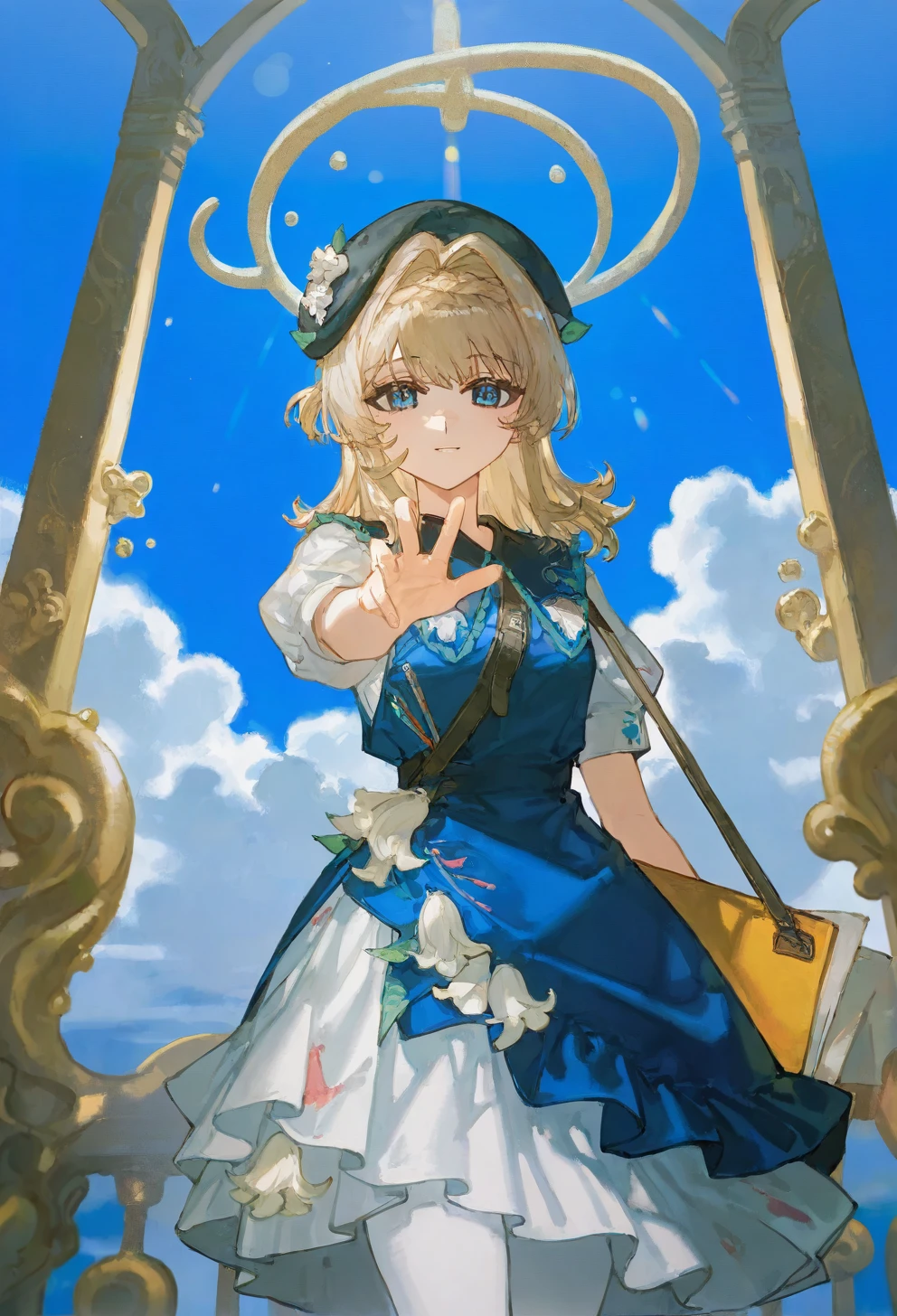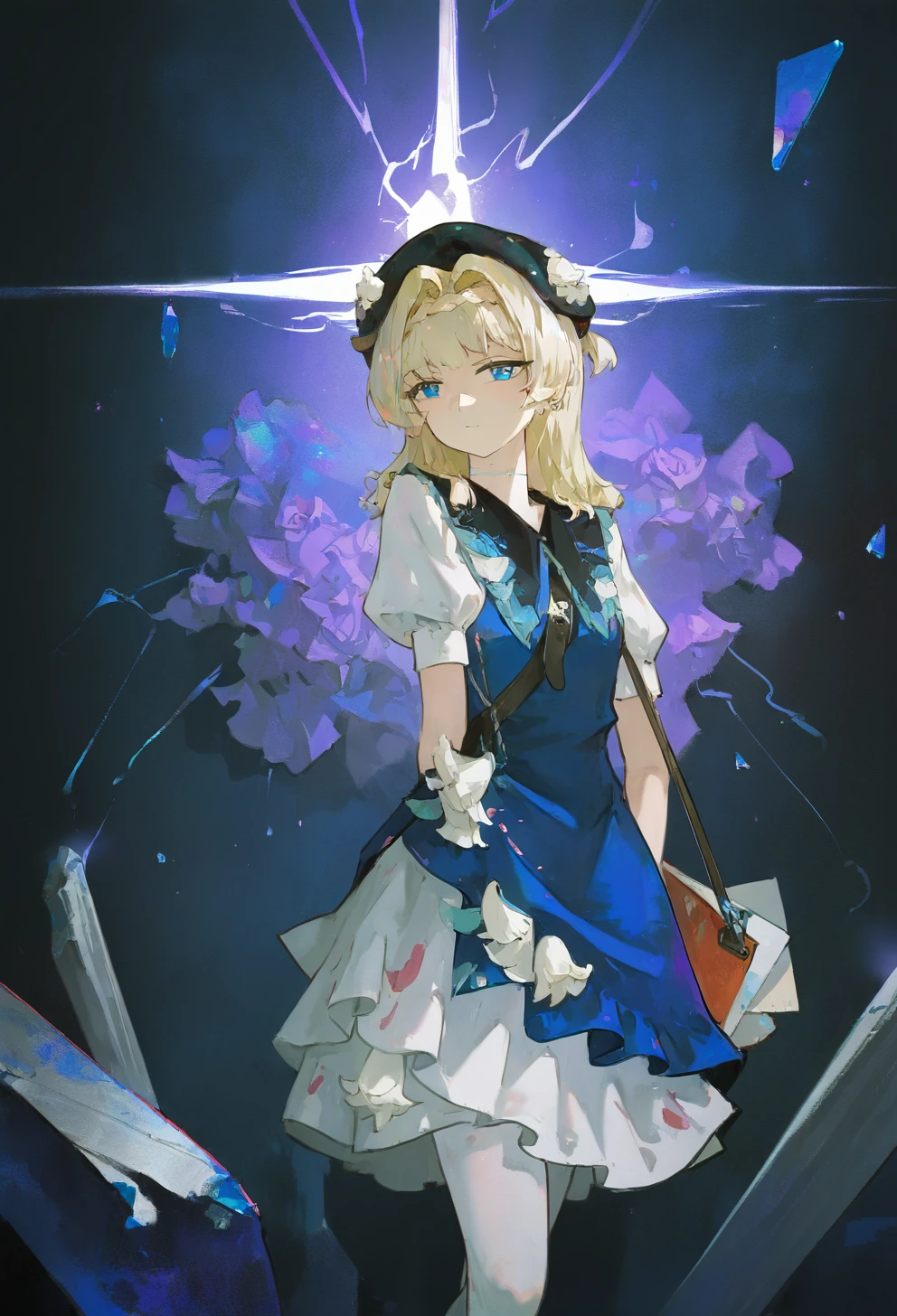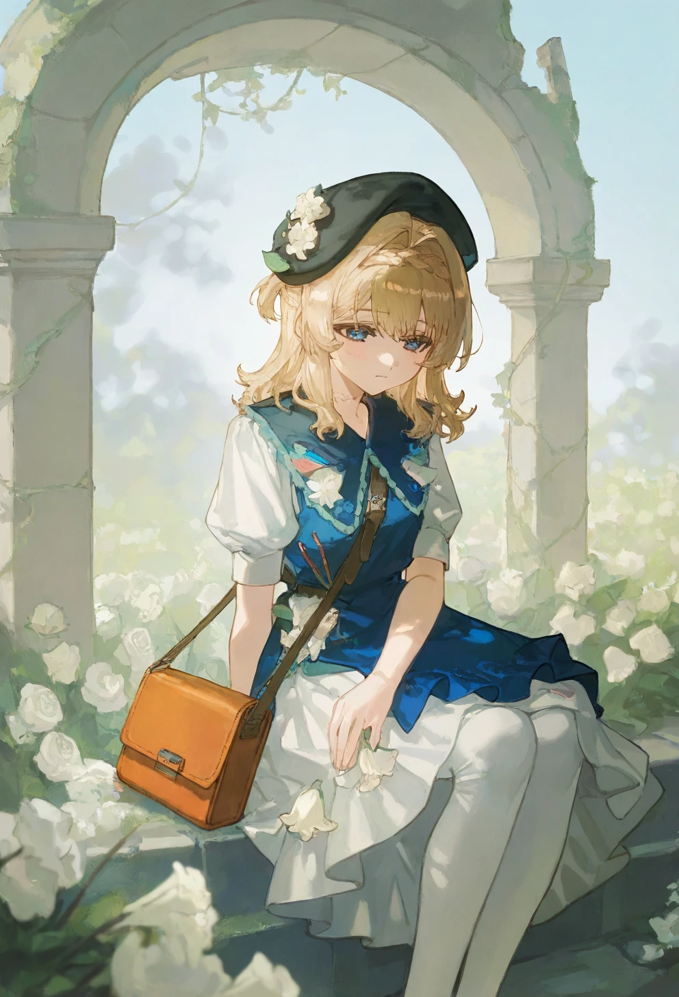 kphhpf, 1girl, solo, blonde hair, medium hair, hair intakes, braid, blue eyes, black beret, black headwear, hat flower, white flower, hair ornament, blue dress, white dress, shoulder bag, white pantyhose, black footwearLora仅发布在civitai未经授权禁止转载