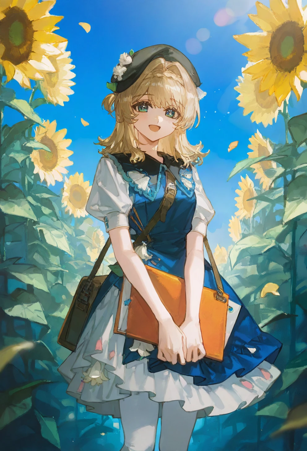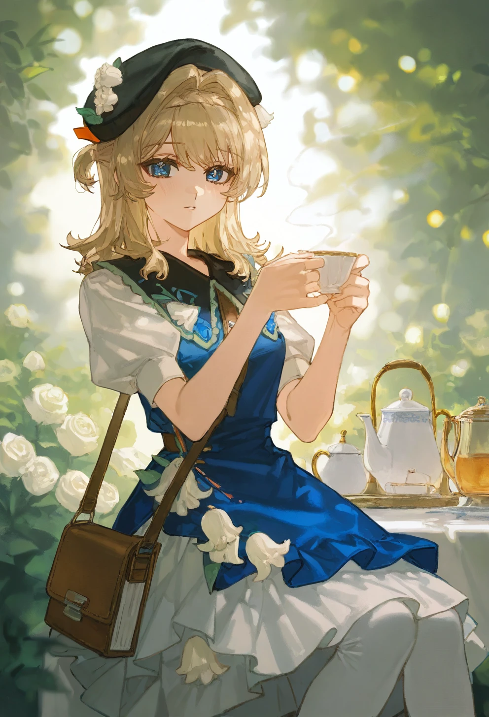 kphhpf, 1girl, solo, blonde hair, medium hair, hair intakes, braid, blue eyes, black beret, black headwear, hat flower, white flower, hair ornament, blue dress, white dress, shoulder bag, white pantyhose, black footwear