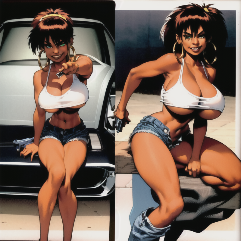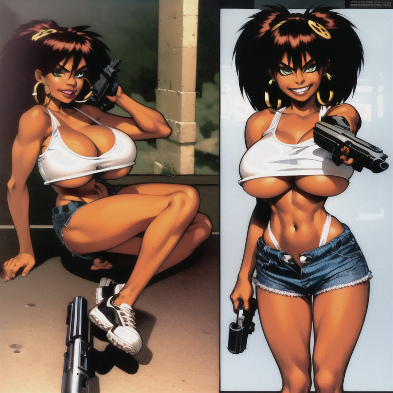 Use "PandaD" or physically descriptive tags to the prompt for better accuracy (examples: "red hair, dark skin, green eyes, huge breasts, two tone hair, hoop earrings, etc")