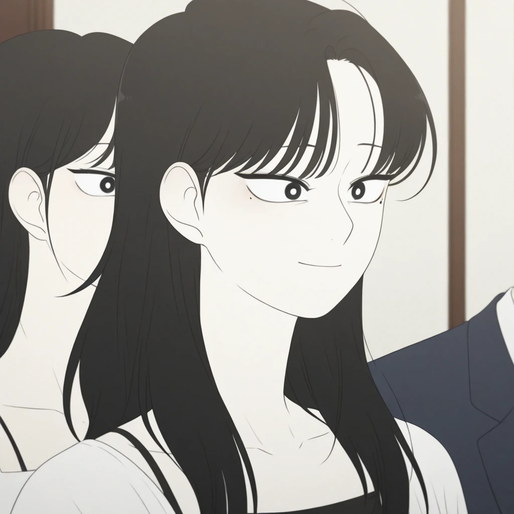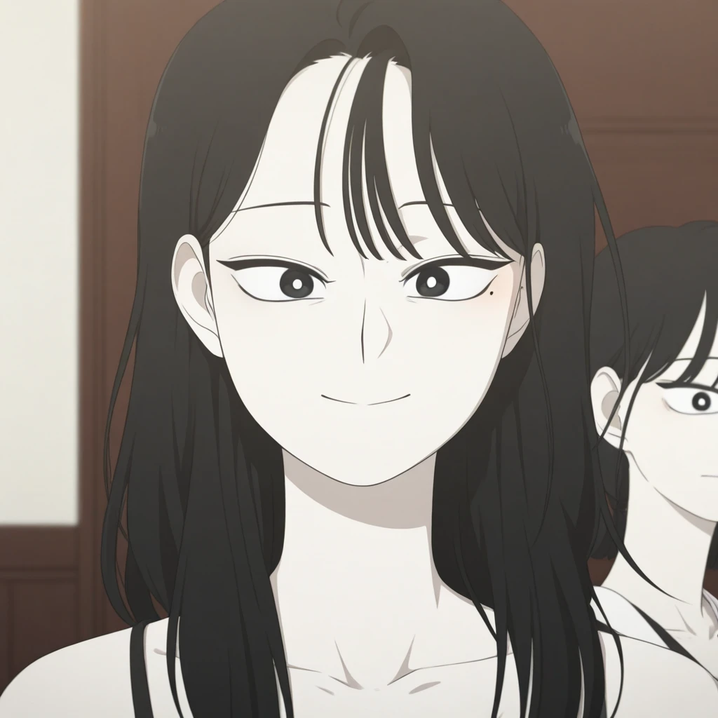 mature female, 25 year old, 1girl, detailed face, round pupils, black eyes, white pupils, mole under eye, thick outlines