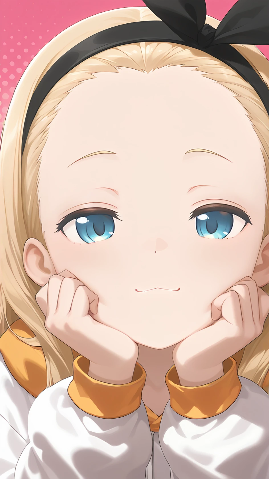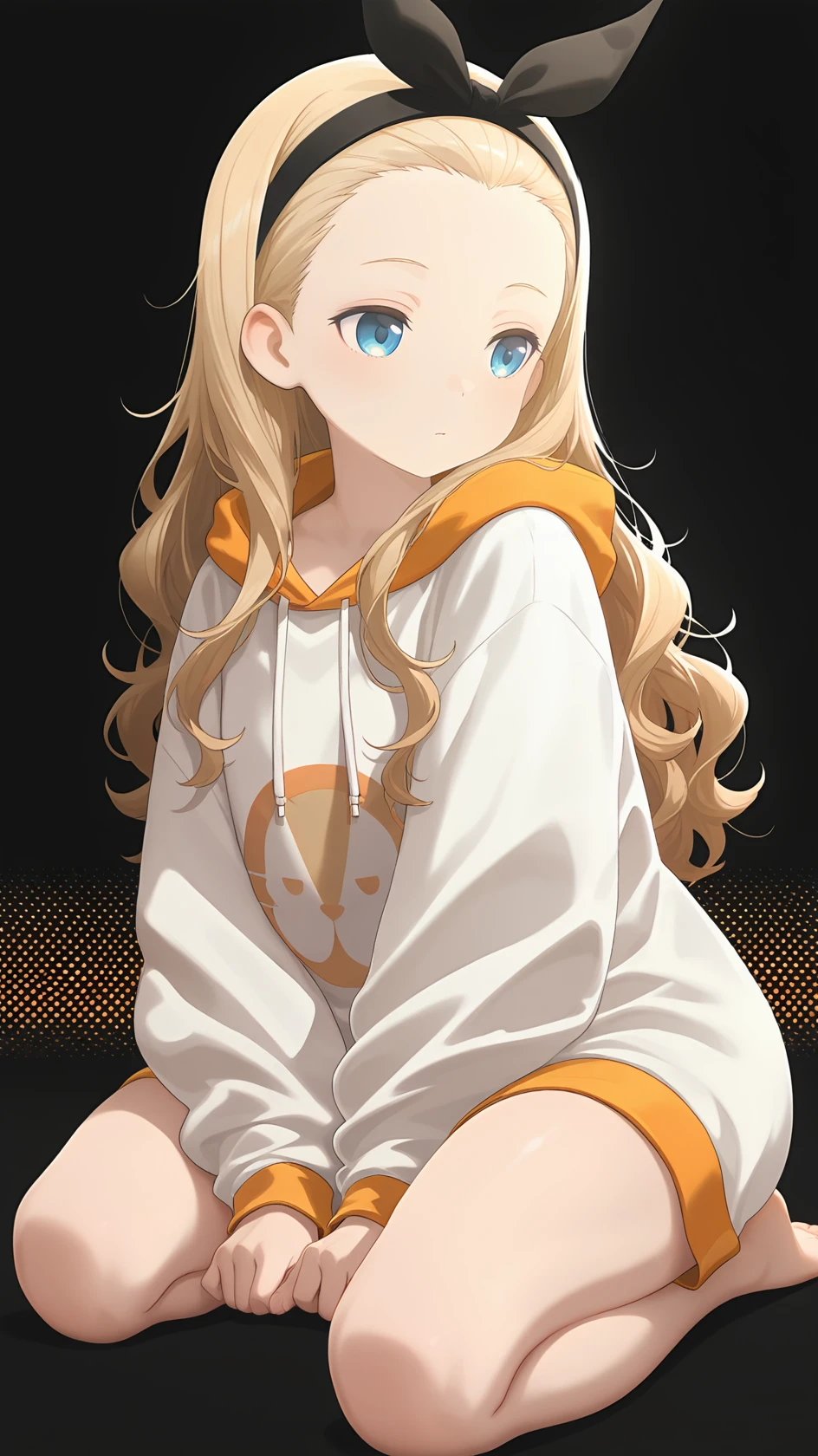 long hair, blue eyes, blonde hair, forehead, black ribbon, black hairband, long sleeves, collarbone, barefoot, hood, sleeves past wrists, legs, hoodie, white hoodie,